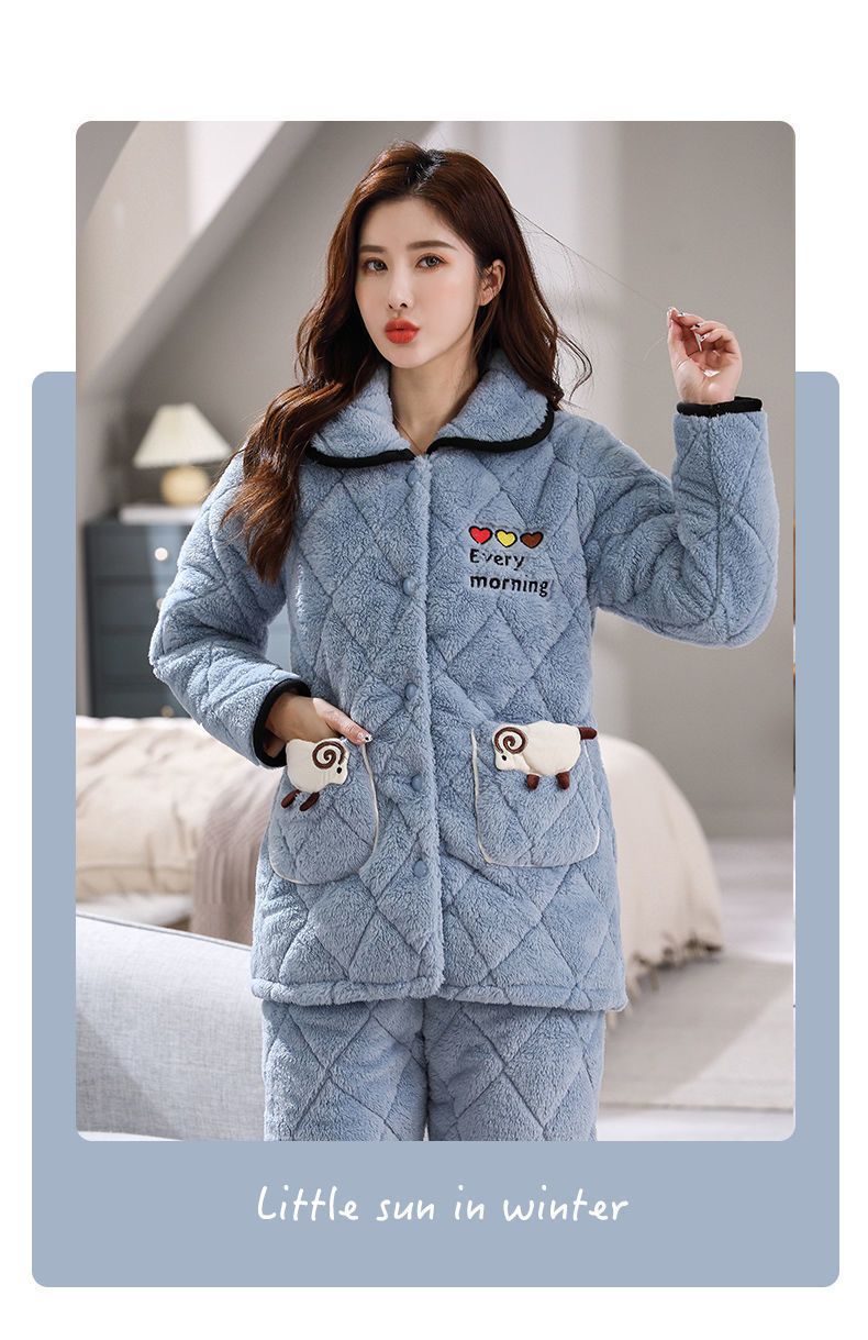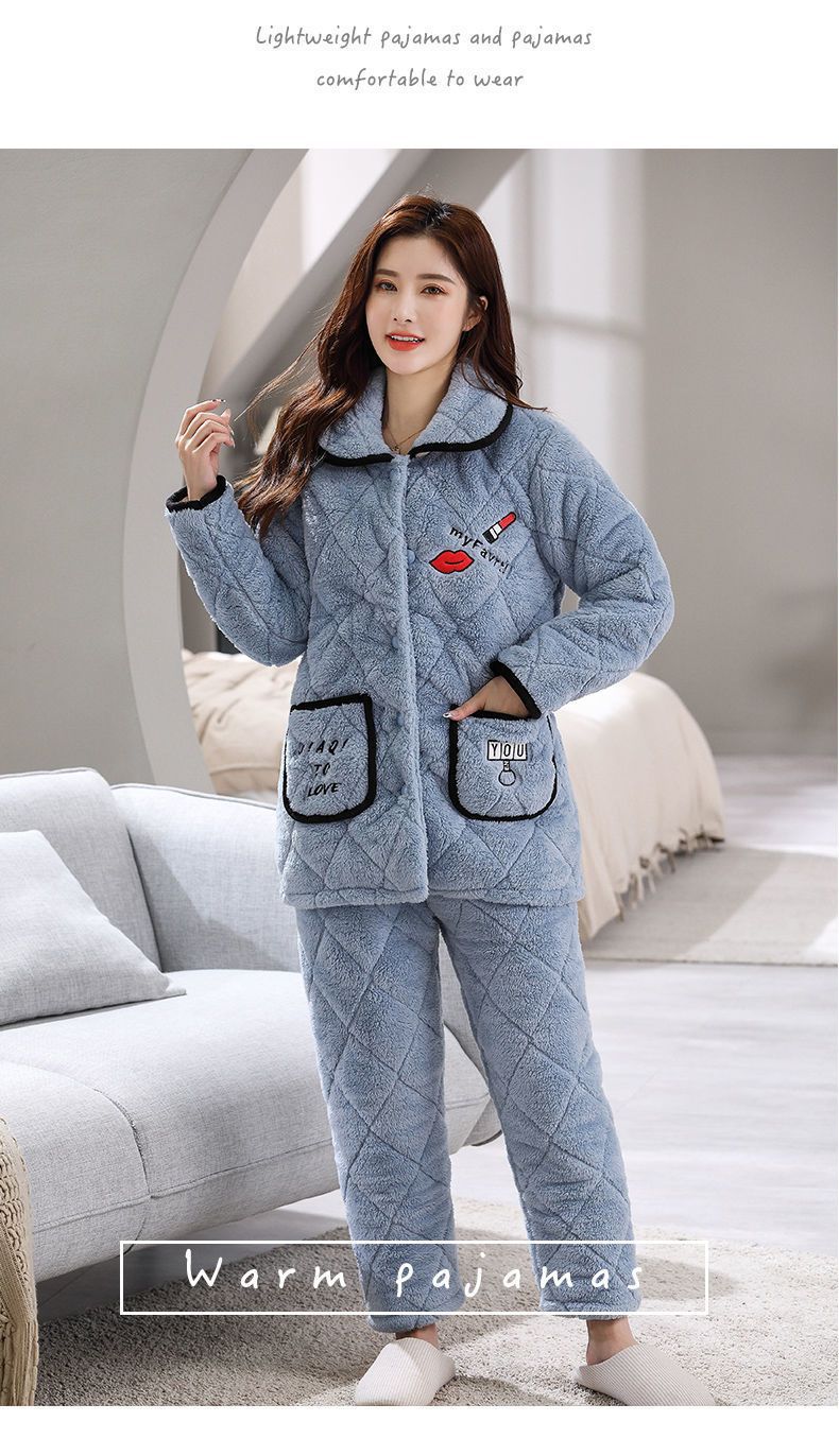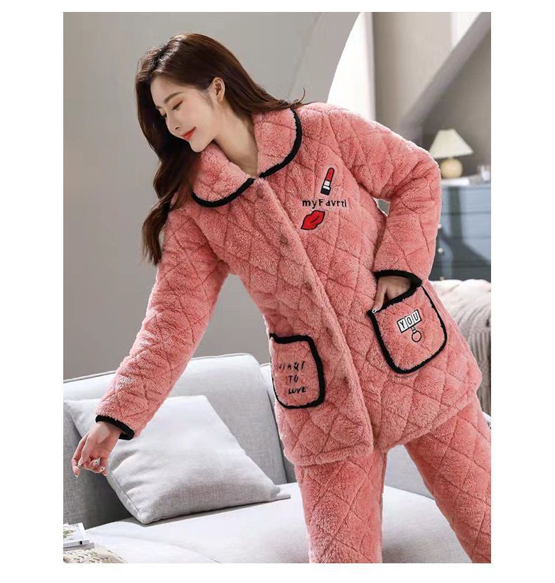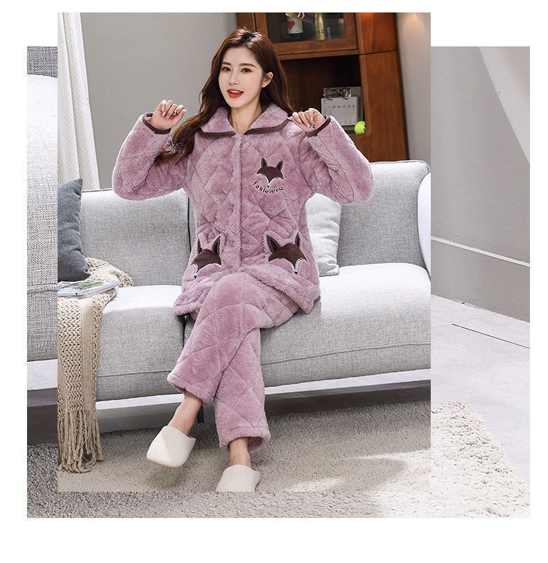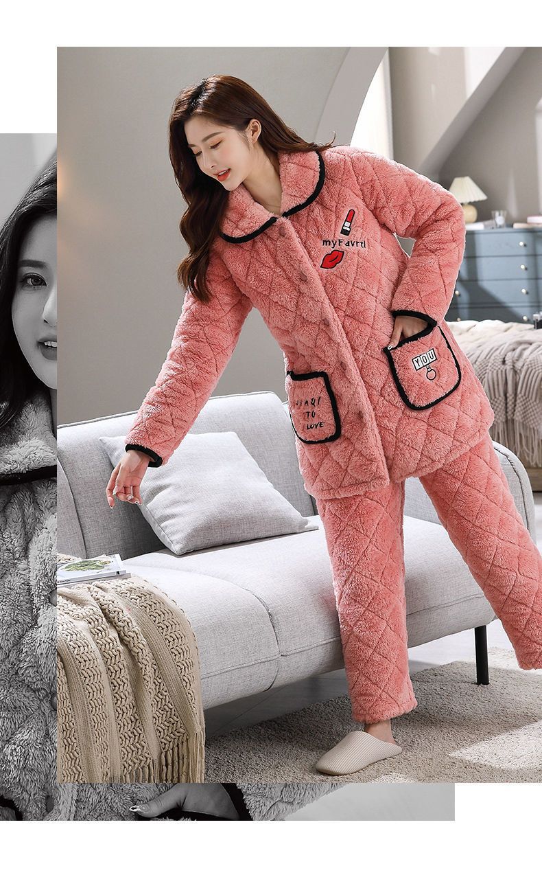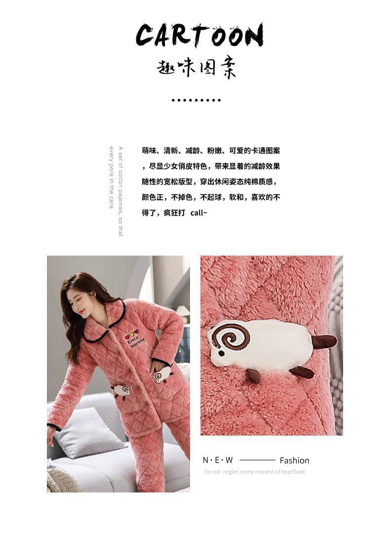 잠옷 여자의 가을과 겨울 3 층 면 두꺼운 기모 따뜻한 달콤한 슈퍼 두꺼운 산호 양털 면 패딩 코트 가정 옷 세트