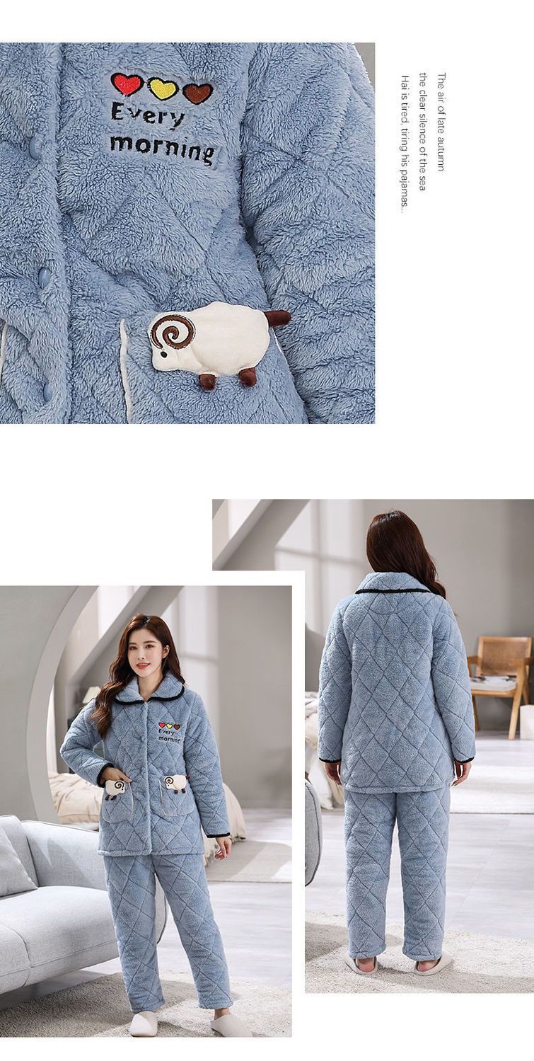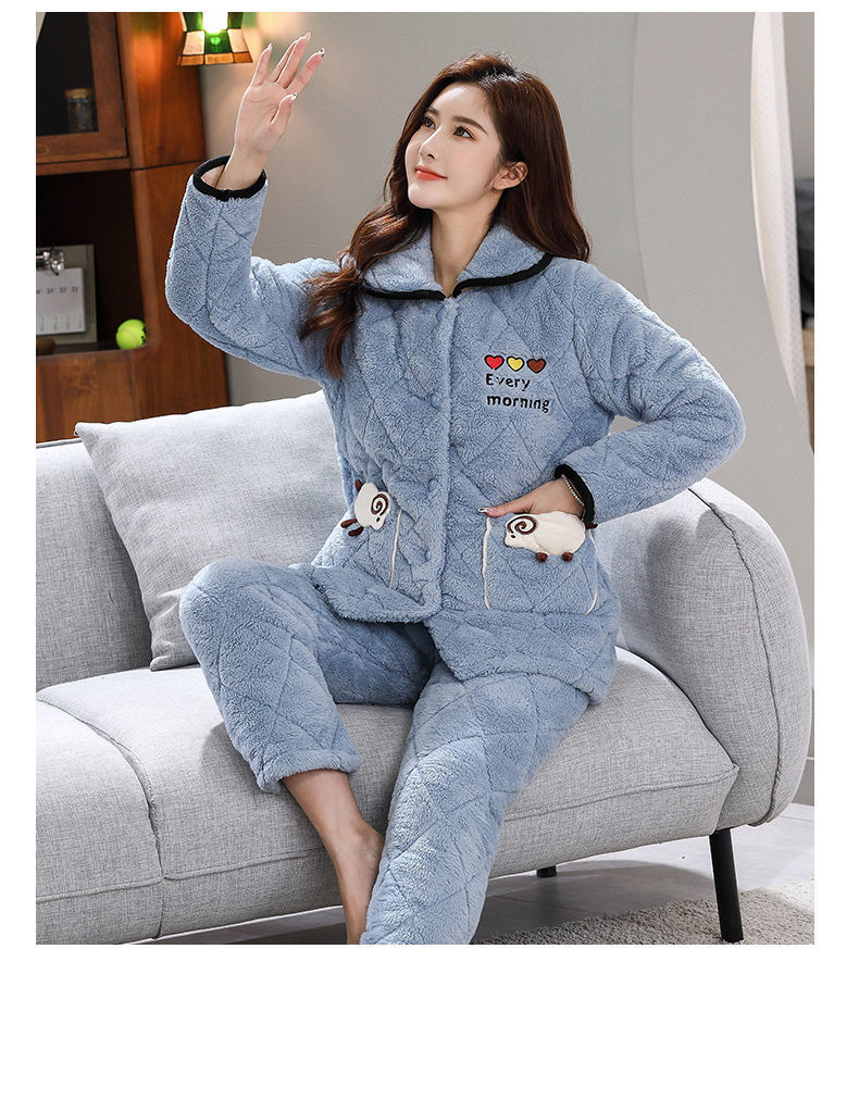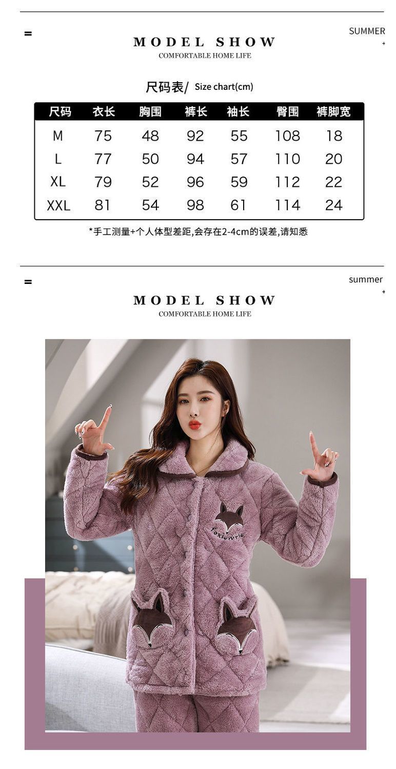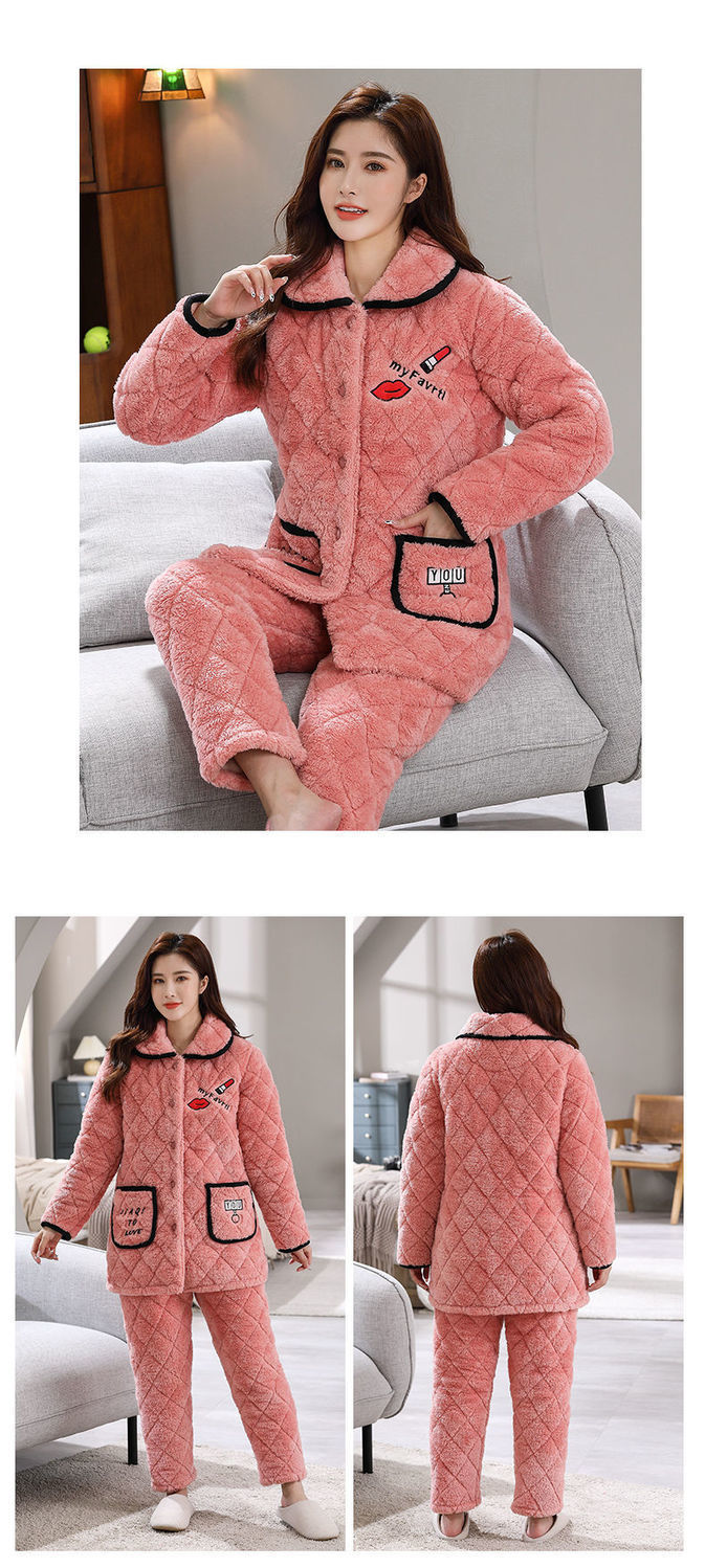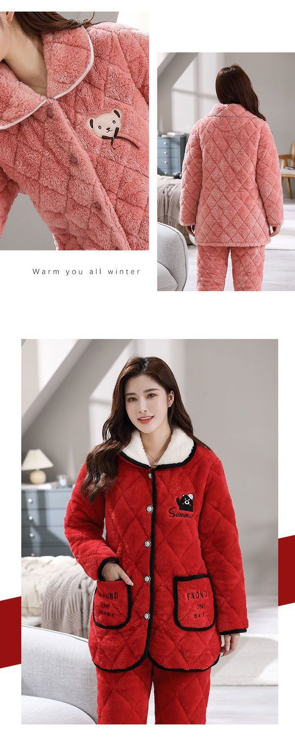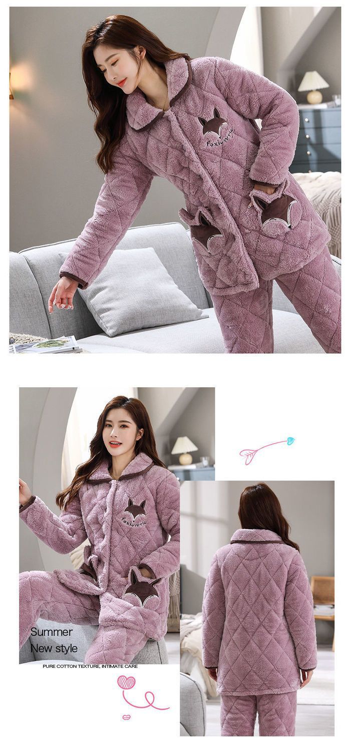 잠옷 여자의 가을과 겨울 3 층 면 두꺼운 기모 따뜻한 달콤한 슈퍼 두꺼운 산호 양털 면 패딩 코트 가정 옷 세트