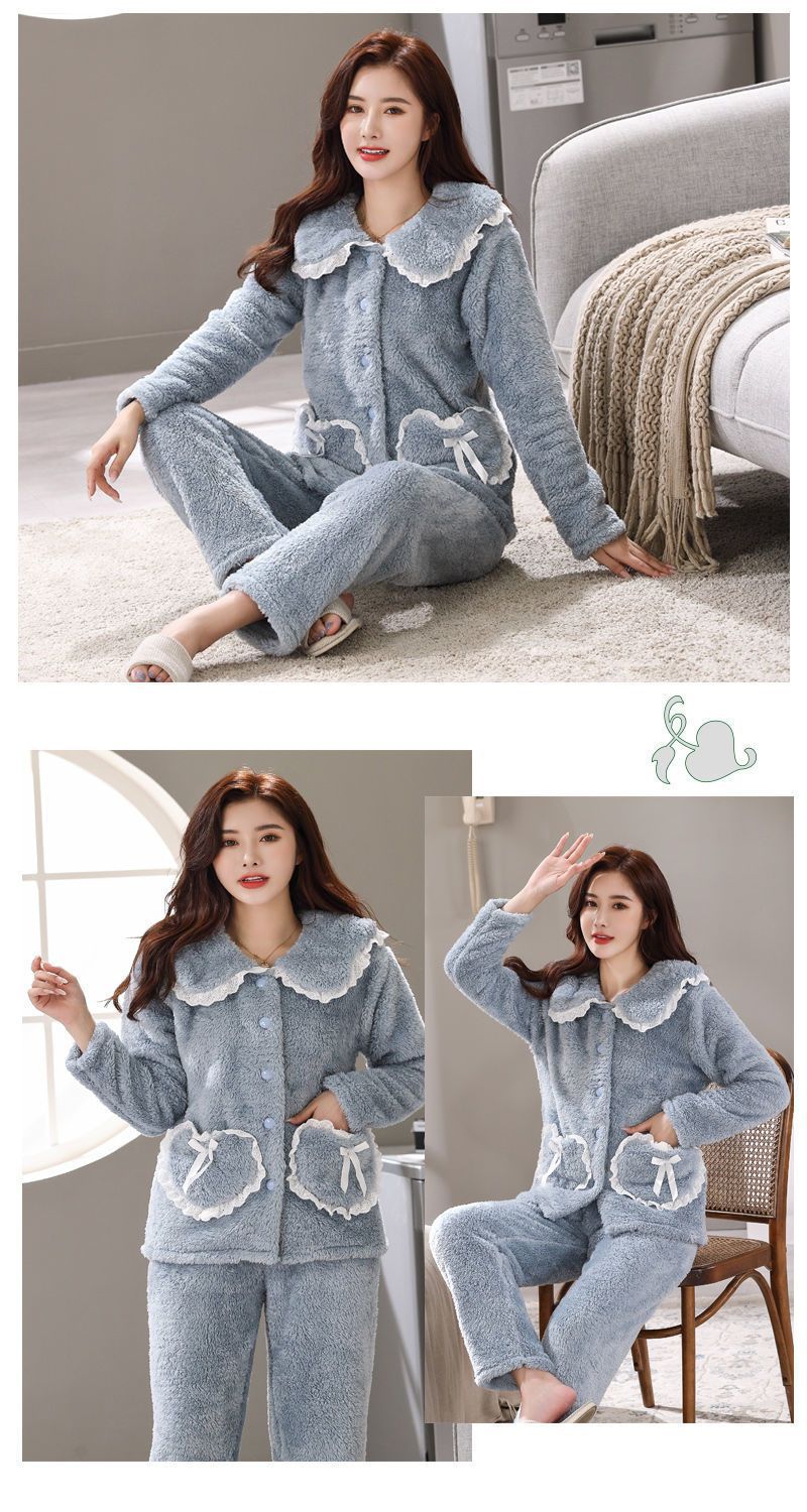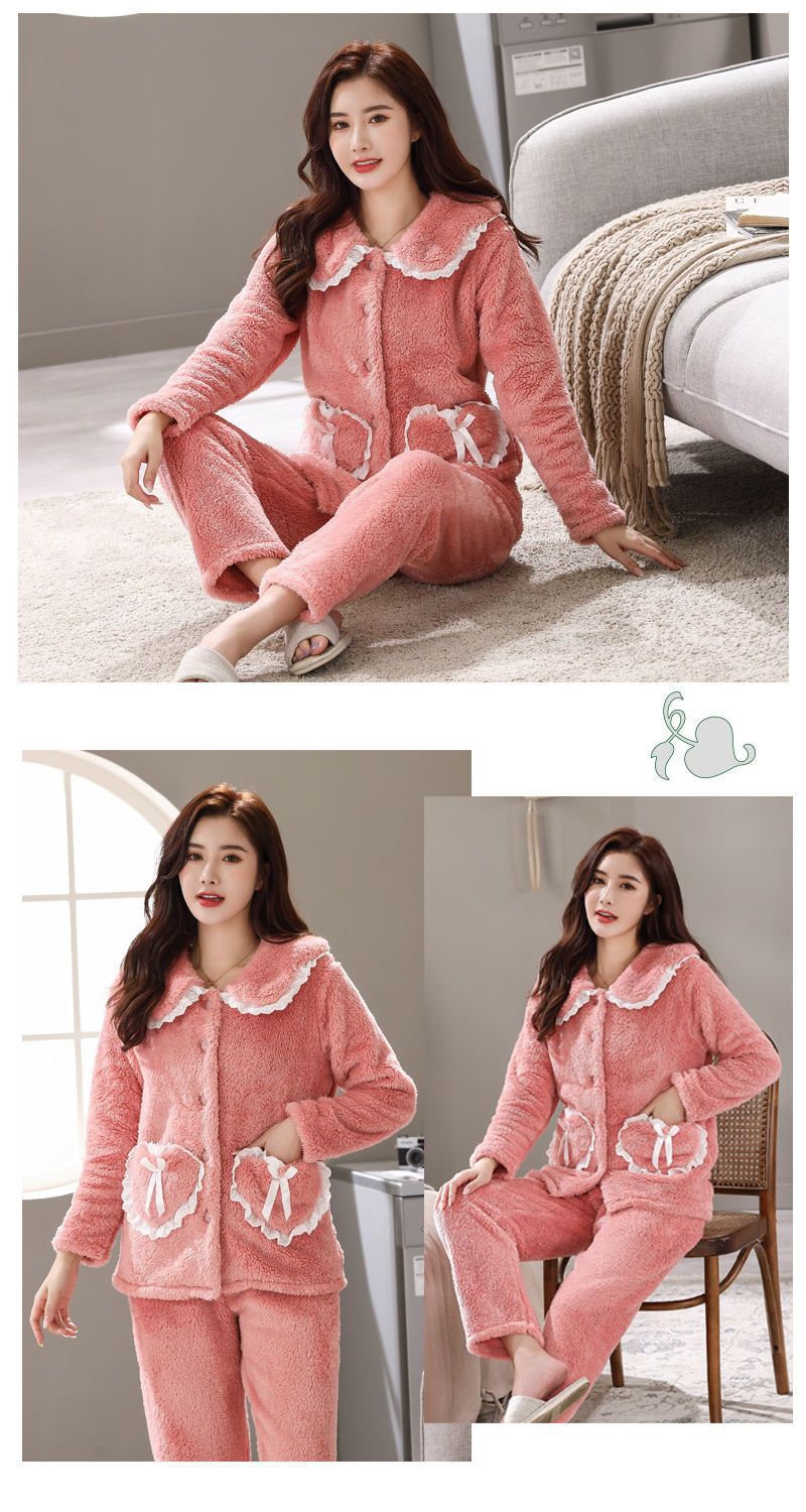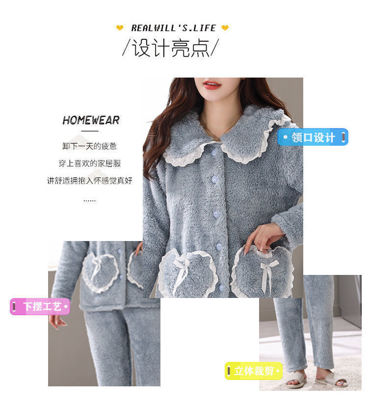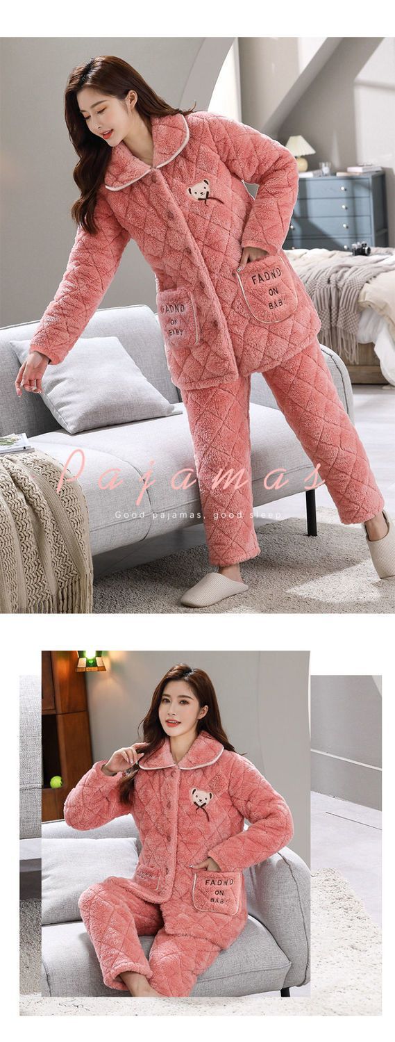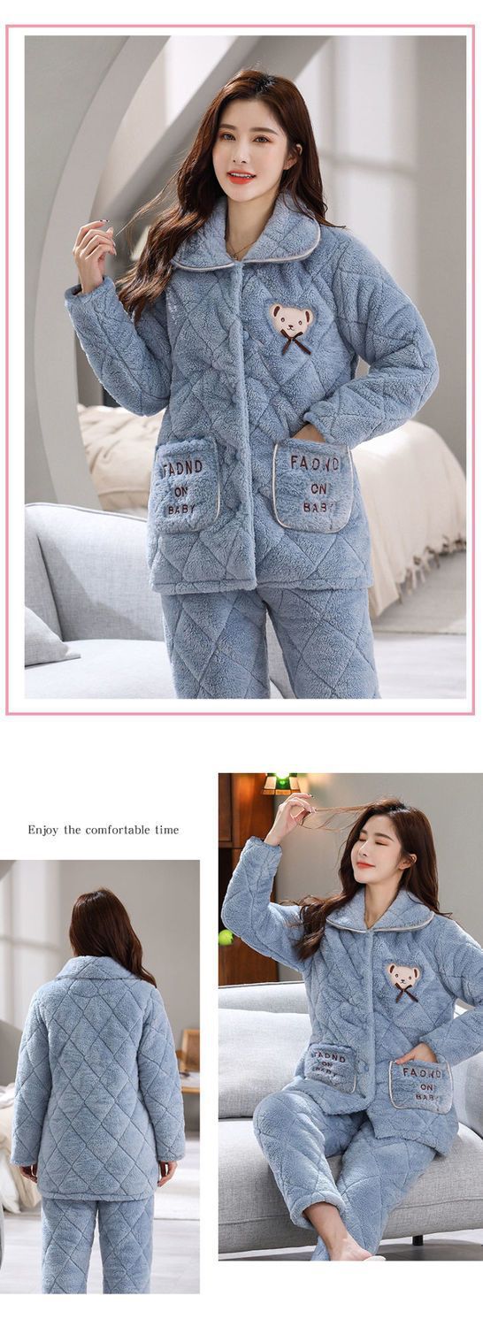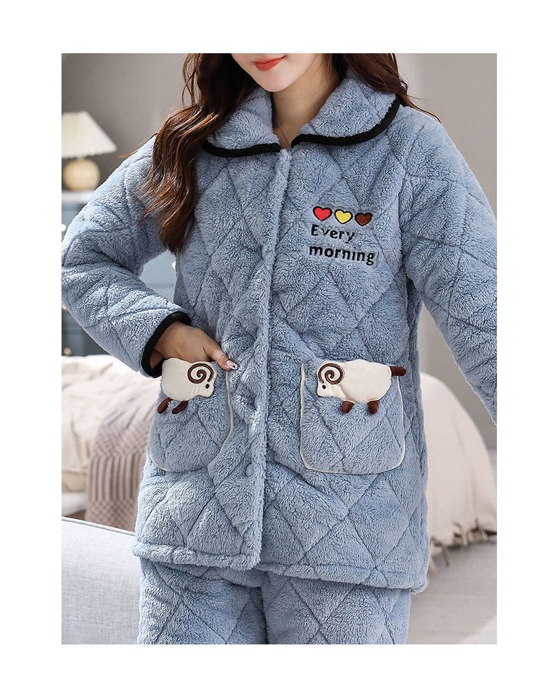 잠옷 여자의 가을과 겨울 3 층 면 두꺼운 기모 따뜻한 달콤한 슈퍼 두꺼운 산호 양털 면 패딩 코트 가정 옷 세트