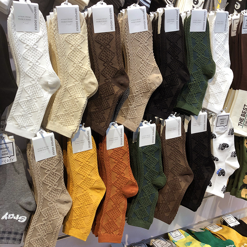 한국 EMPOLE 가을과 겨울 새로운 면 양말 3 차원 양각 다이아몬드 모양의 격자 여성용 양말 단색 모든 일치 빈티지 미드 튜브 양말스토어 가기