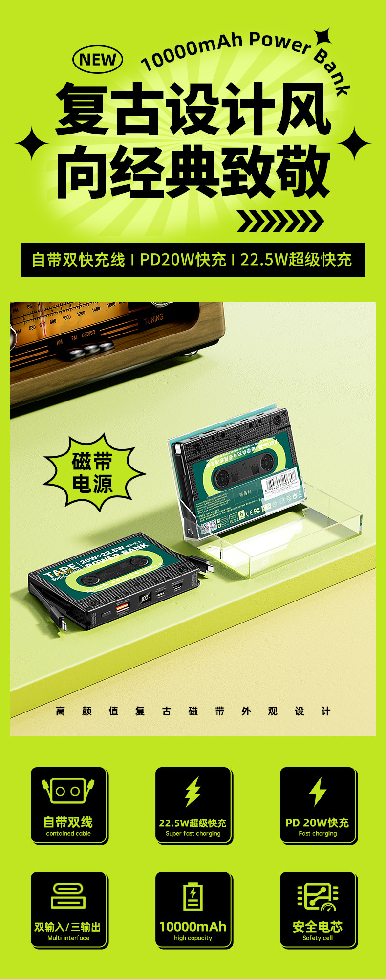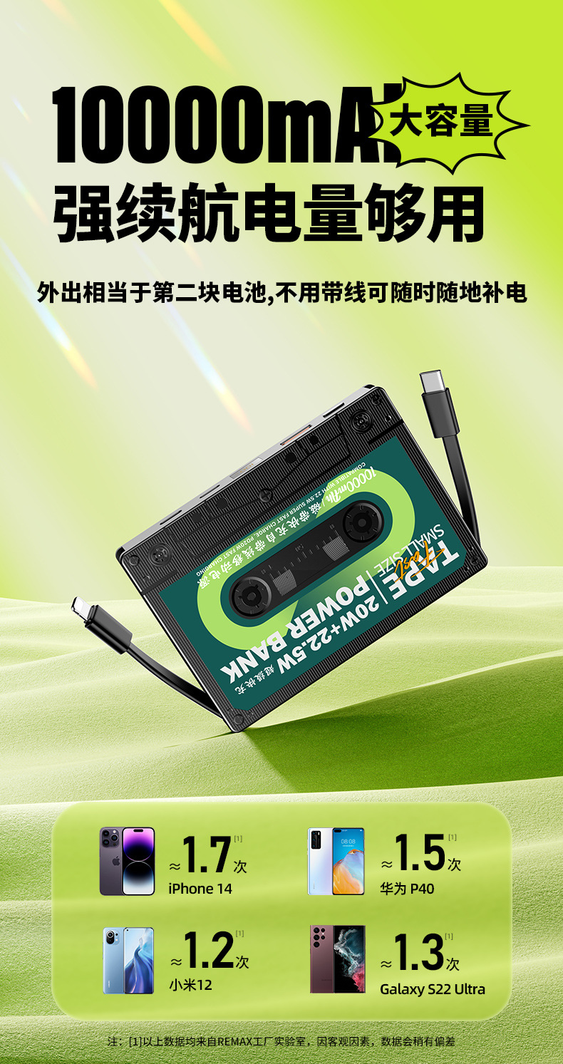 리맥스 레트로 스타일 테이프 모양 보조배터리 내장 케이블 10000mAh 고속 충전 모바일 파워뱅크 3C 보조배터리 맞춤 제작스토어 가기