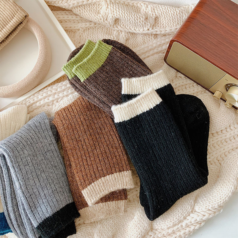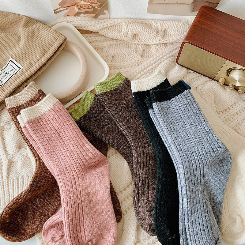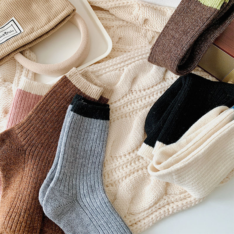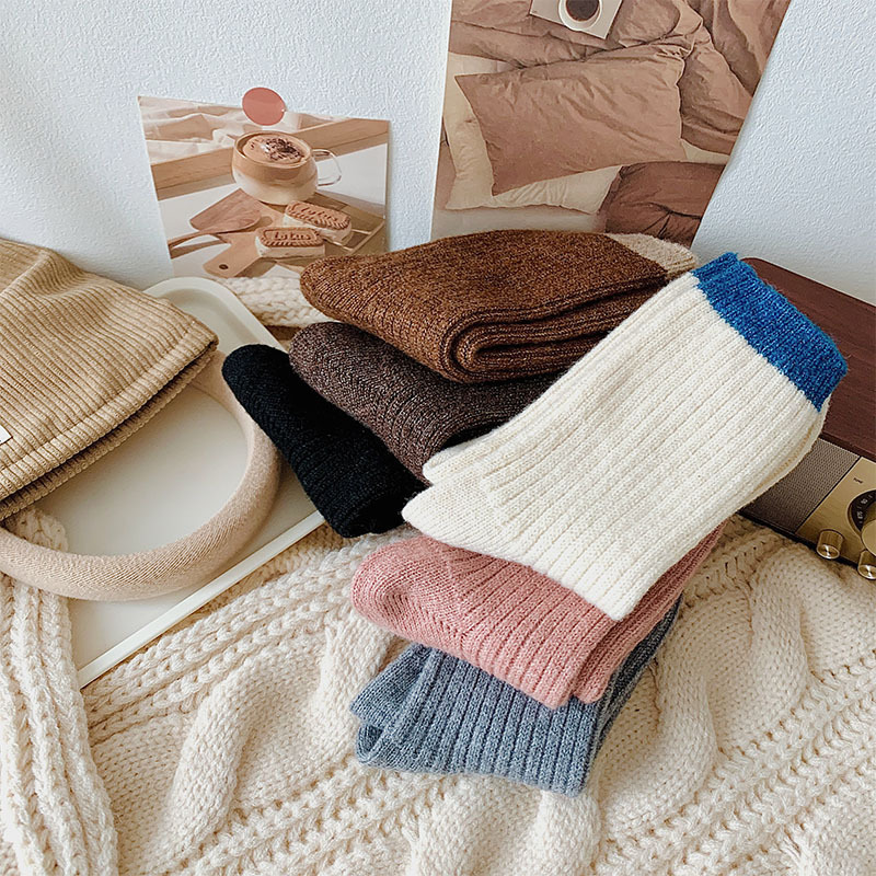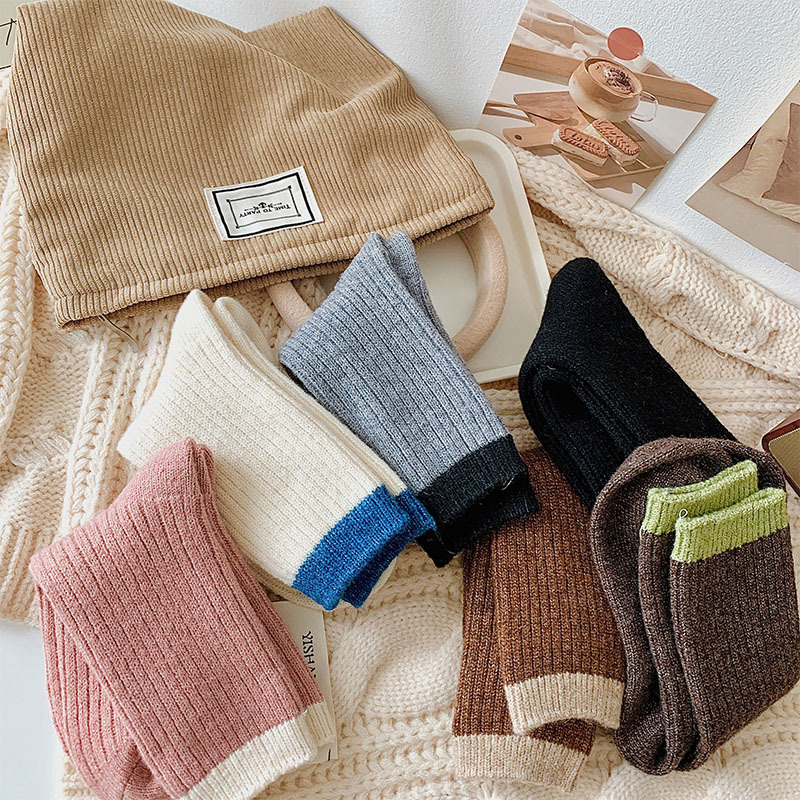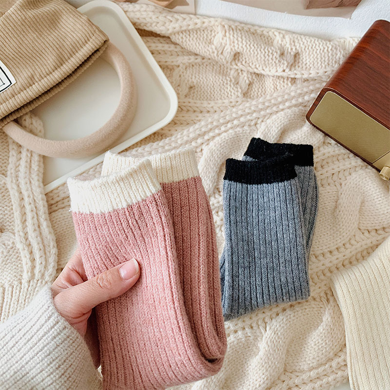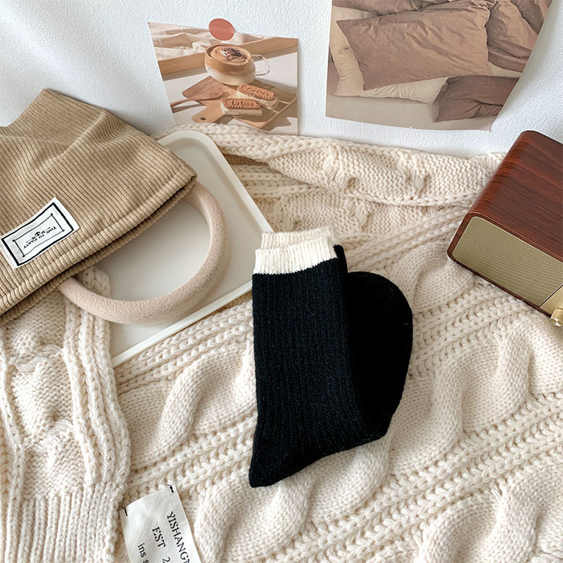 간단한 세로 패턴 아카데믹 스타일 두꺼운 중간 길이 양말 검은 색과 회색 색상 일치 양모 양말 겨울 부드럽고 따뜻한 겉옷 스택