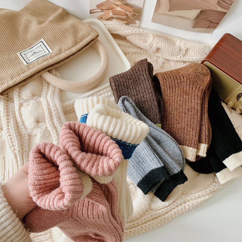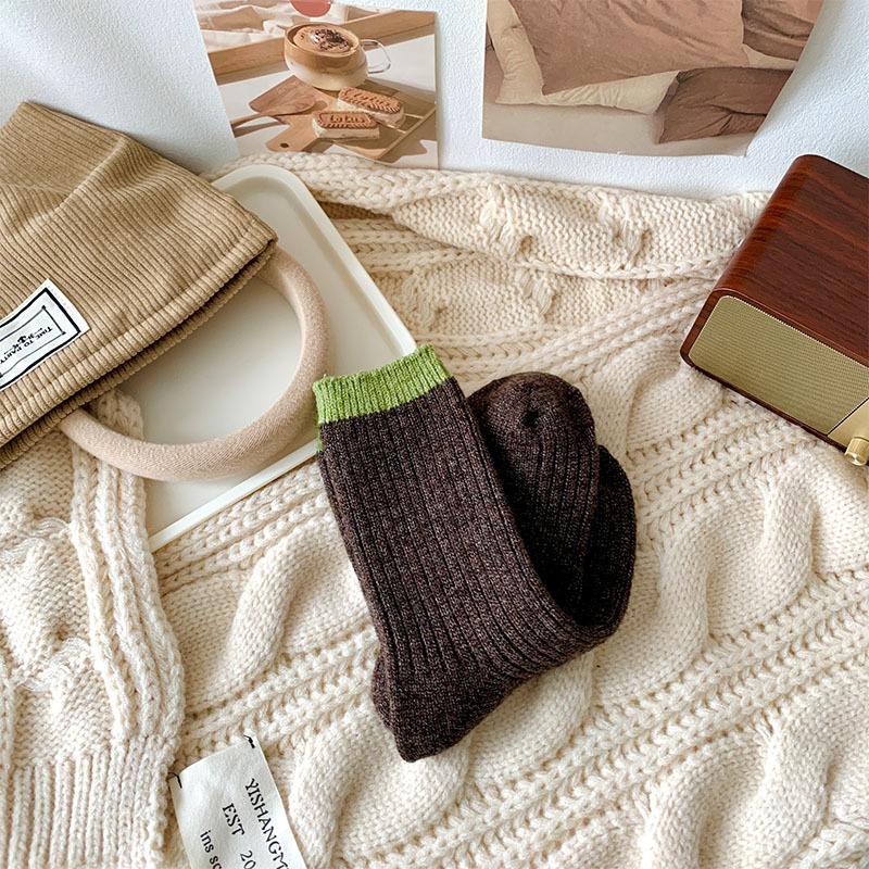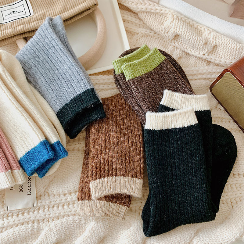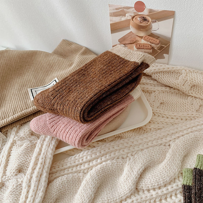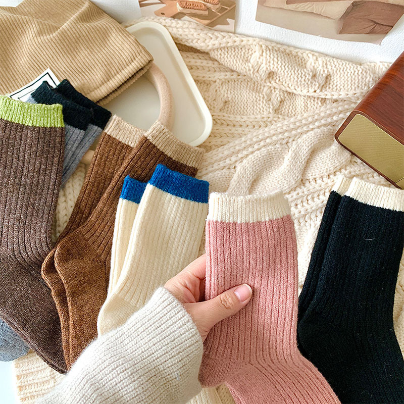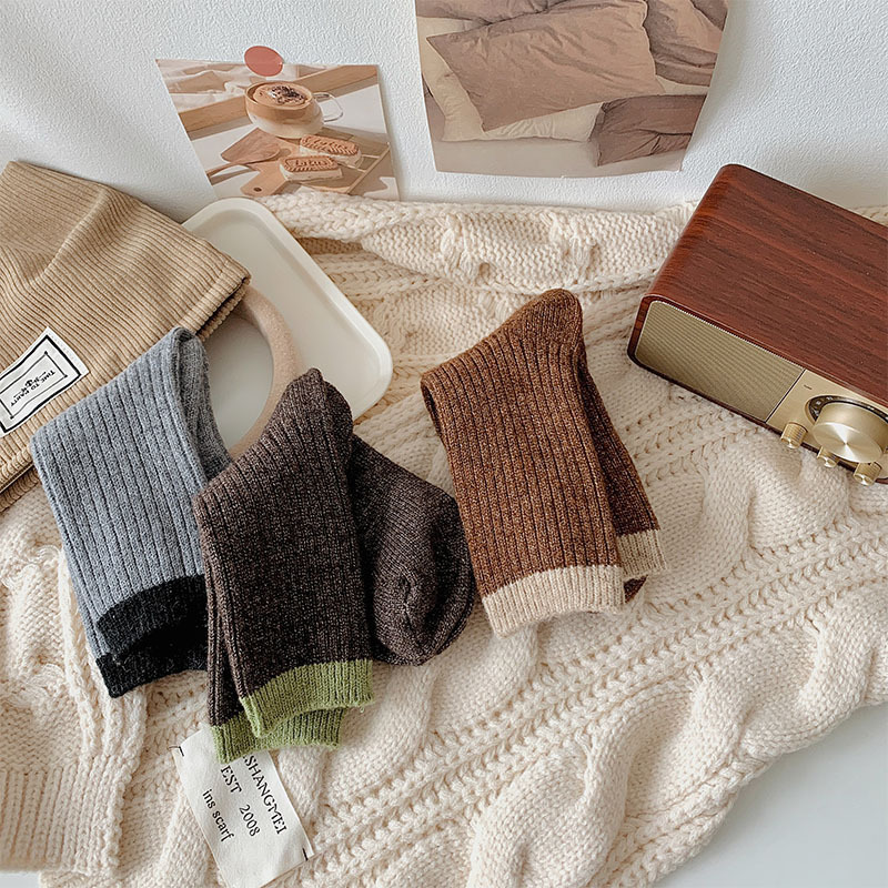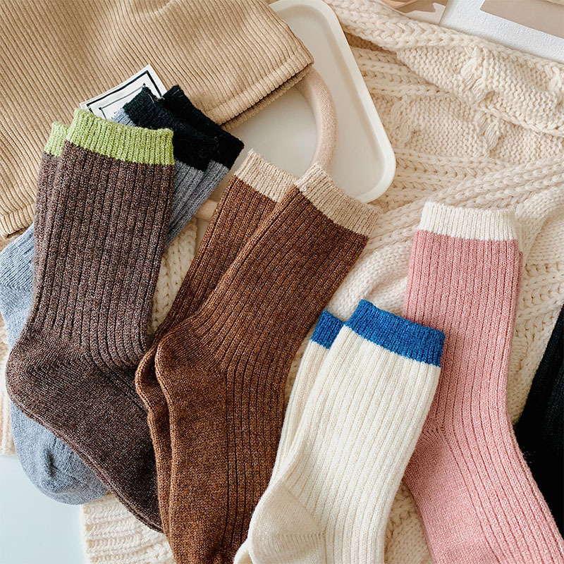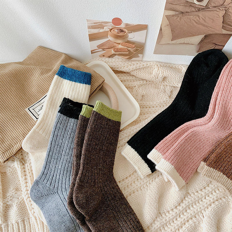 간단한 세로 패턴 아카데믹 스타일 두꺼운 중간 길이 양말 검은 색과 회색 색상 일치 양모 양말 겨울 부드럽고 따뜻한 겉옷 스택