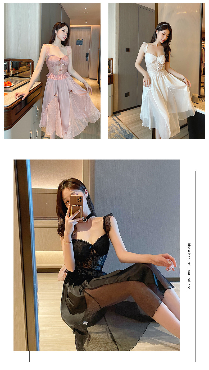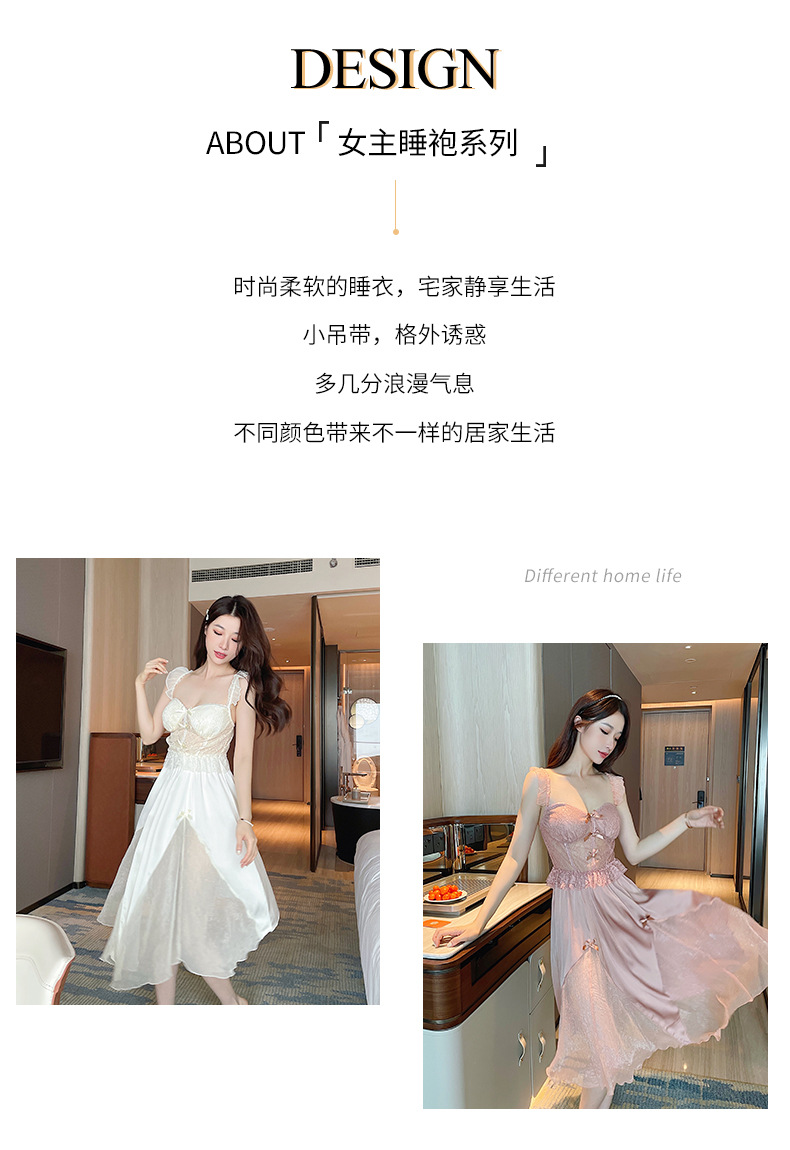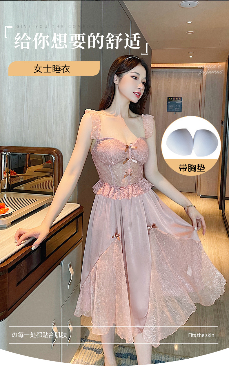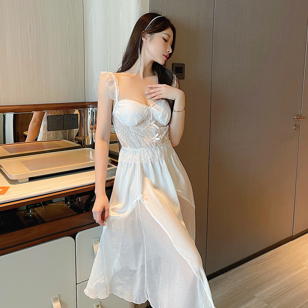 순수한 섹시함과 부드러움이 어우러진 끈나시 유혹 잠옷, 가슴 패드 내장, 등이 드러나는 롱 끈나시 원피스 여성 홈웨어 세트