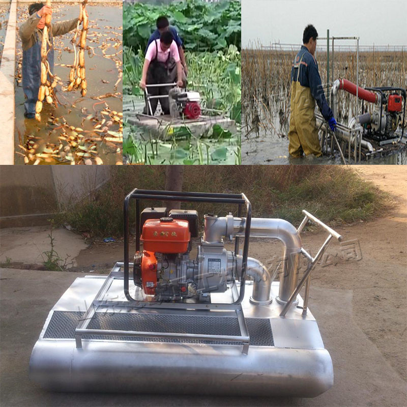 新型船式挖藕机由浮筒在藕田里,水深不低于10公分,上面装有定做的高压水泵和动力组成。由动力带动高压水泵抽取藕田的污水,经由二次增压。由多个高压喷嘴形成散射状。不会损伤藕芽和藕皮。从而完成挖藕作业。
