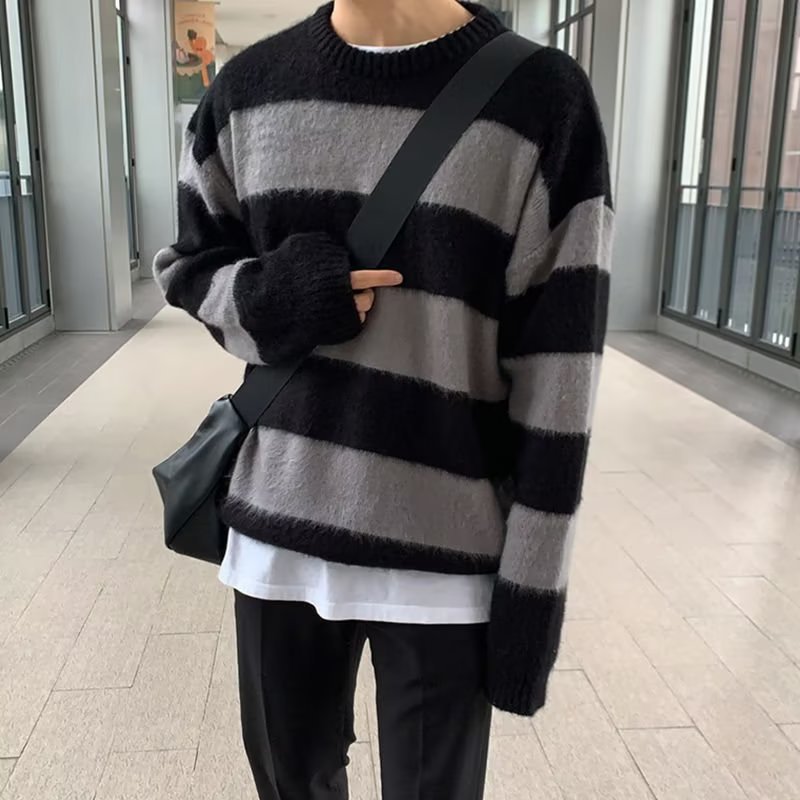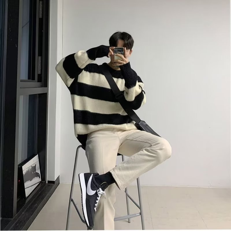크루넥 디자인 센스 게으른 스트라이프 스웨터 새로운 니트웨어 루즈한 아메리칸 탑 트렌디 남성 트렌디 스웨터 남성용 겨울