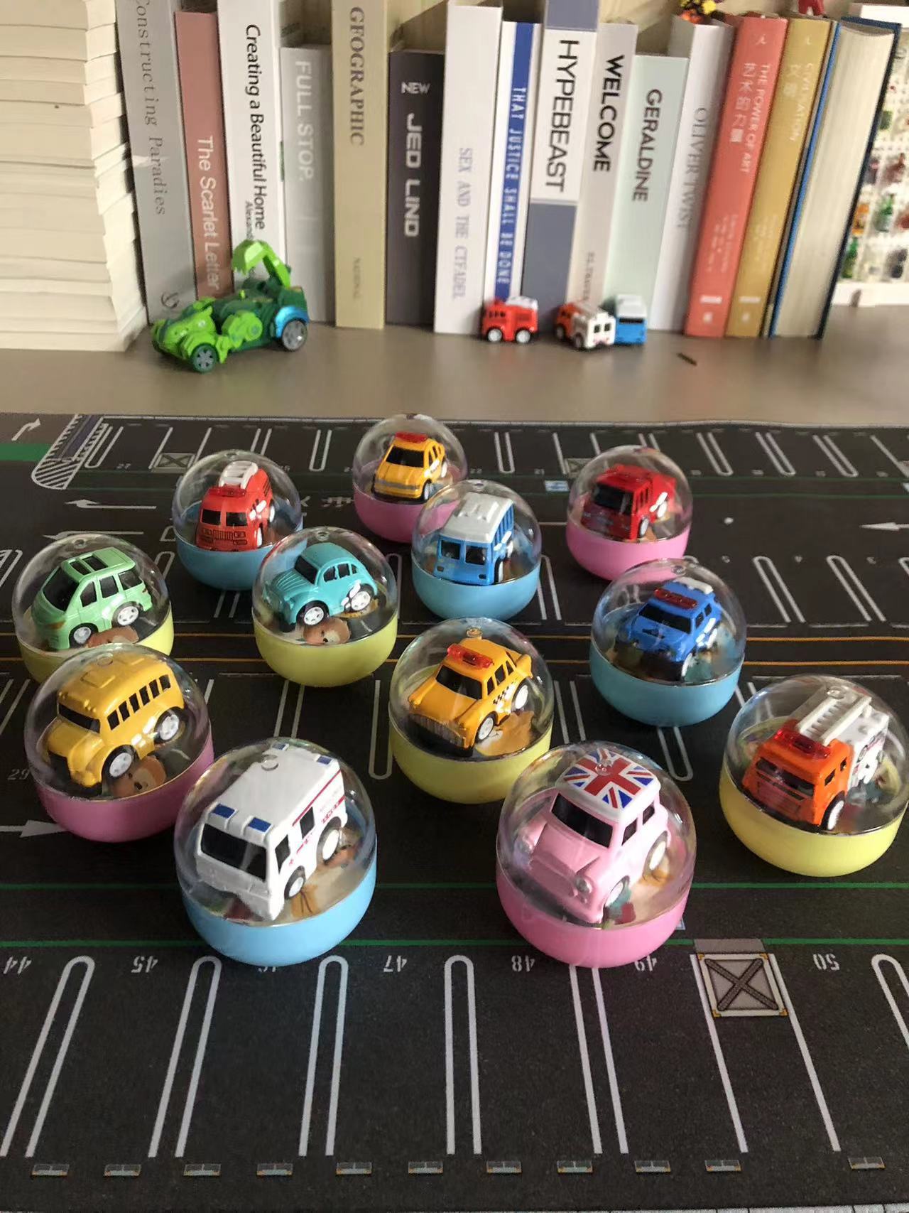 红色消防车比较大 蛋壳中间不能加垫片就能装的下!
