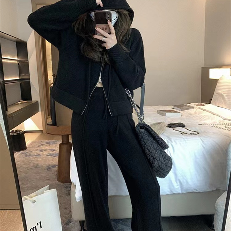 여성을위한 게으른 스타일 스웨터 정장 가을, 겨울 새로운 스타일 후드 하이 웨이스트 니트 자켓 슬릿 캐주얼 바지 투피스 세트
