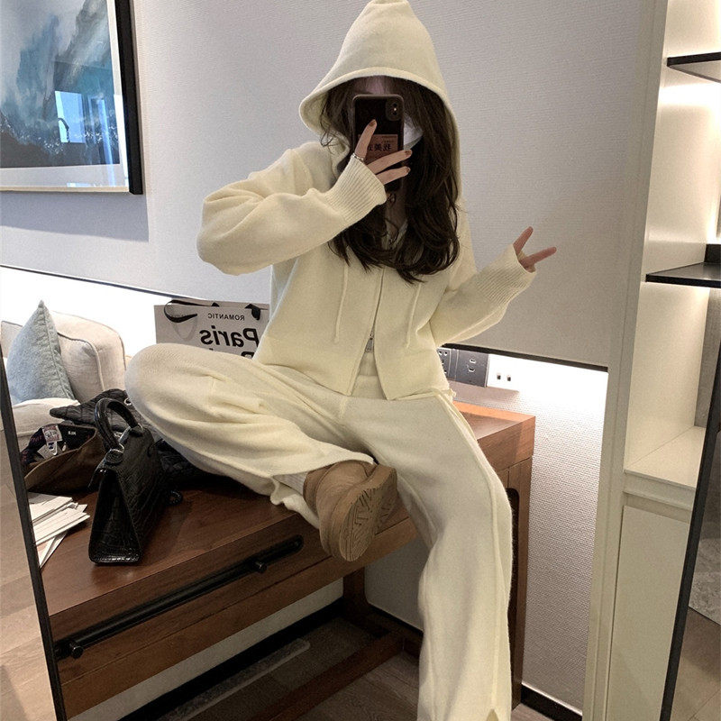 여성을위한 게으른 스타일 스웨터 정장 가을, 겨울 새로운 스타일 후드 하이 웨이스트 니트 자켓 슬릿 캐주얼 바지 투피스 세트스토어 가기