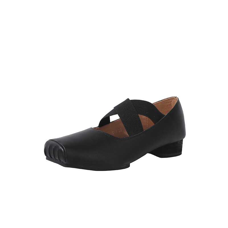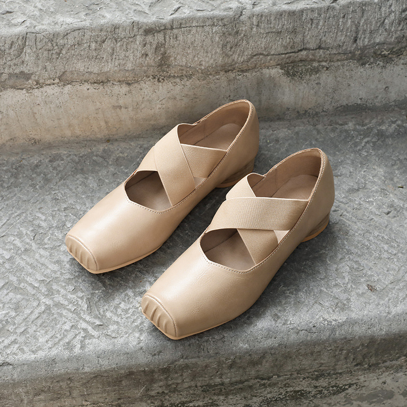 정품 가죽 메리 제인 여성 2025 새로운 크로스 스트랩 플리츠 스퀘어 발가락 레트로 두꺼운 뒤꿈치 발레 신발 겉옷