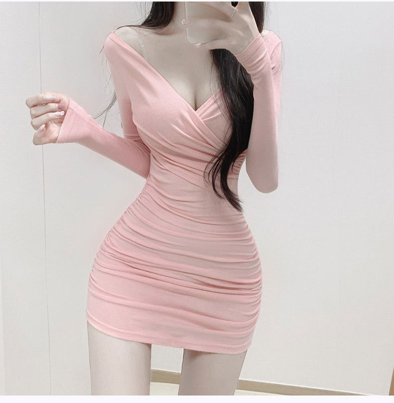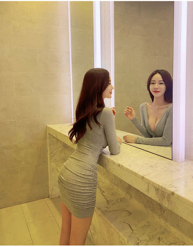 한국 동대문 새로운 꽉 엉덩이 원피스 여성 섹시한 가슴 짧은 원피스 회색 긴 소매 패션스토어 가기