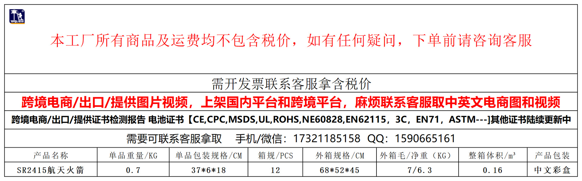 我们原则上不接受退货,产品因出厂质量问题的可协商换货,(多数问题都可以通过更换电池、调整电池安放位置、线头连接...等简单的方式来解决,卖玩具要会修玩具哦)但所产生运输费用需要由买家负责,换货产品务必确保不影响二次销售,收到退回产品后我们会在客户下次进货时将换货一起发出,无法接受下次发货时一起发的情况,运费由客户自理!寄回前必须告知本厂旺旺客服!!!