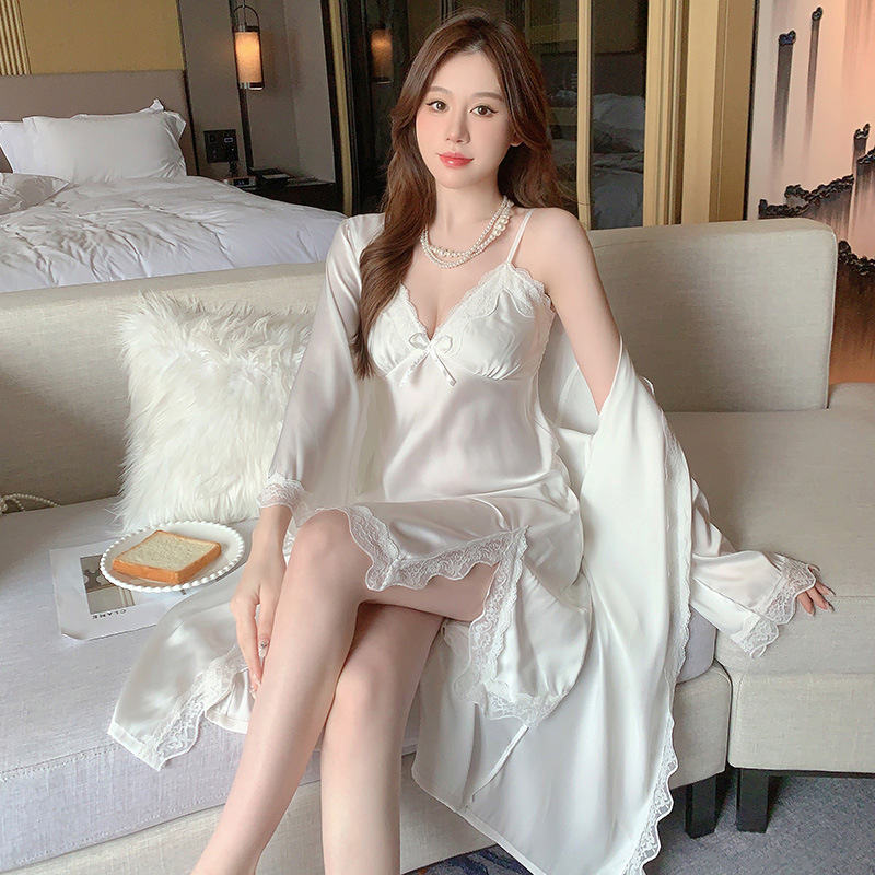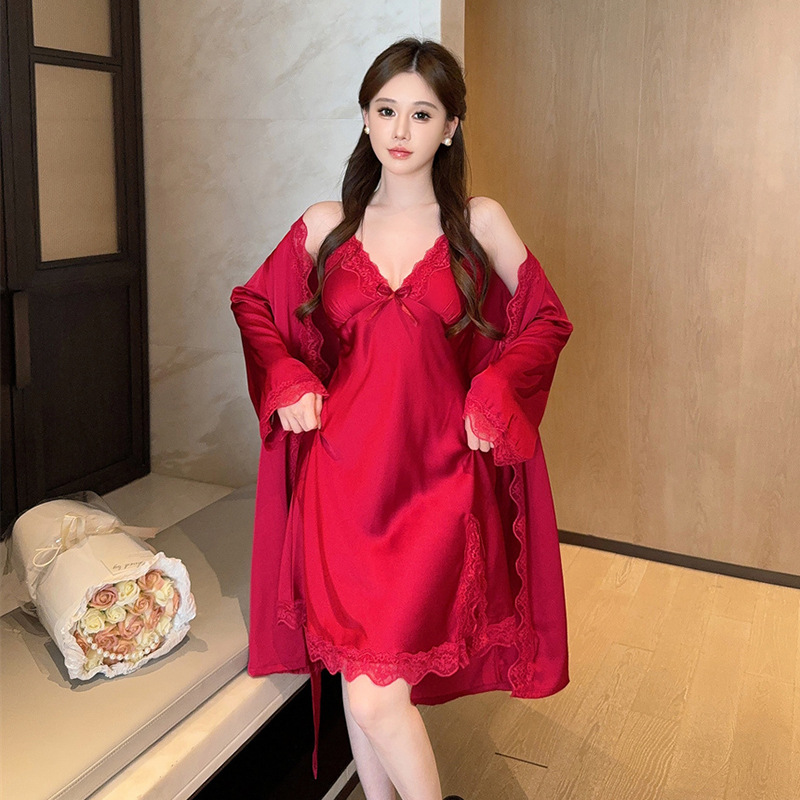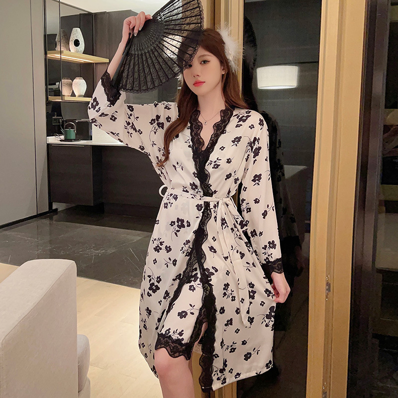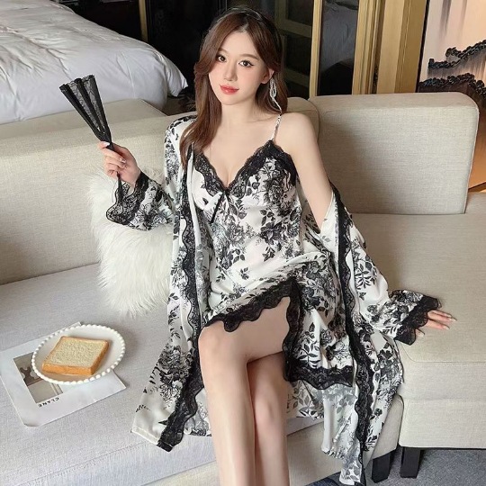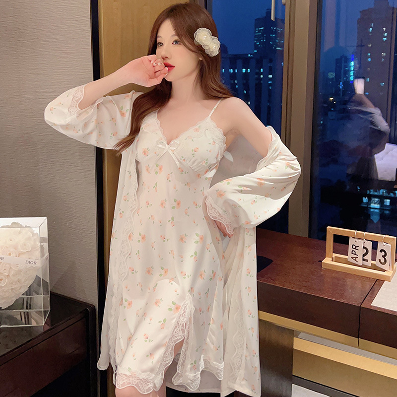 여자의 인쇄 잠옷 봄과 여름 얼음 실크 얇은 잠옷 잠옷 투피스 세트 섹시한 벨트 가슴 패드 가정 옷 세트