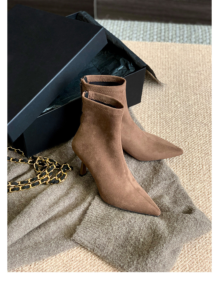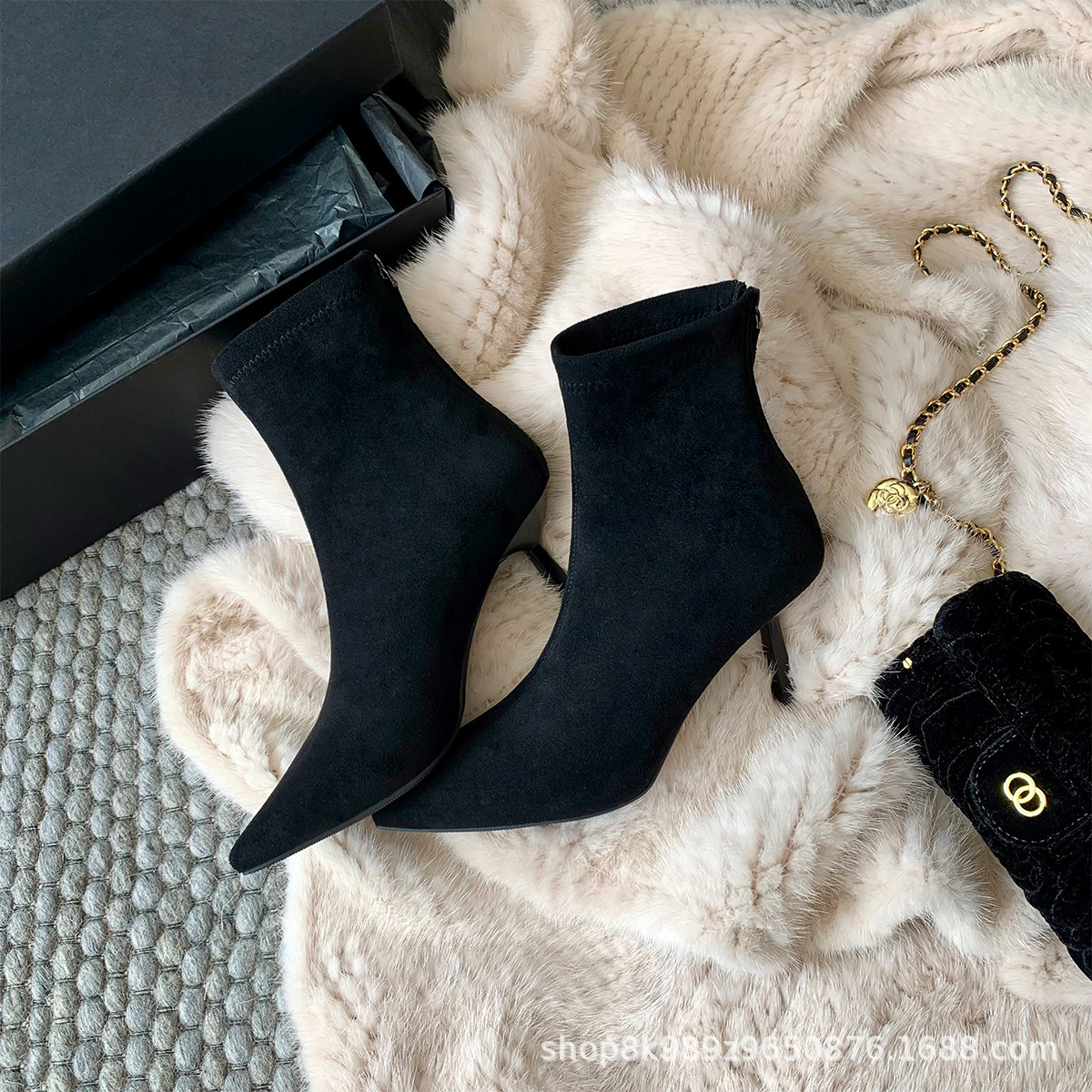 [재고] 머리카락 지퍼 얇은 힐 하이힐 부츠 뾰족한 기모 얇은 짧은 부츠 여성의 세대스토어 가기
