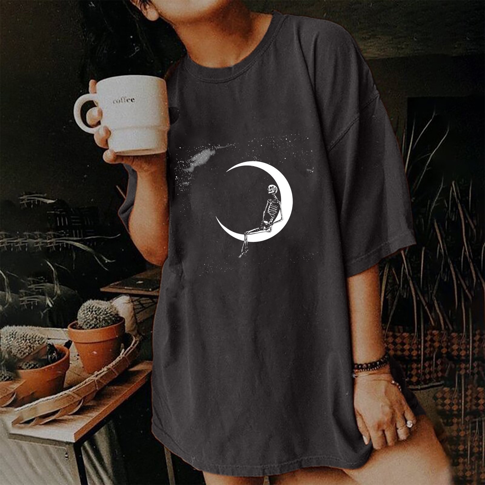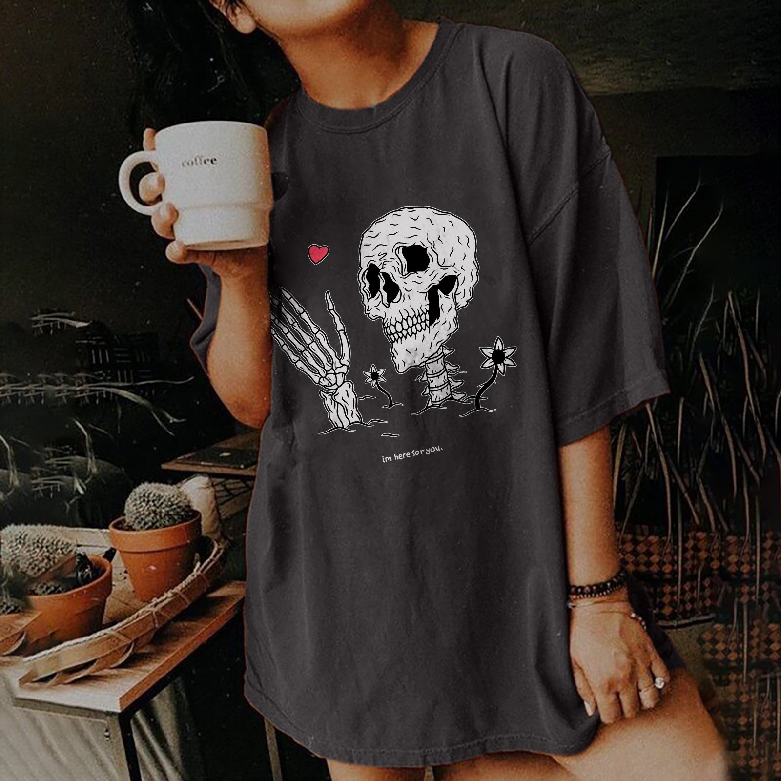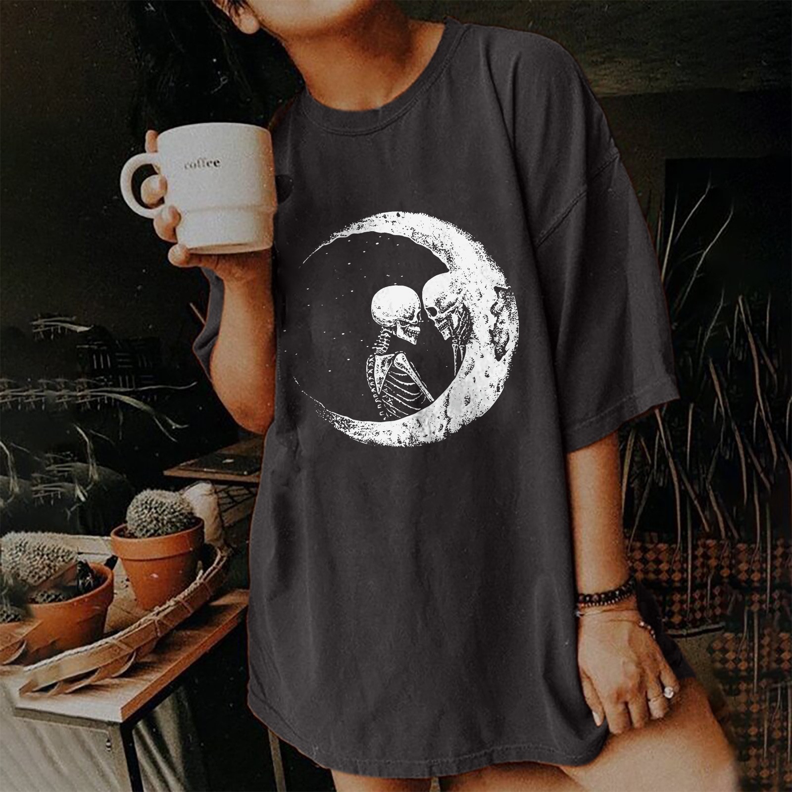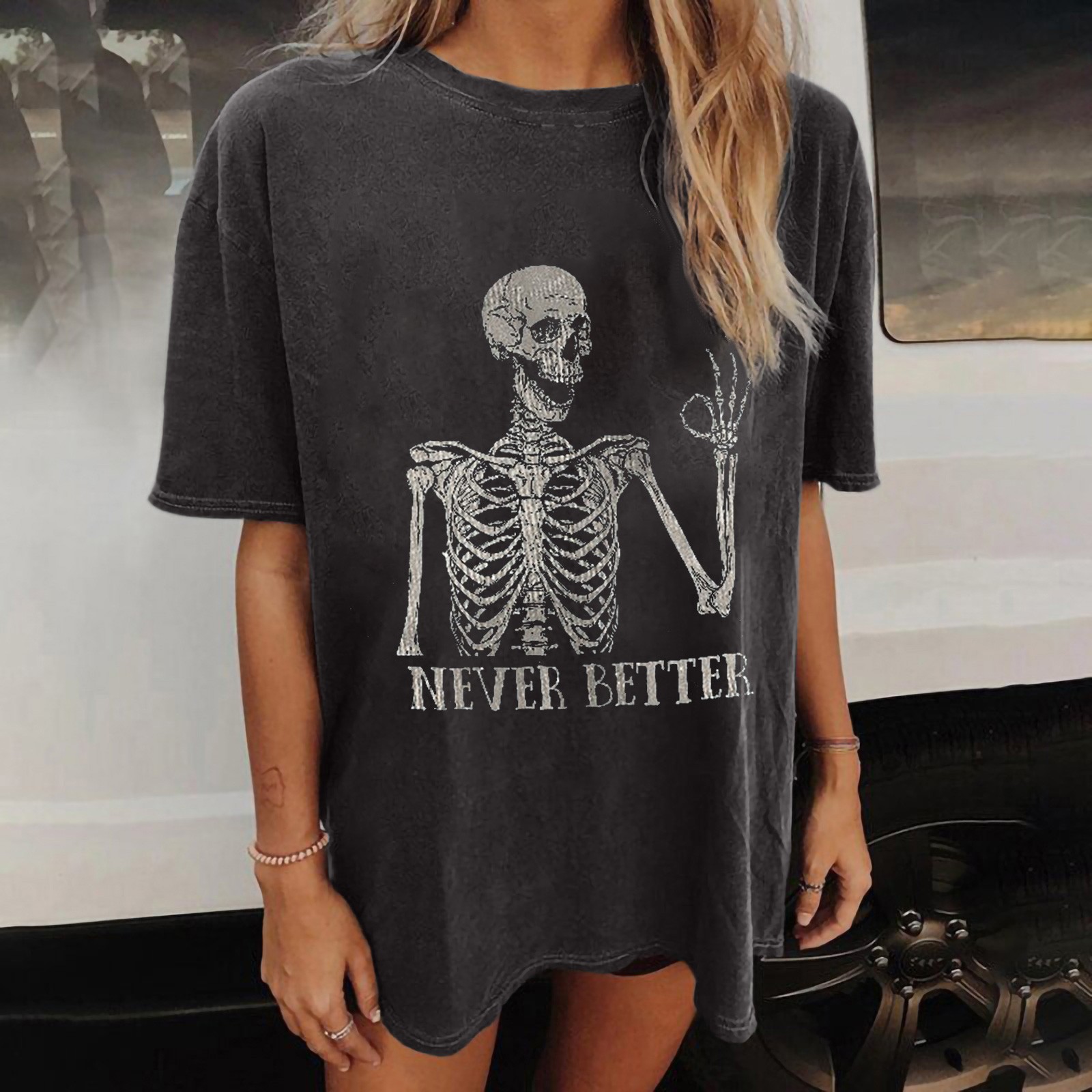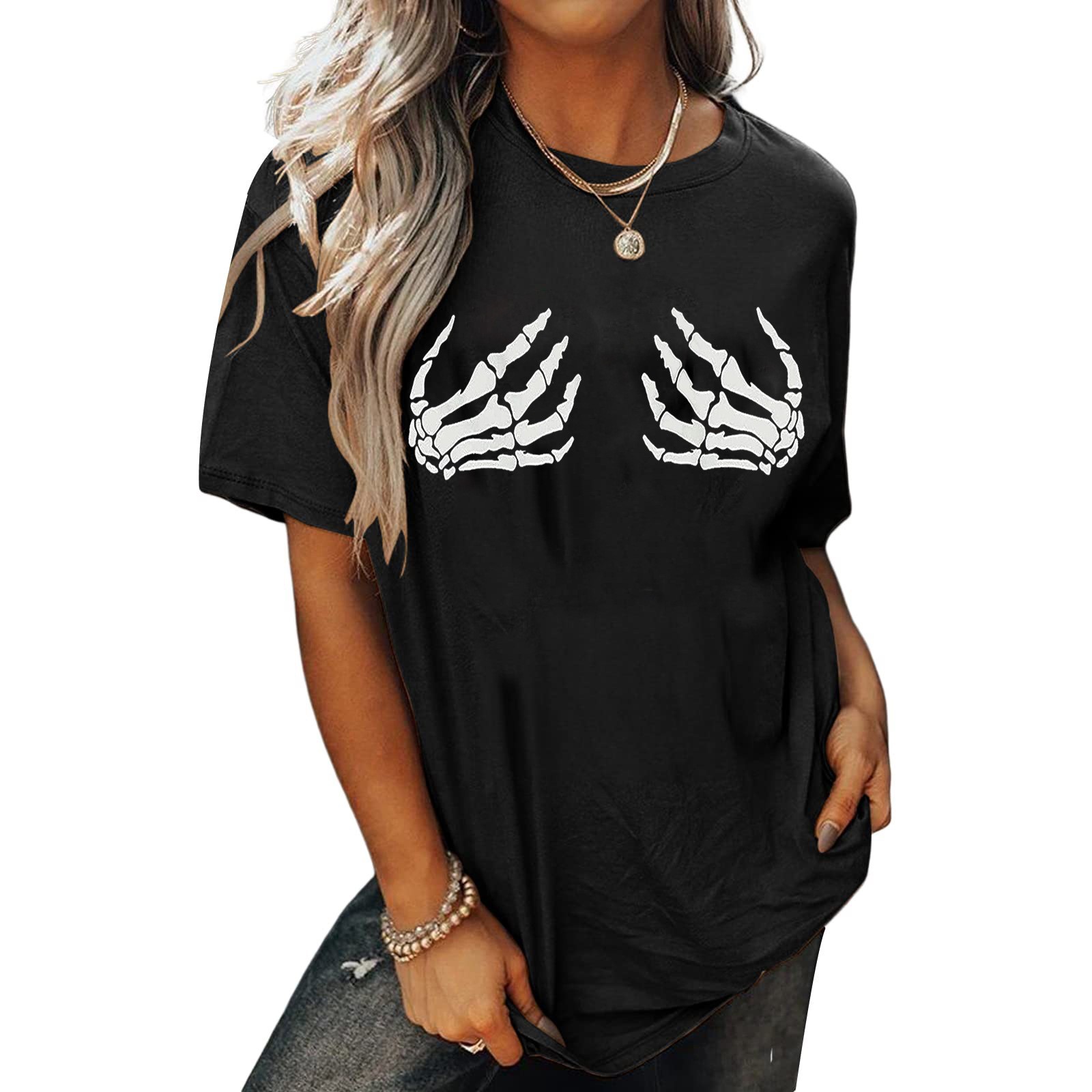 반팔 티셔츠 여성용 여름 어깨 반팔 여성용 유럽 사이즈 레트로 프린트 티셔츠 유럽 사이즈 해골 문 여성 캐주얼 티셔츠스토어 가기