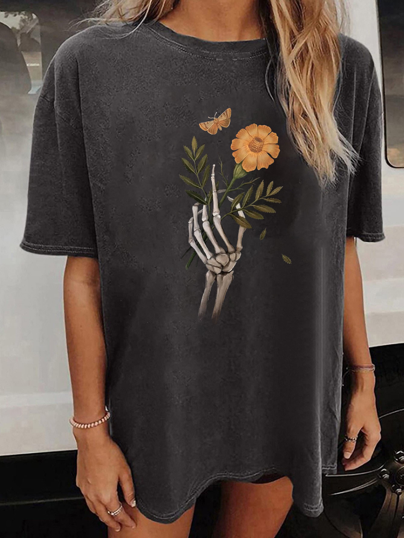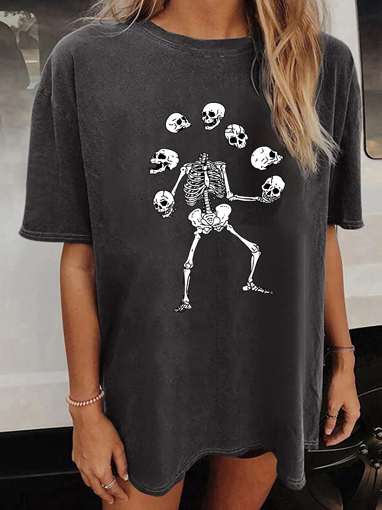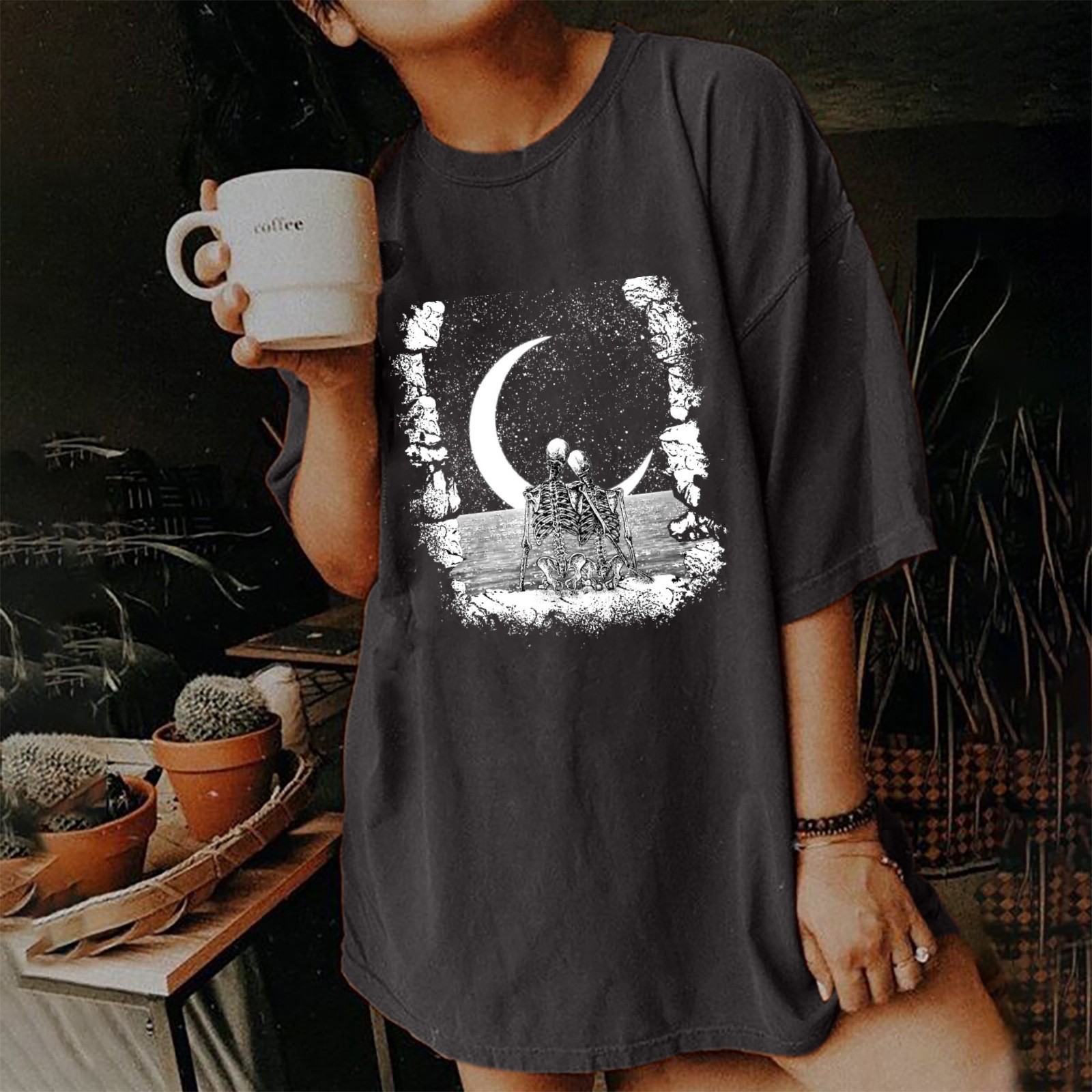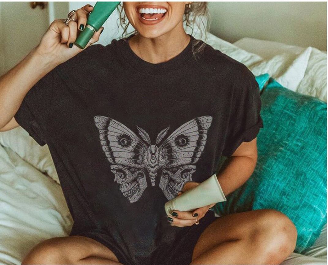 반팔 티셔츠 여성용 여름 어깨 반팔 여성용 유럽 사이즈 레트로 프린트 티셔츠 유럽 사이즈 해골 문 여성 캐주얼 티셔츠스토어 가기