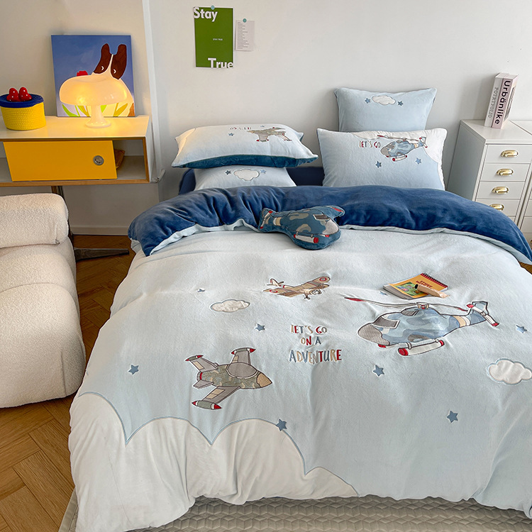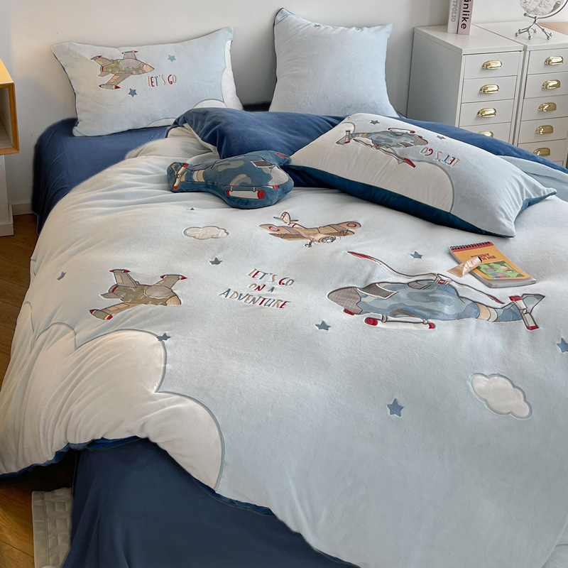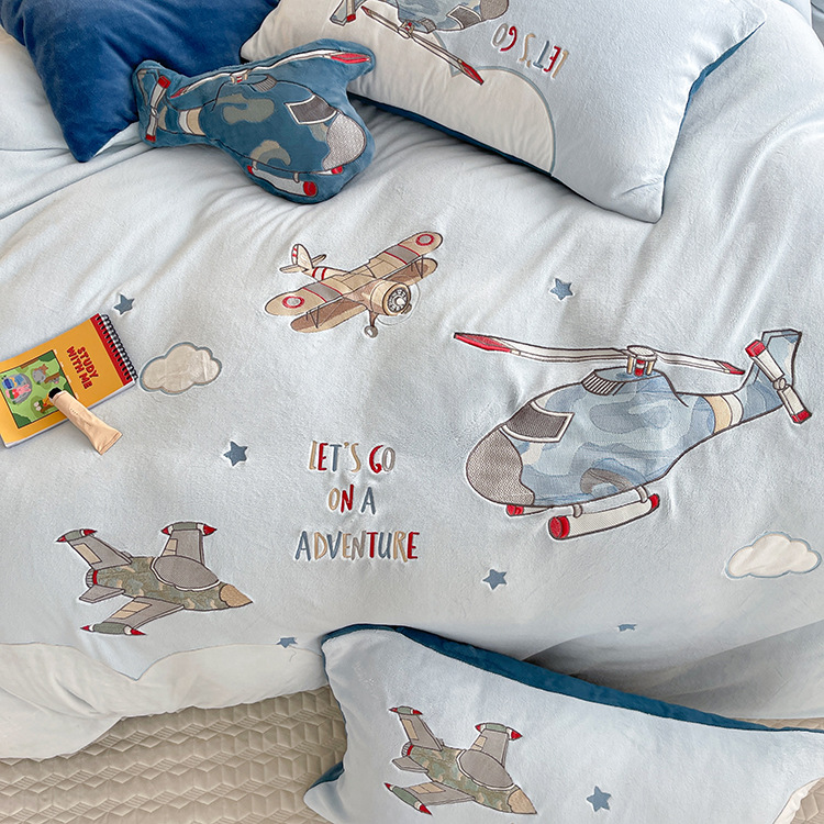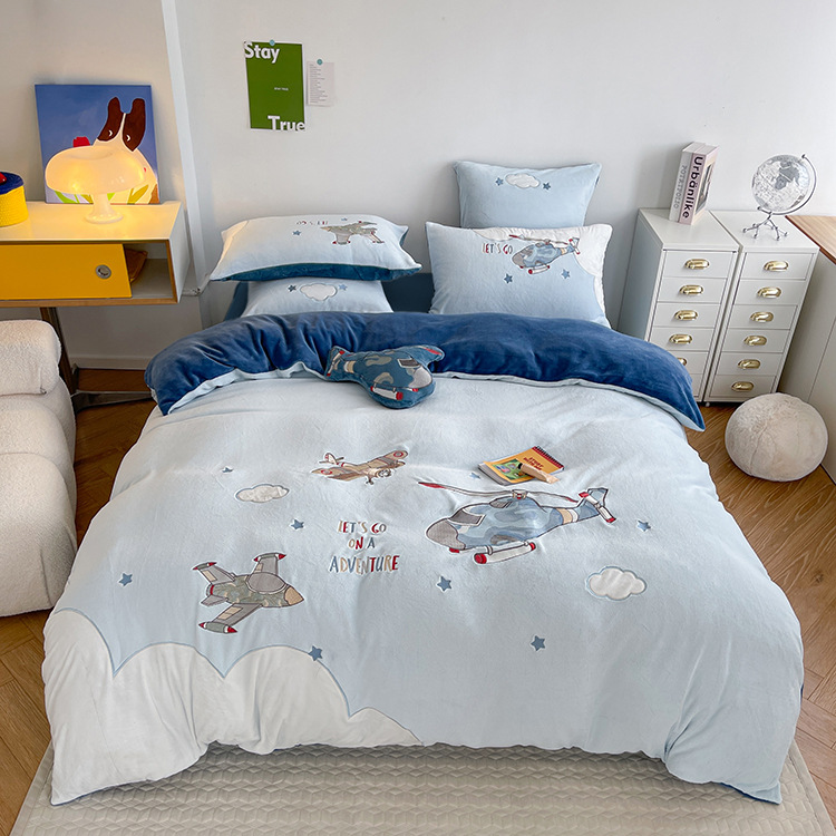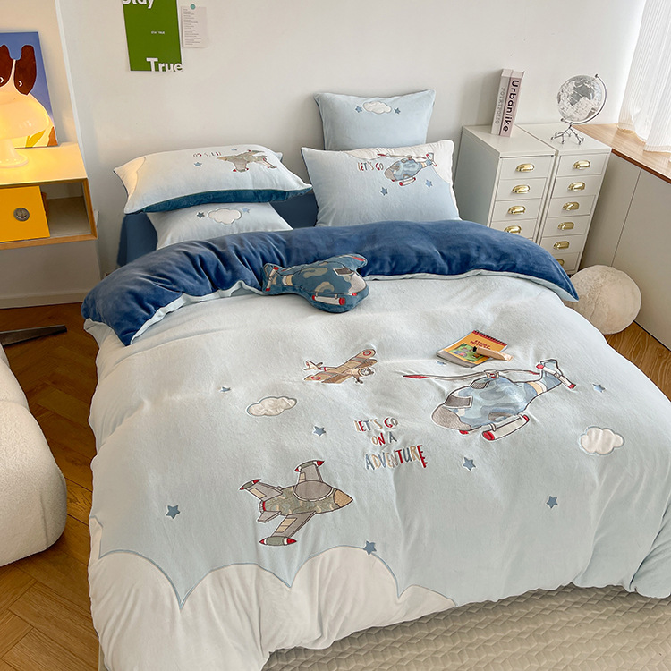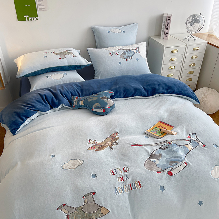 만화 스타일 소년의 비행기 수 놓은 우유 벨벳 4 종 세트 겨울 두꺼운 산호 벨벳 이불 커버 어린이 침구스토어 가기
