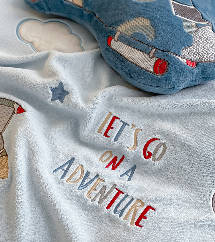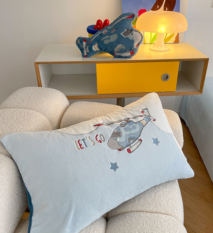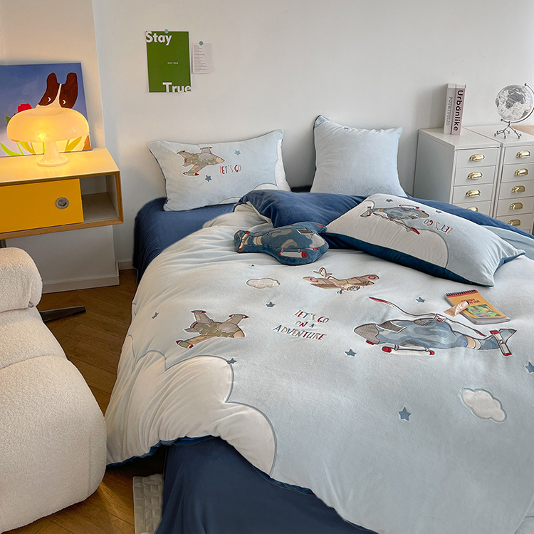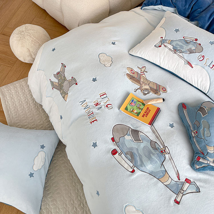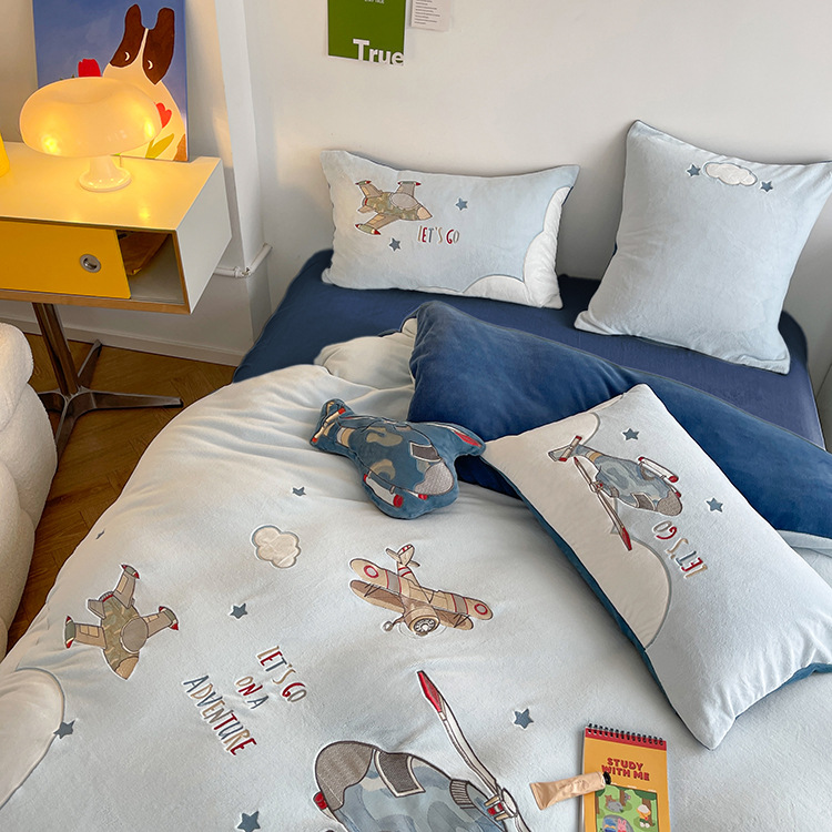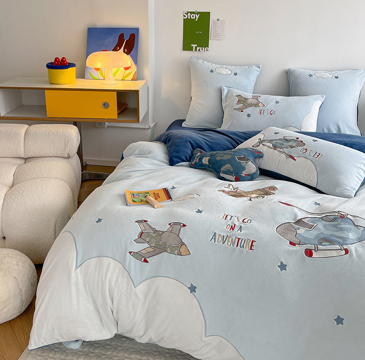 만화 스타일 소년의 비행기 수 놓은 우유 벨벳 4 종 세트 겨울 두꺼운 산호 벨벳 이불 커버 어린이 침구스토어 가기