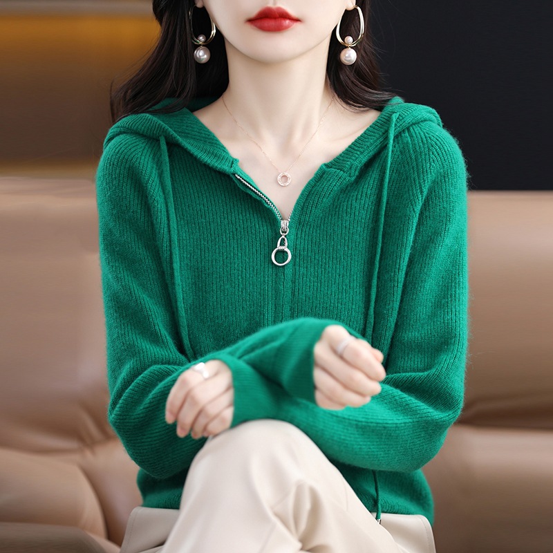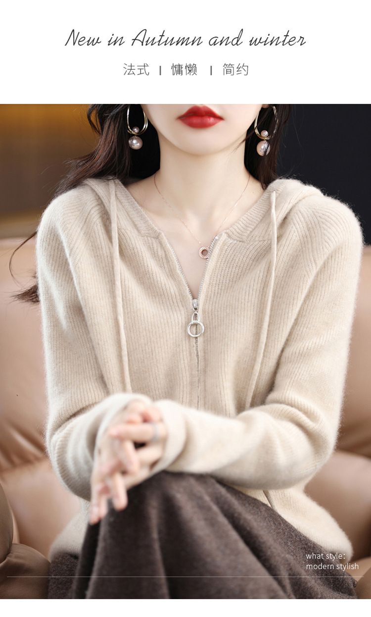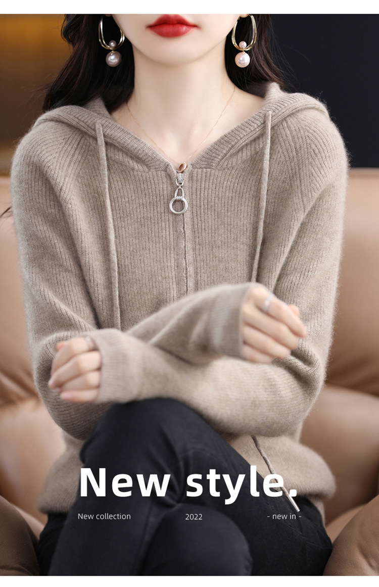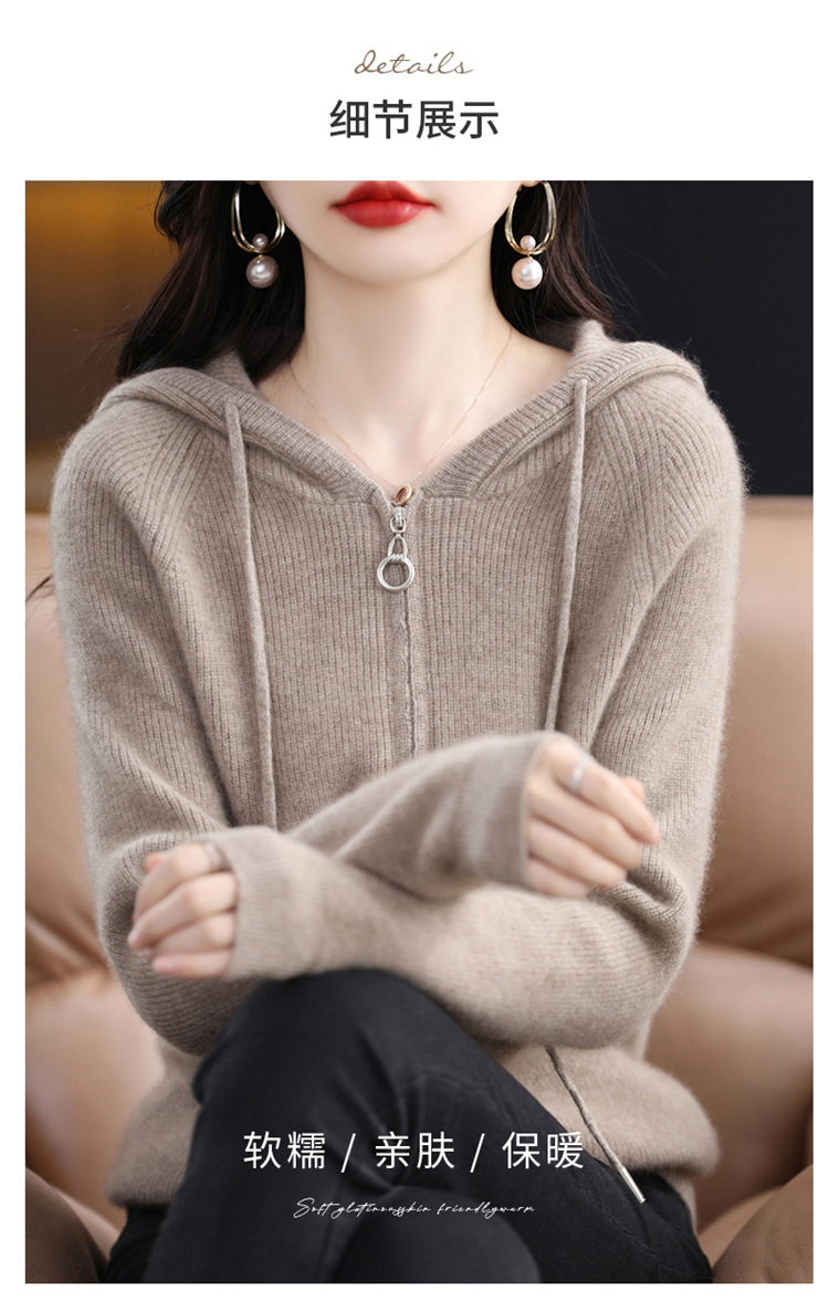 후드 스웨터 여성 2023 봄 한국 순수 울 지퍼 카디건 느슨한 캐시미어 스웨터 두꺼운 니트 후드 도매