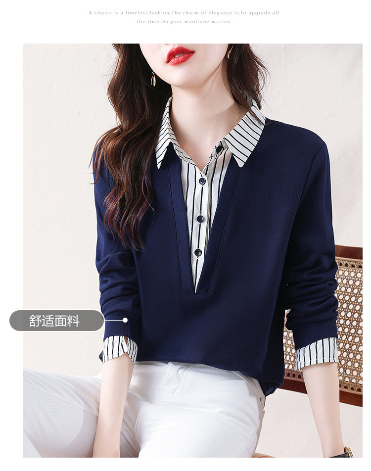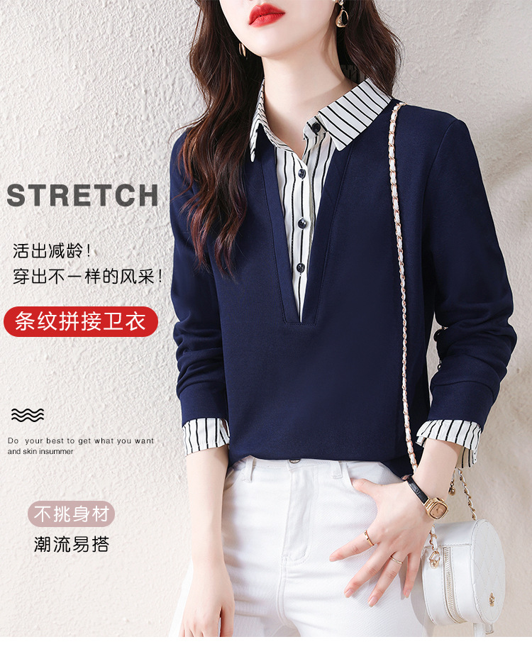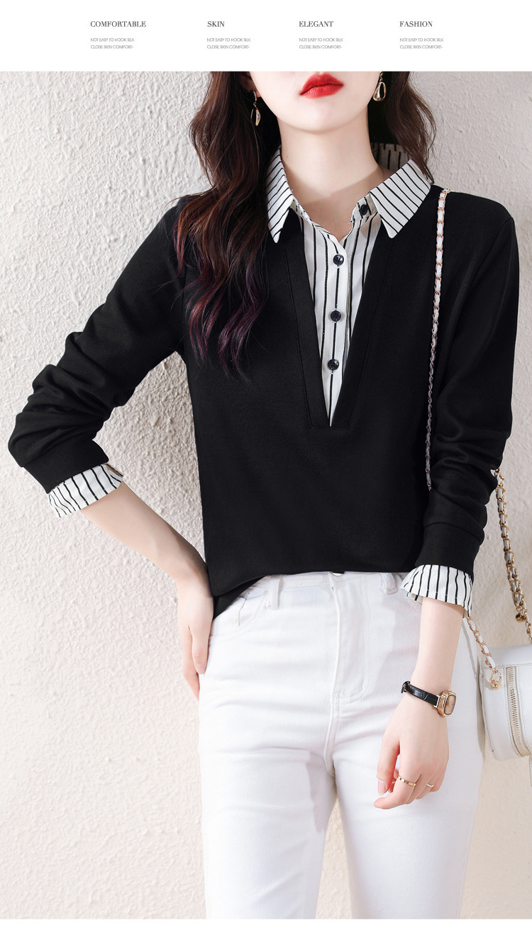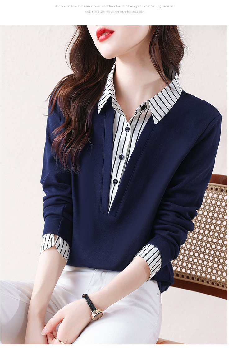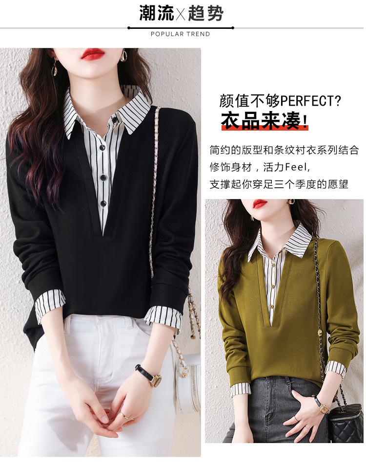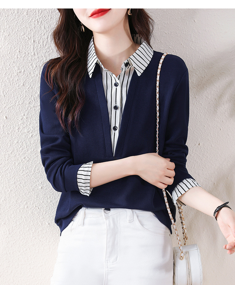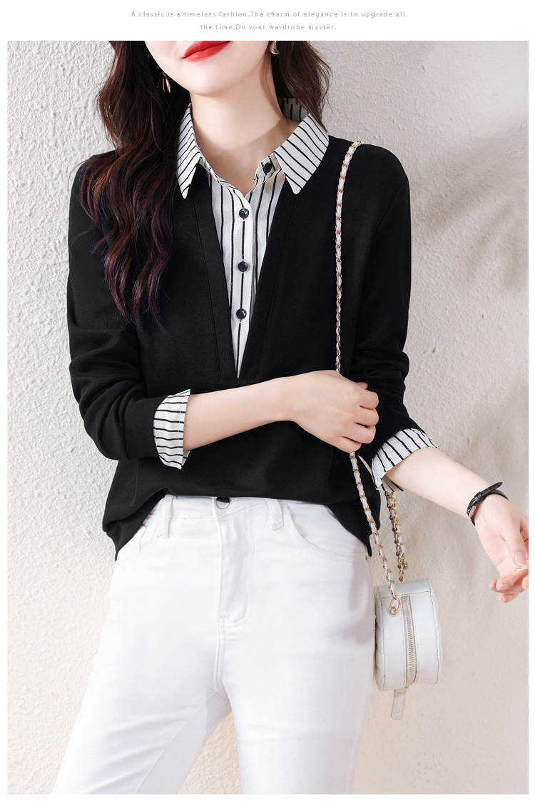 여성 옷깃 2023 새로운 가을 폴로 칼라 스트라이프 스티치 셔츠 가짜 투피스 긴 소매 스웨터 탑 패션스토어 가기