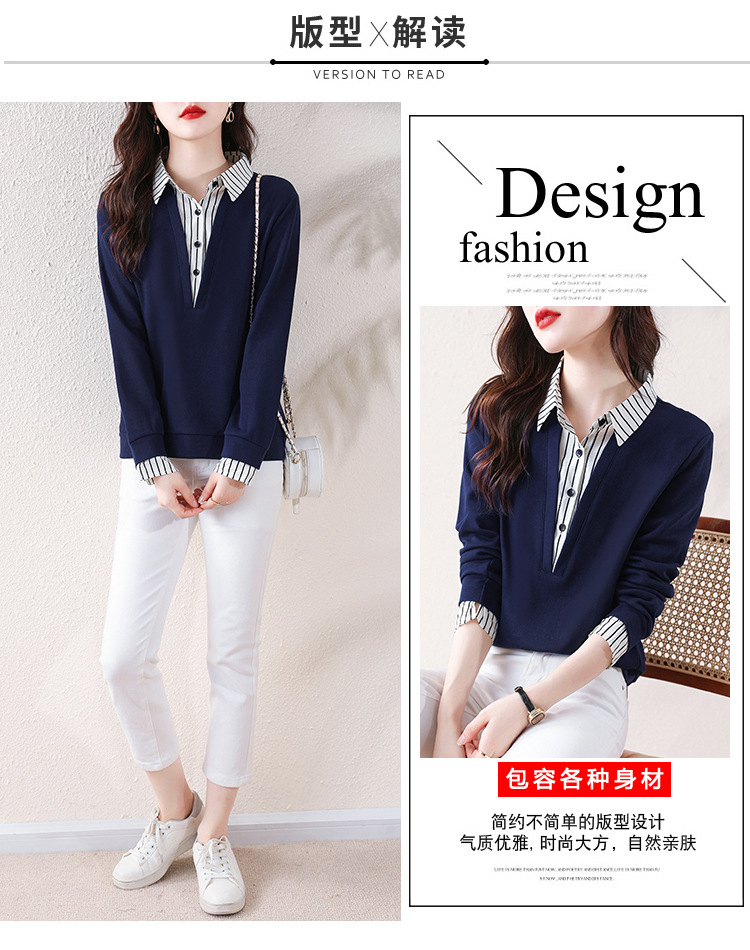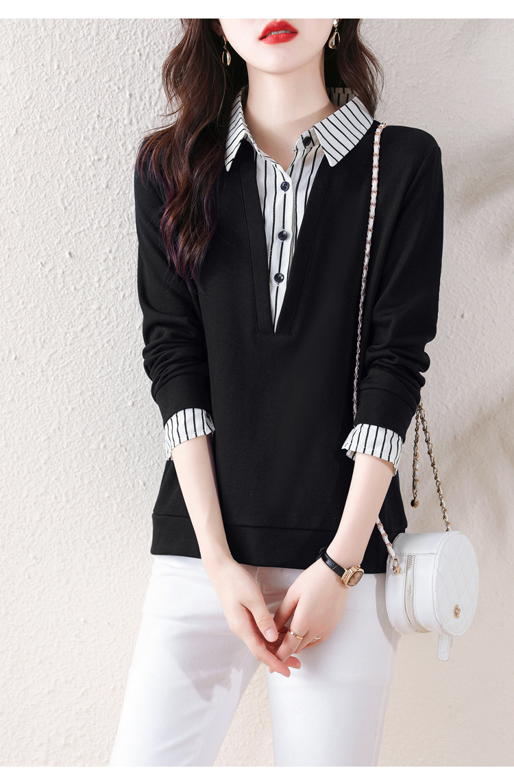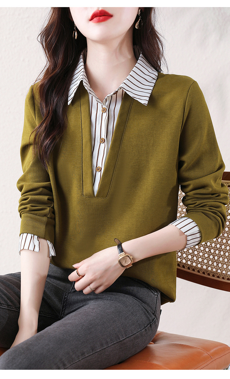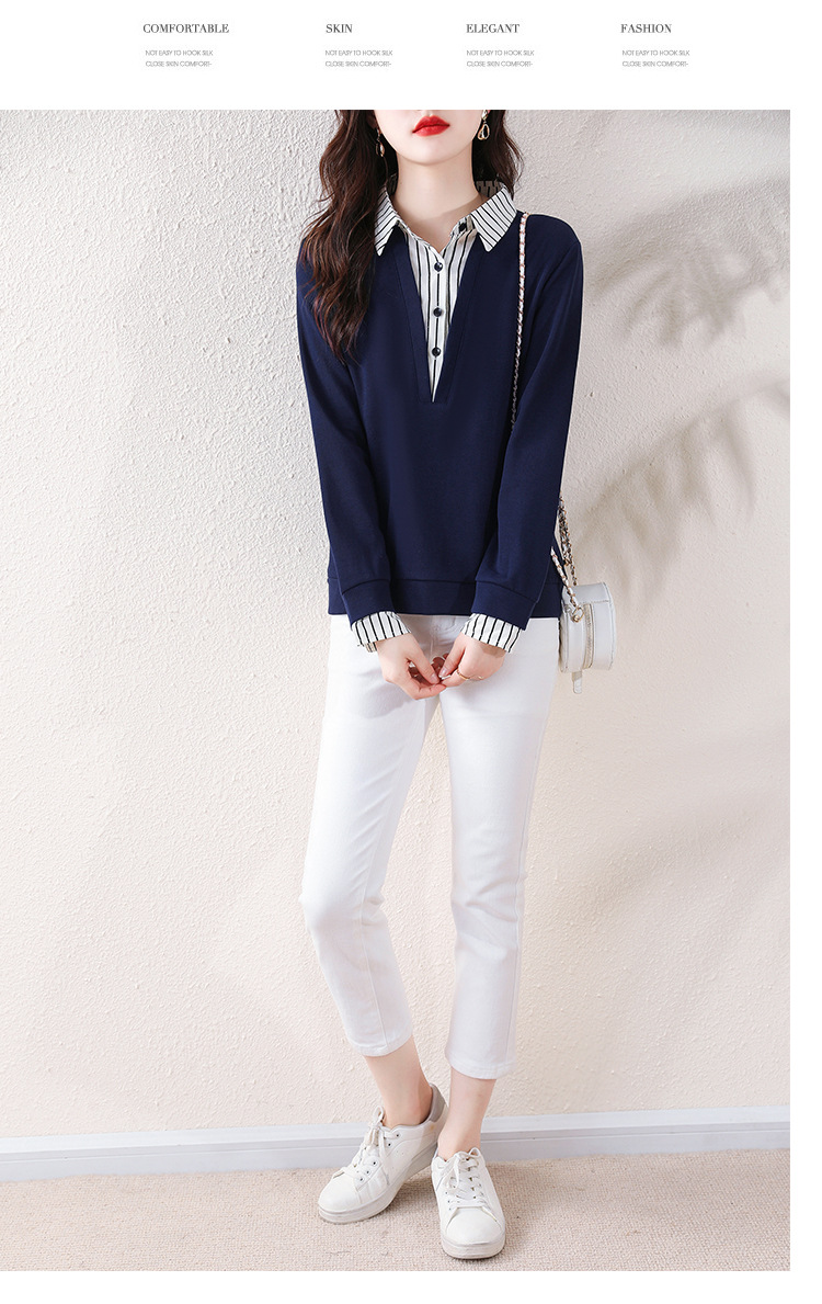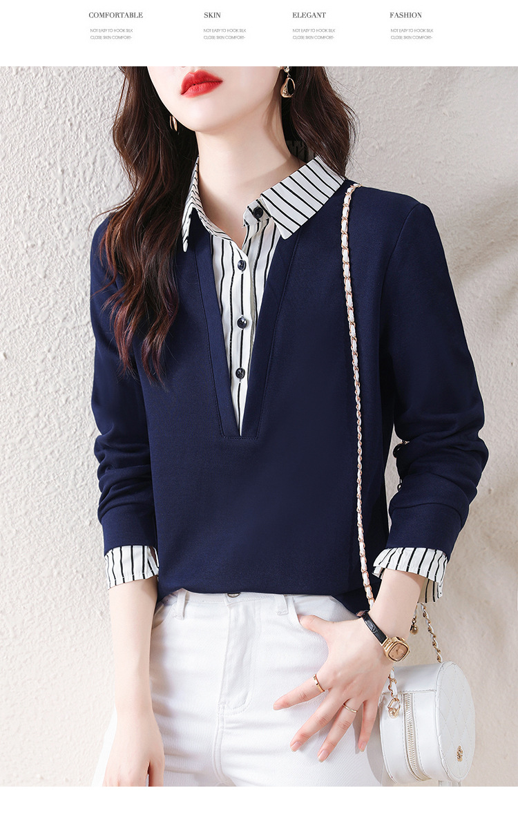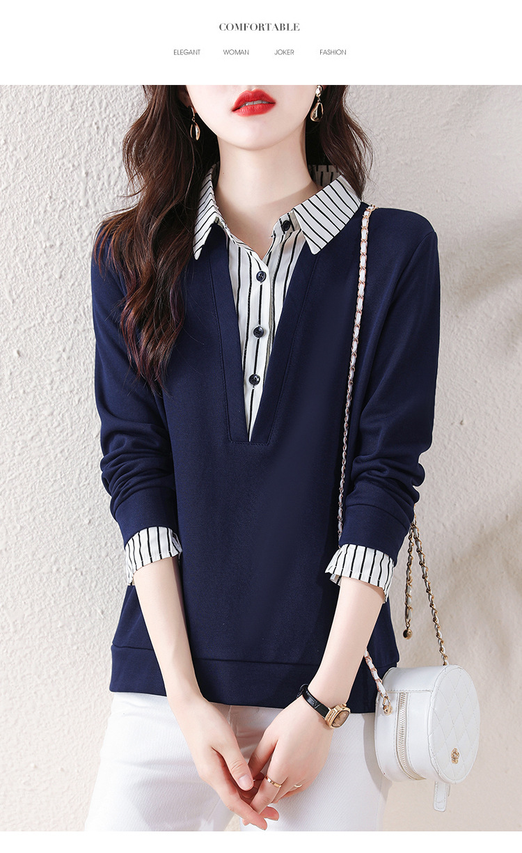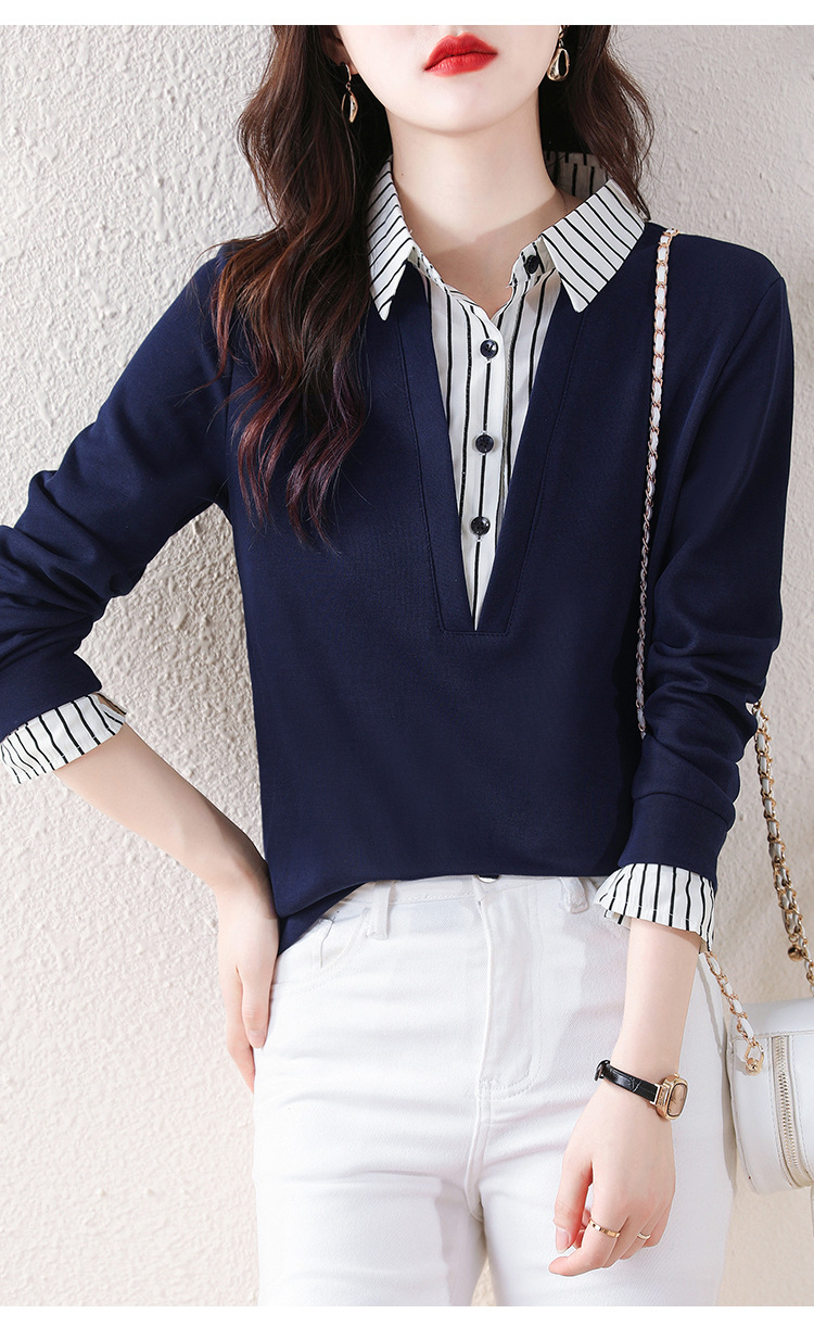 여성 옷깃 2023 새로운 가을 폴로 칼라 스트라이프 스티치 셔츠 가짜 투피스 긴 소매 스웨터 탑 패션스토어 가기