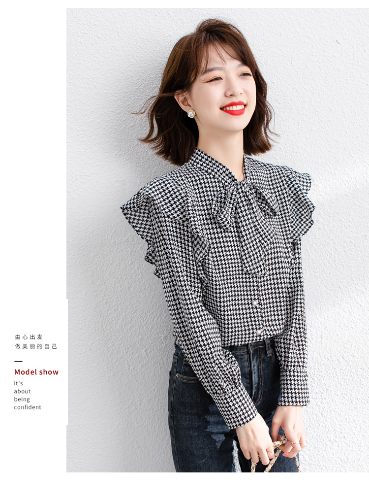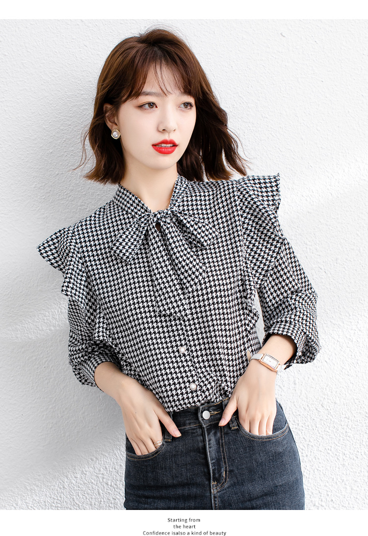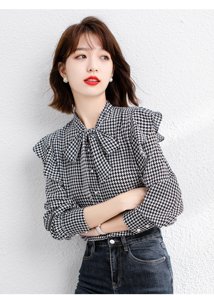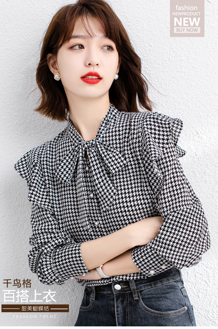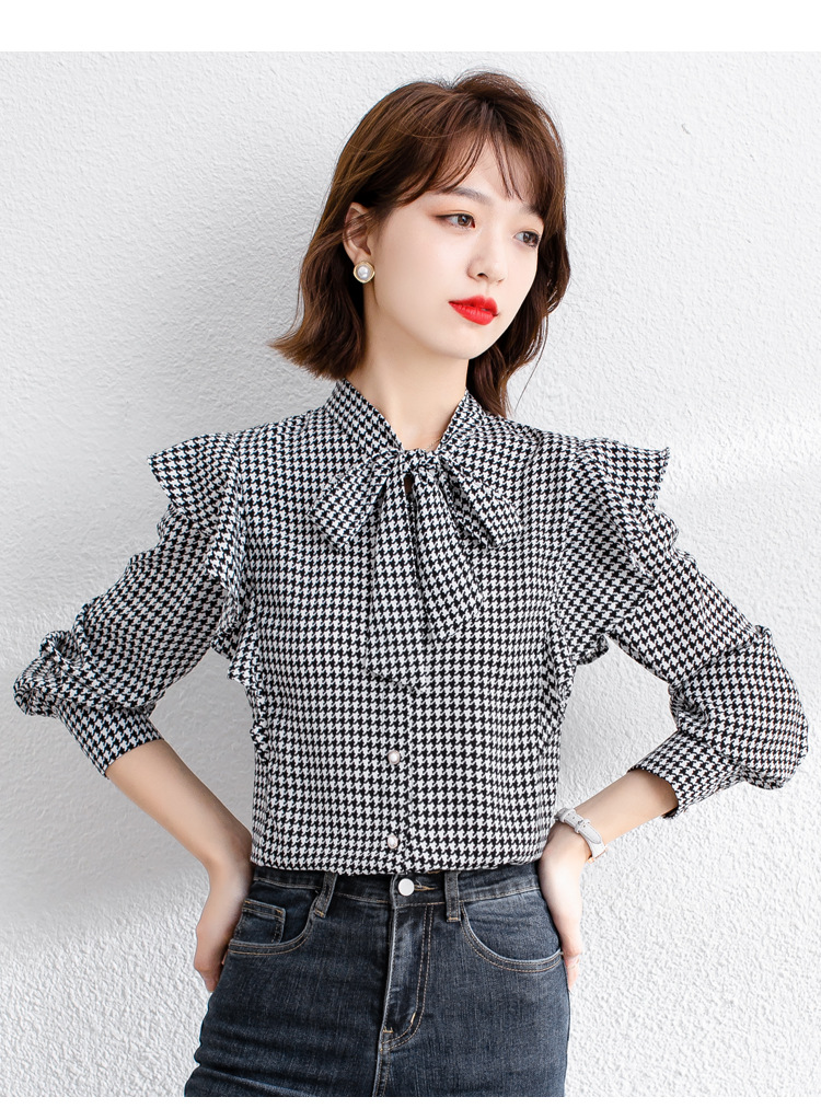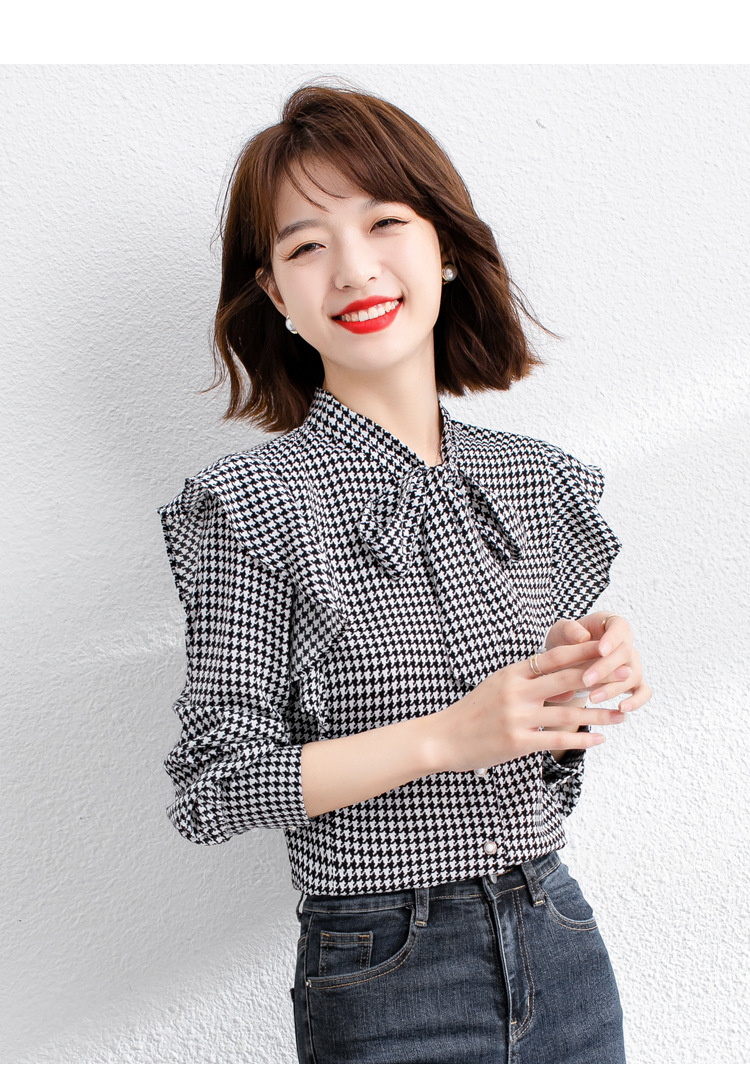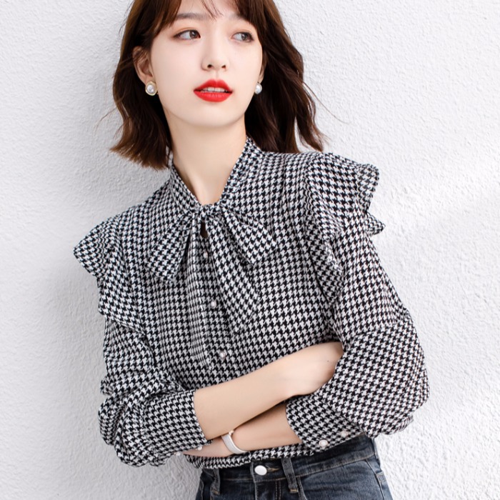 Houndstooth 셔츠 여성용 디자인 센스 틈새 봄 의류 2023 새로운 보우 셔츠 여성 패션 모든 매치 탑스토어 가기