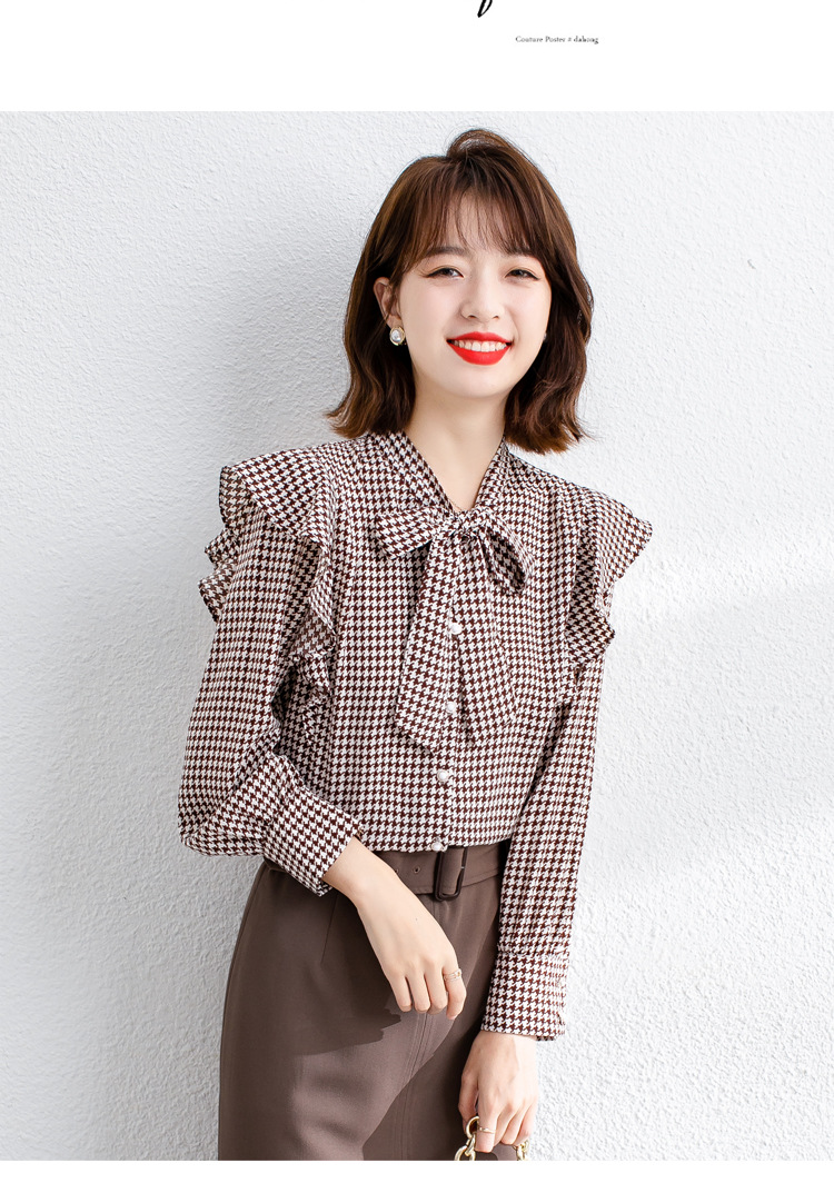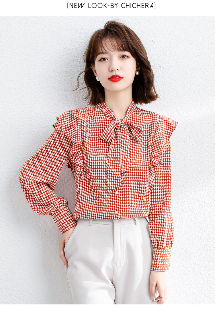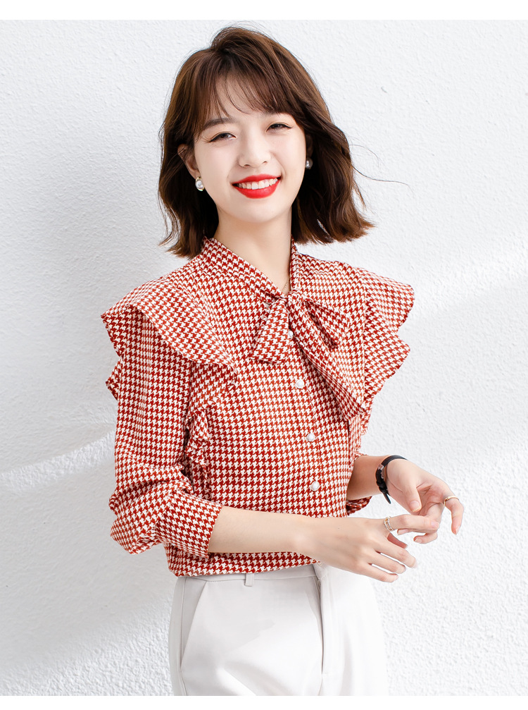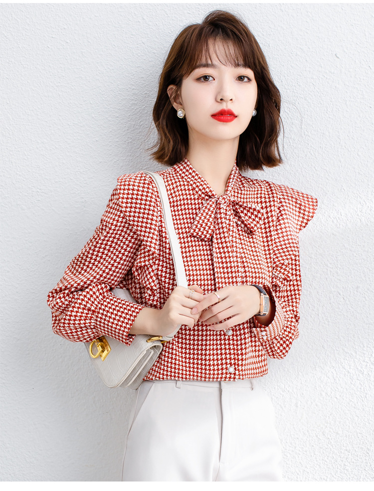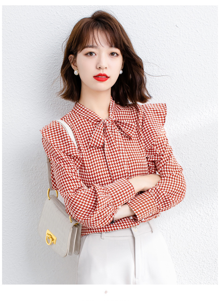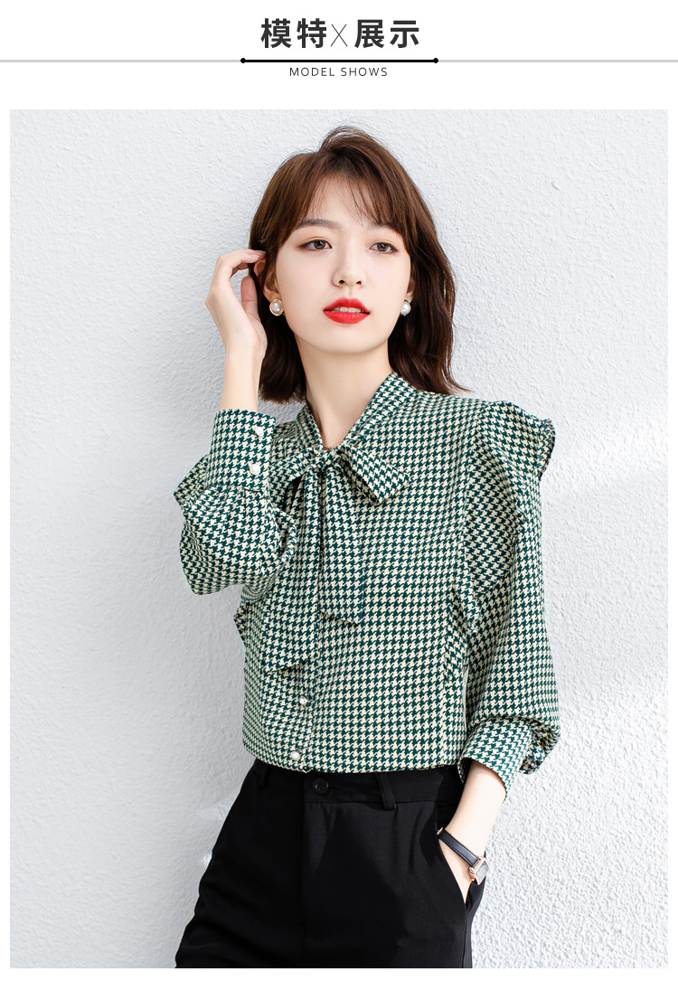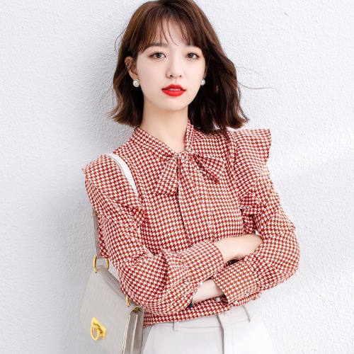 Houndstooth 셔츠 여성용 디자인 센스 틈새 봄 의류 2023 새로운 보우 셔츠 여성 패션 모든 매치 탑스토어 가기