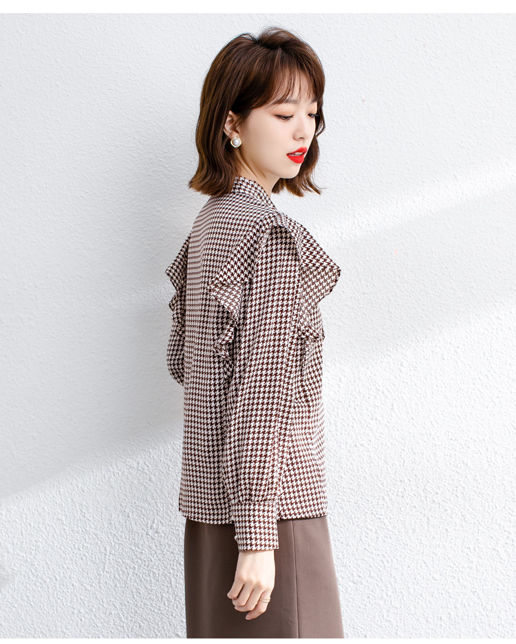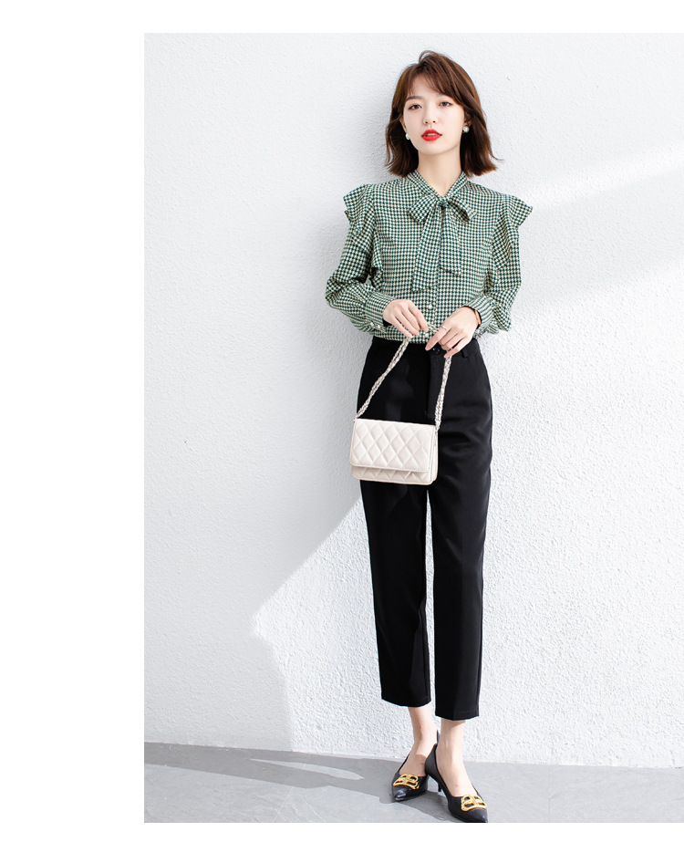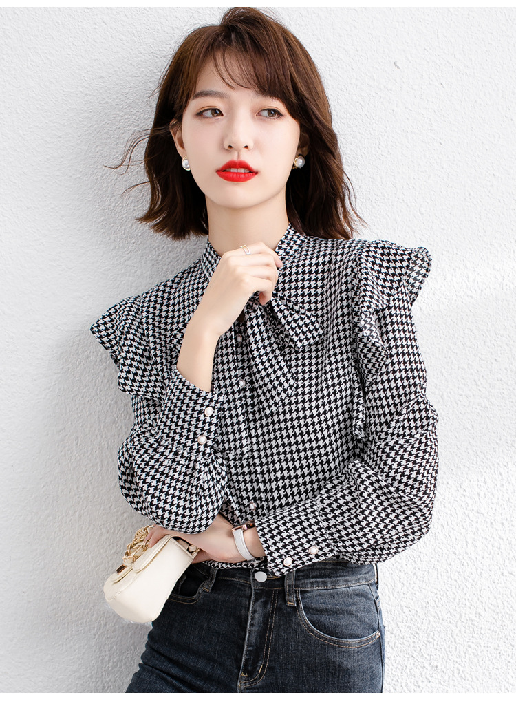 Houndstooth 셔츠 여성용 디자인 센스 틈새 봄 의류 2023 새로운 보우 셔츠 여성 패션 모든 매치 탑
