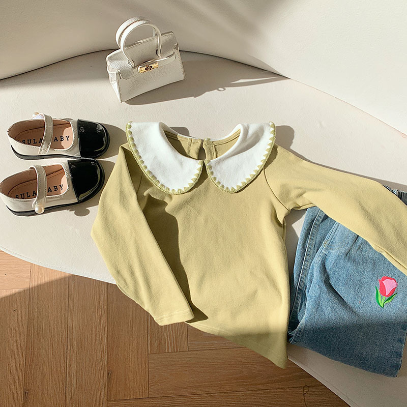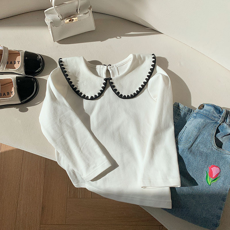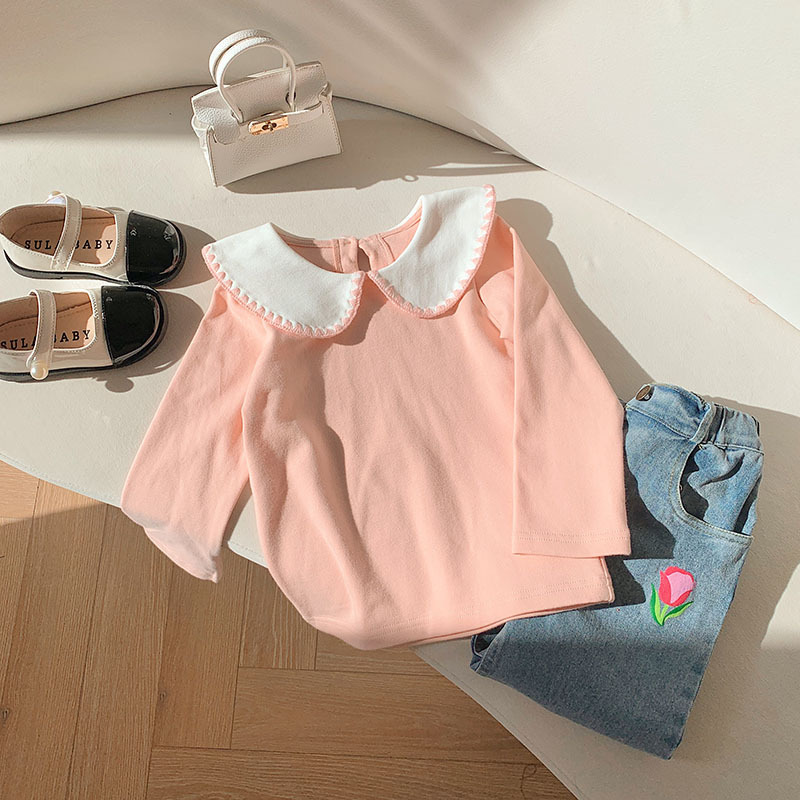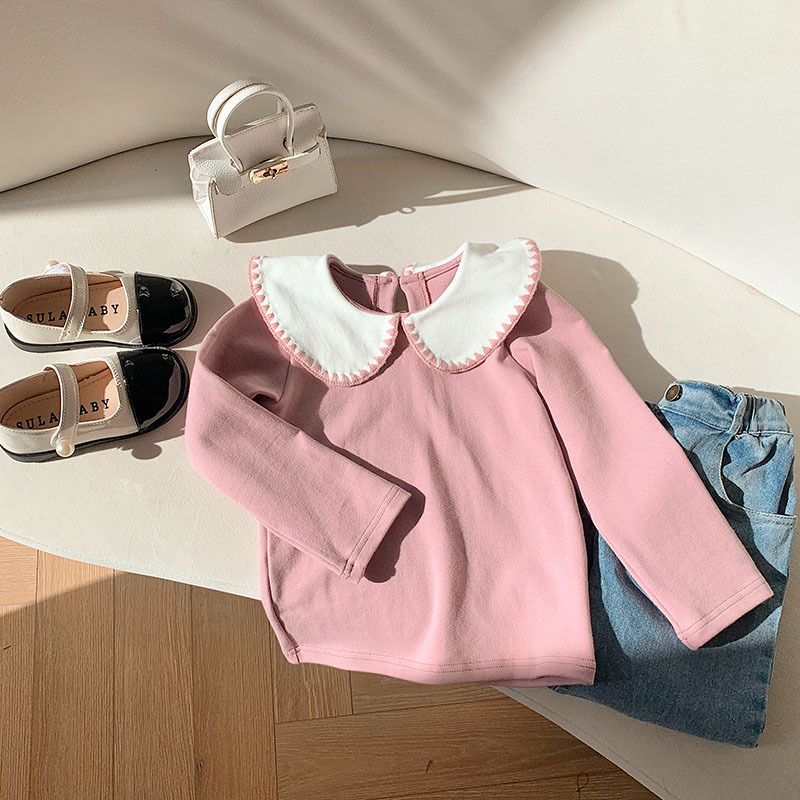기본 인형 칼라 소녀 바닥 셔츠 2024 가을 양모 풀업 코튼 아동용 긴팔 티셔츠 외부 탑스토어 가기
