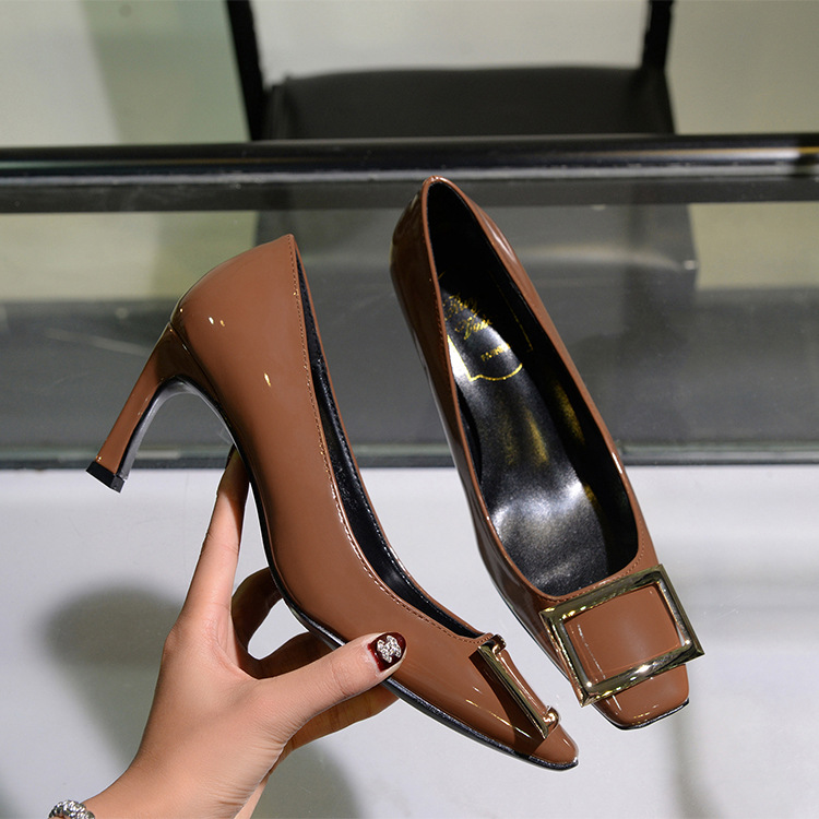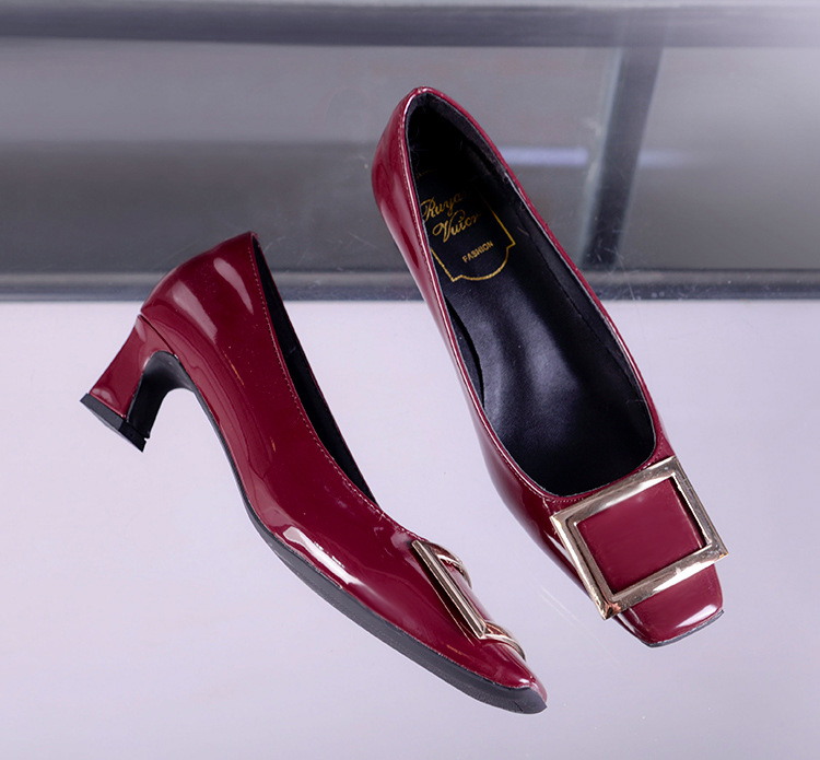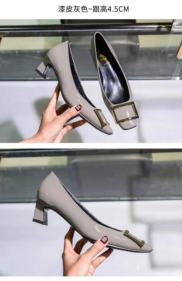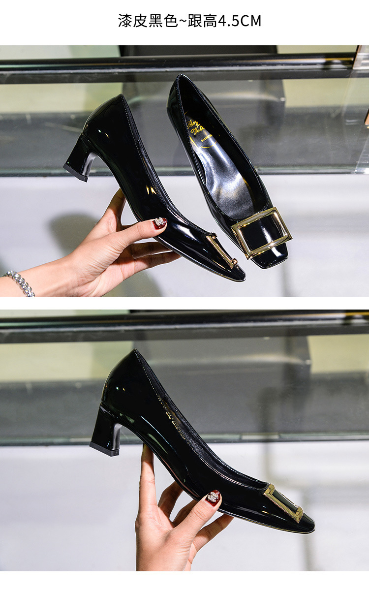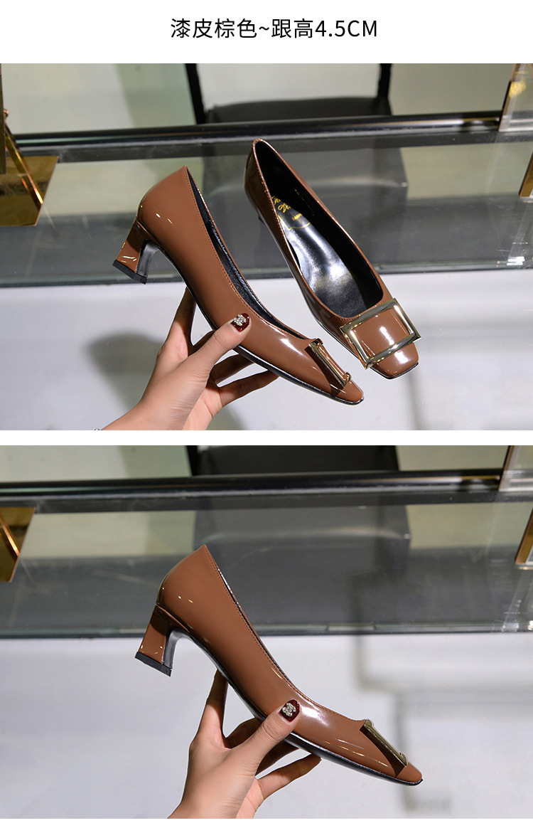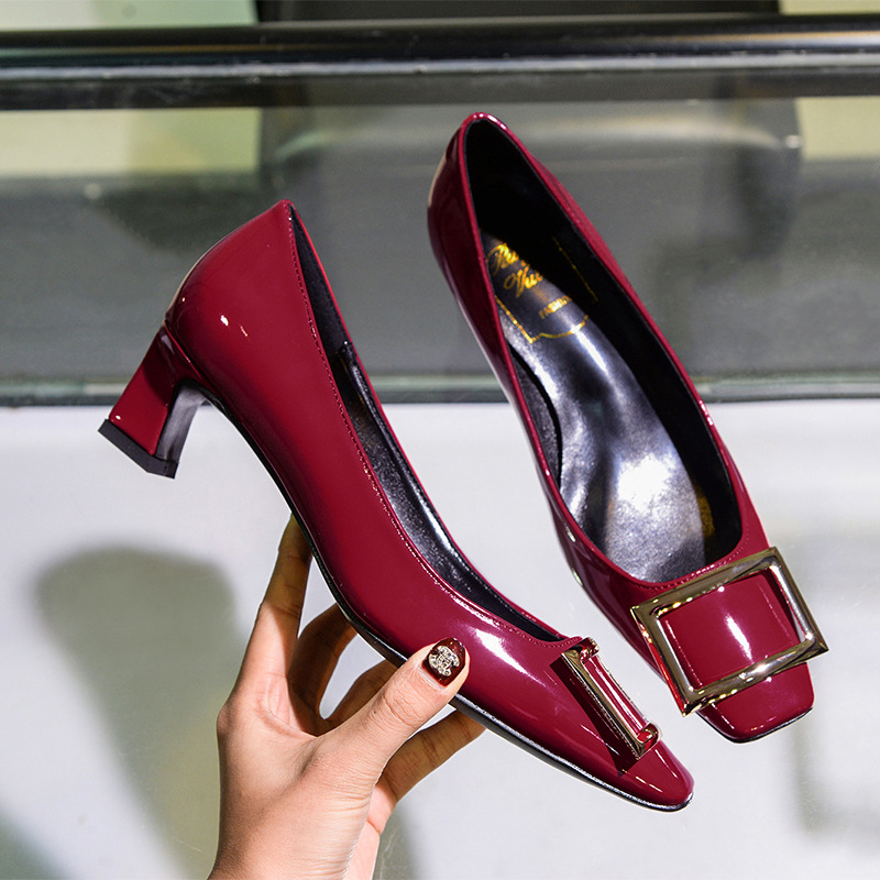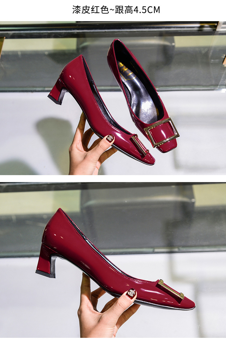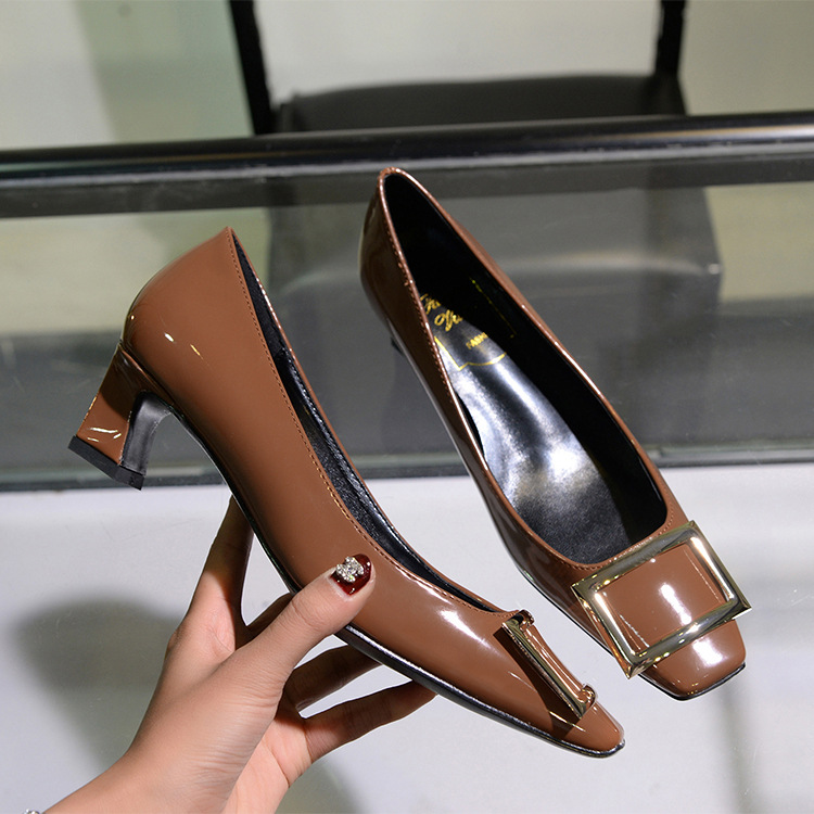 【재고 있음】도매 직배송 사각코 얕은 굽 여성용 스퀘어 버클 두꺼운 굽 페이턴트 가죽 하이힐 OL 워크 슈즈스토어 가기