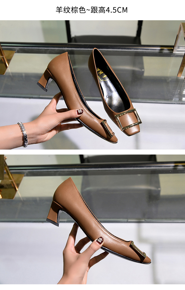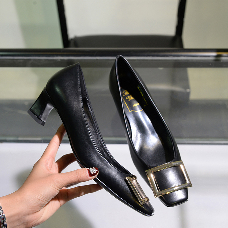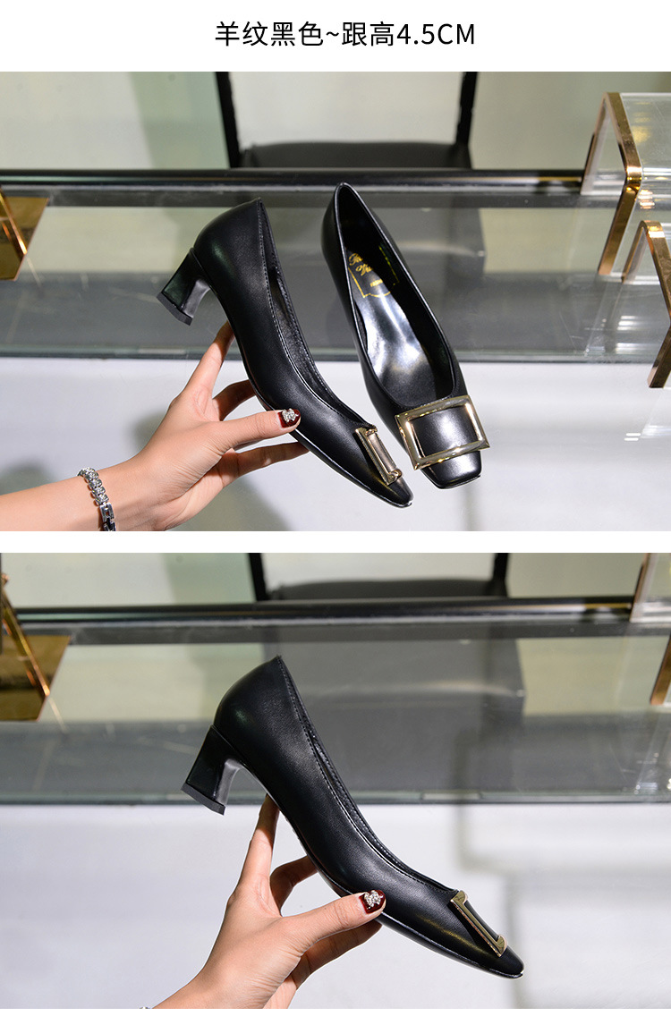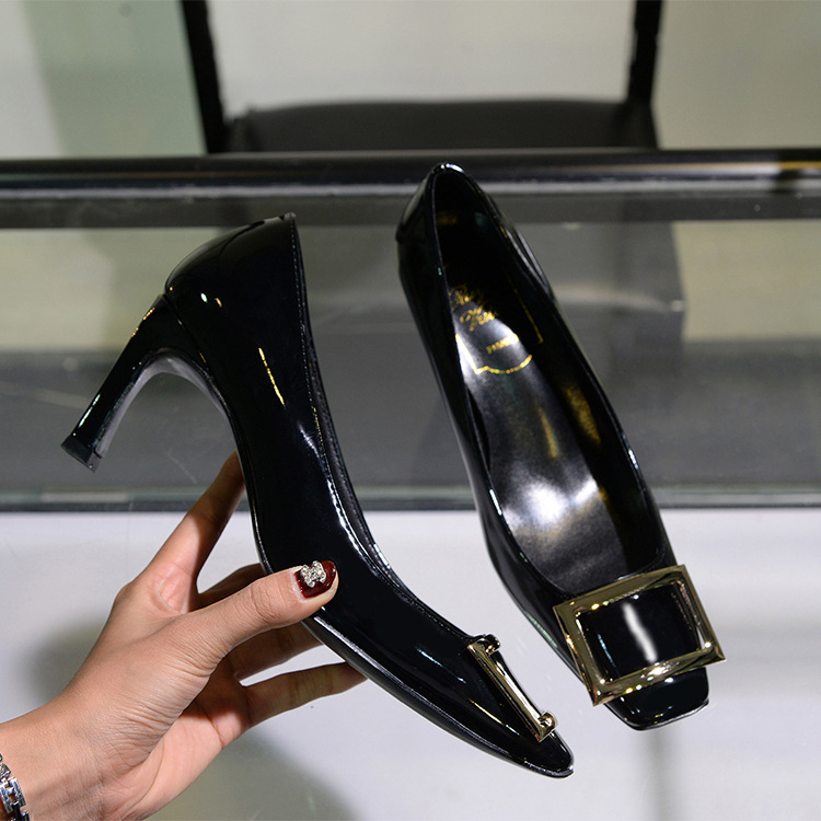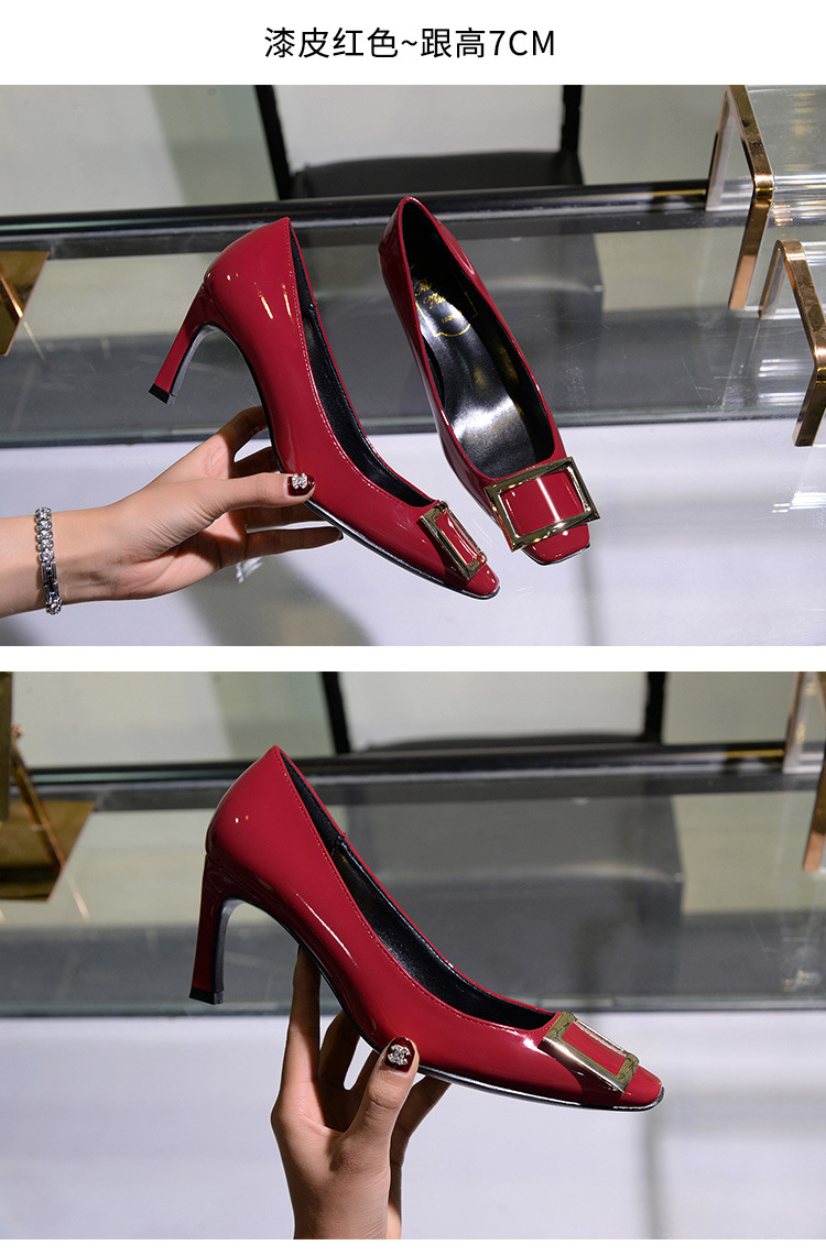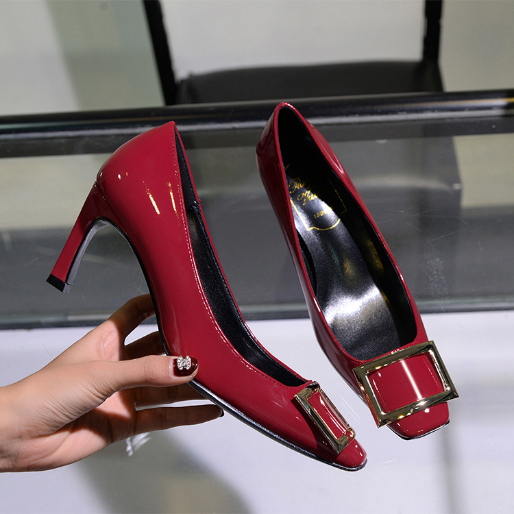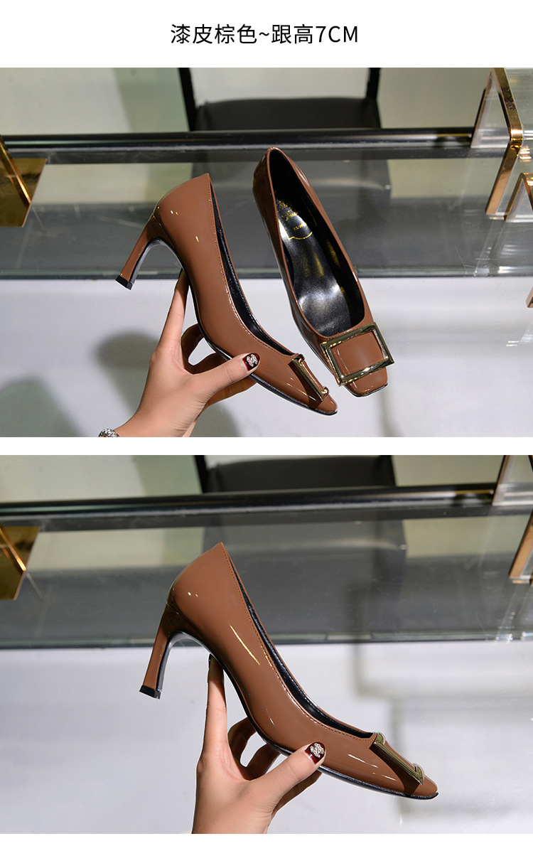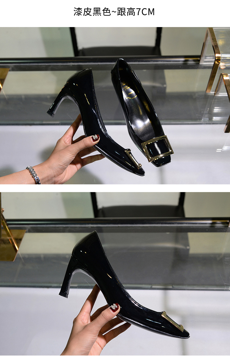 【재고 있음】도매 직배송 사각코 얕은 굽 여성용 스퀘어 버클 두꺼운 굽 페이턴트 가죽 하이힐 OL 워크 슈즈스토어 가기