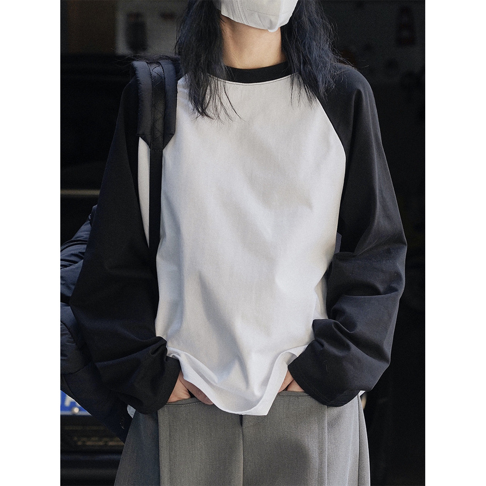 봄 새로운 한국 in 야외 캐주얼 대비 색상 Raglan 긴팔 티셔츠 느슨한 라운드 넥 스티치 여성을위한 편안한 탑