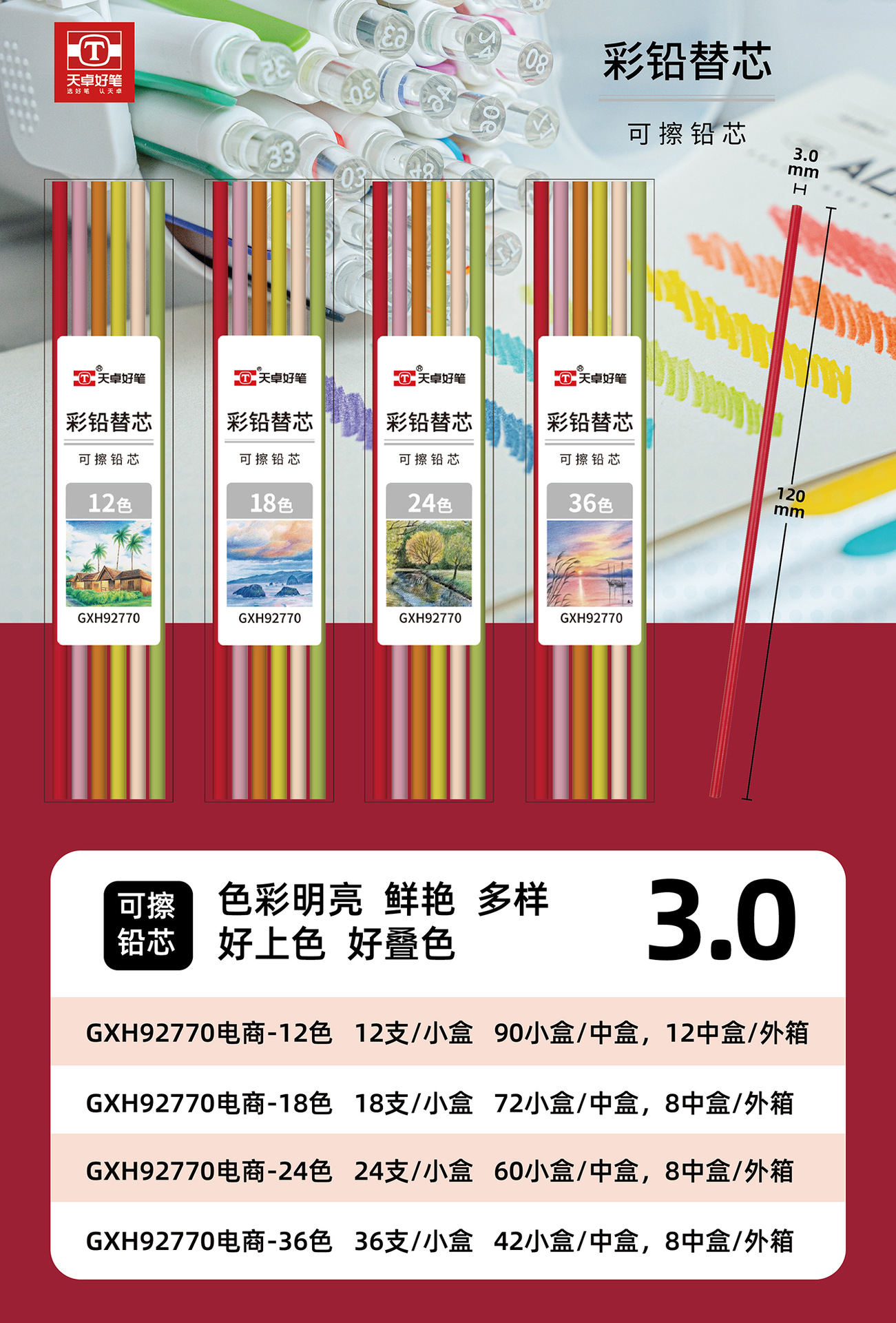 • 92770-12색 3.0mm 연필심 세트 (12개입/펜 아님)