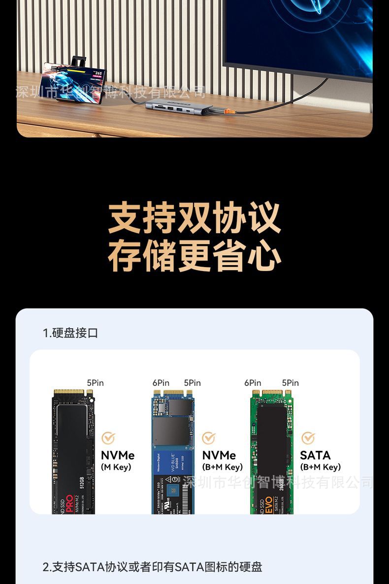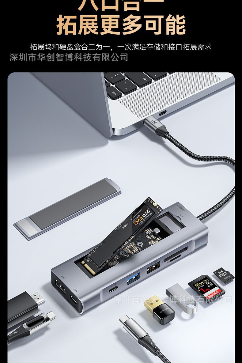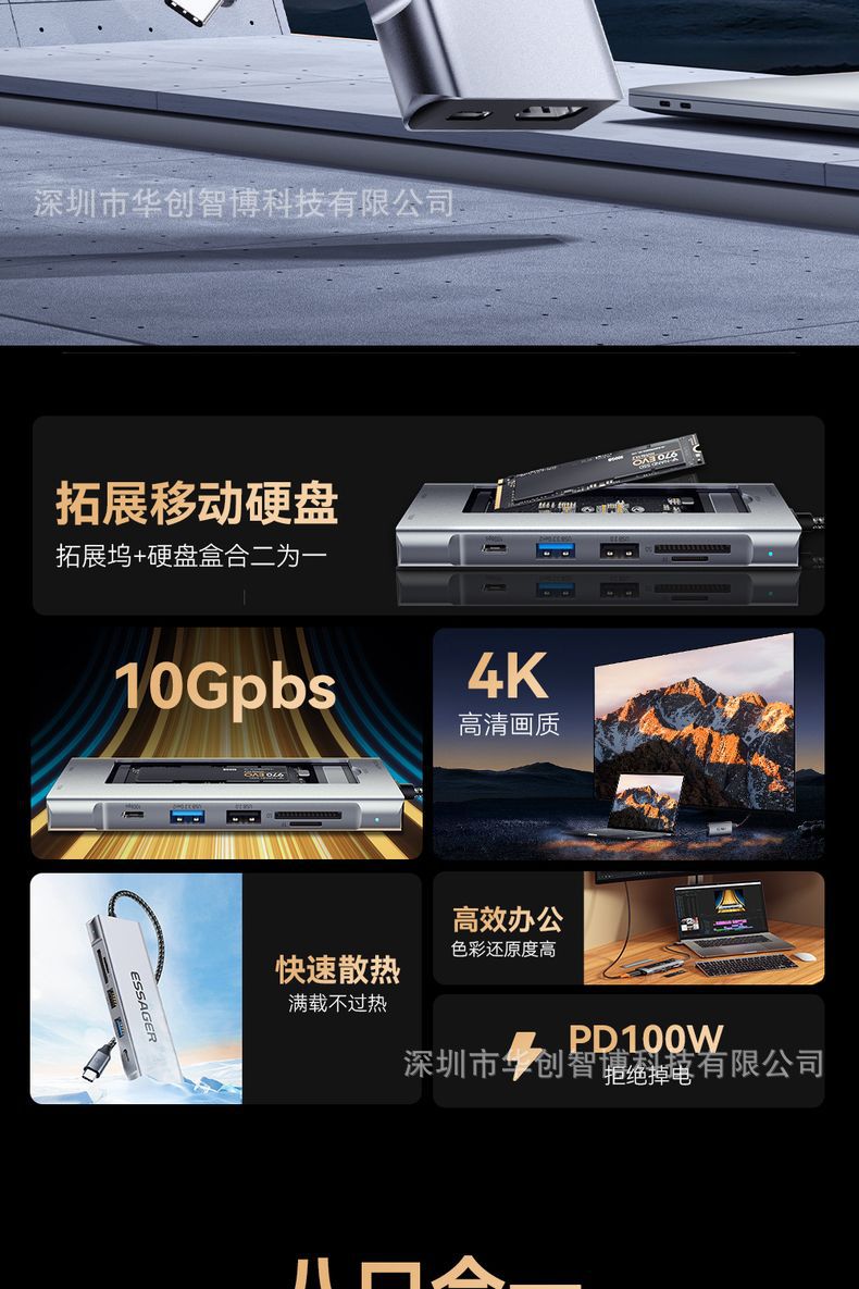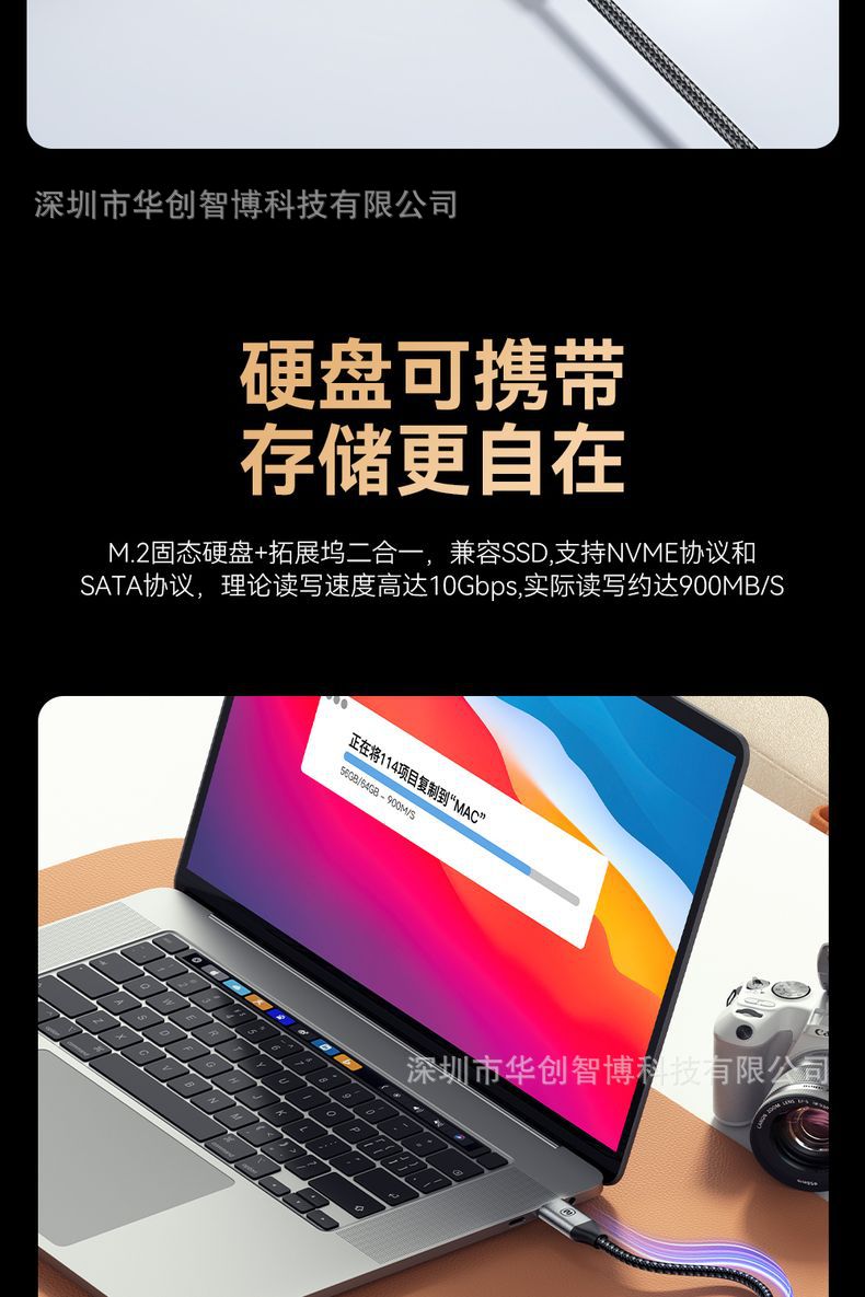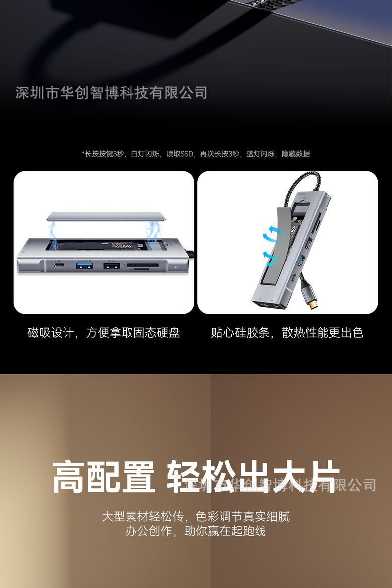 【产品特点】扩展坞和硬盘盒合二为一,4K高清画质,开关设计,一键隐藏硬盘,支持PD100W快充,多项测试,性能稳定。