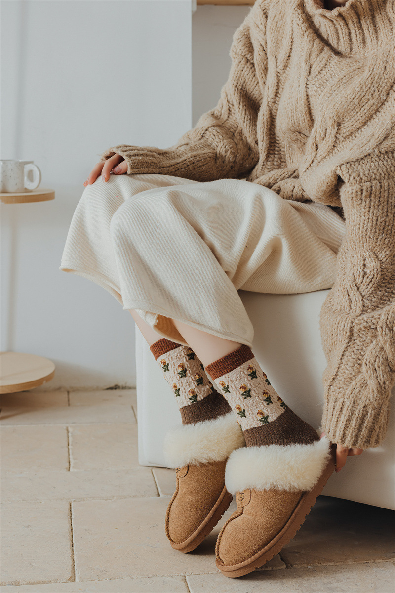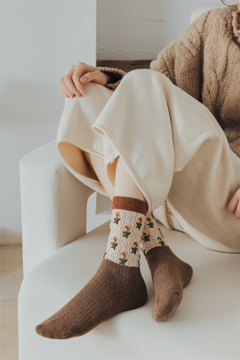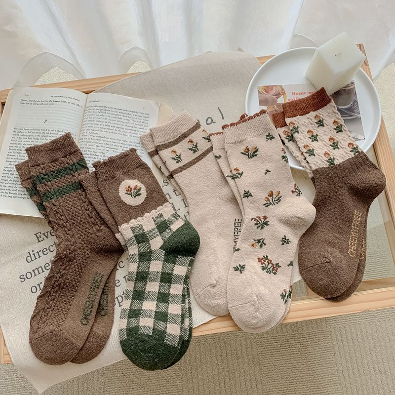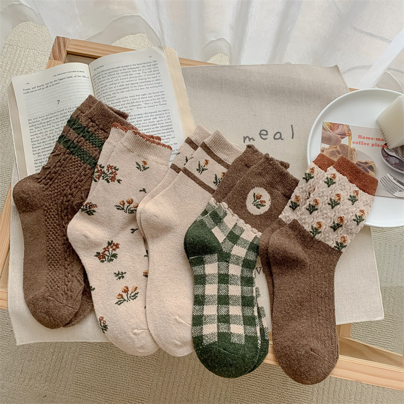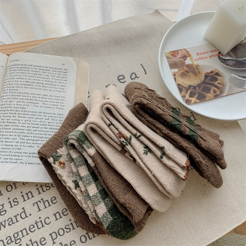 2022 겨울 새로운 스타일 양말 여성용 카키스 꽃 격자 무늬 울 미드 튜브 여성용 양말 여성용 슈퍼 투과 따뜻한 더미 양말
