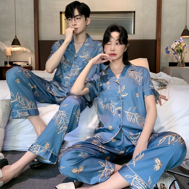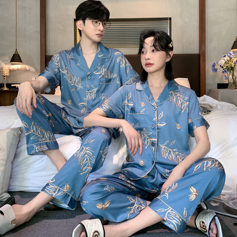 남성과 여성을위한 새로운 고급 인쇄 커플의 가정 의류 세트 잠옷 여름 아이스 실크 반팔 바지