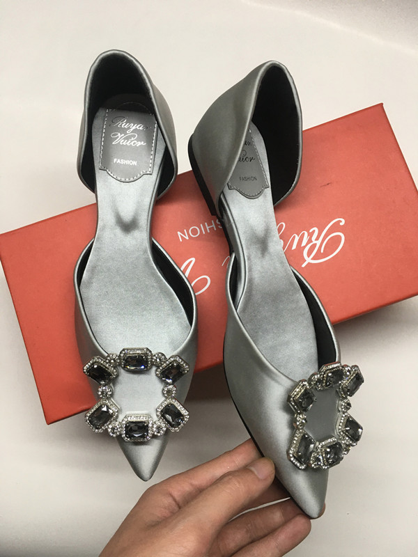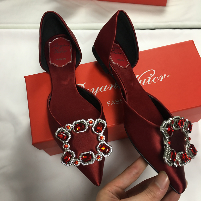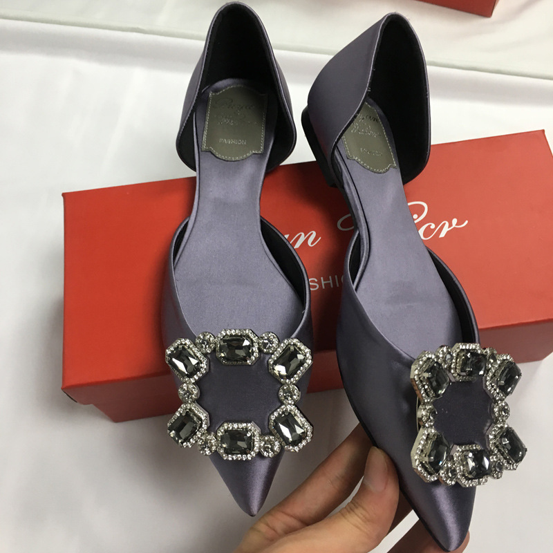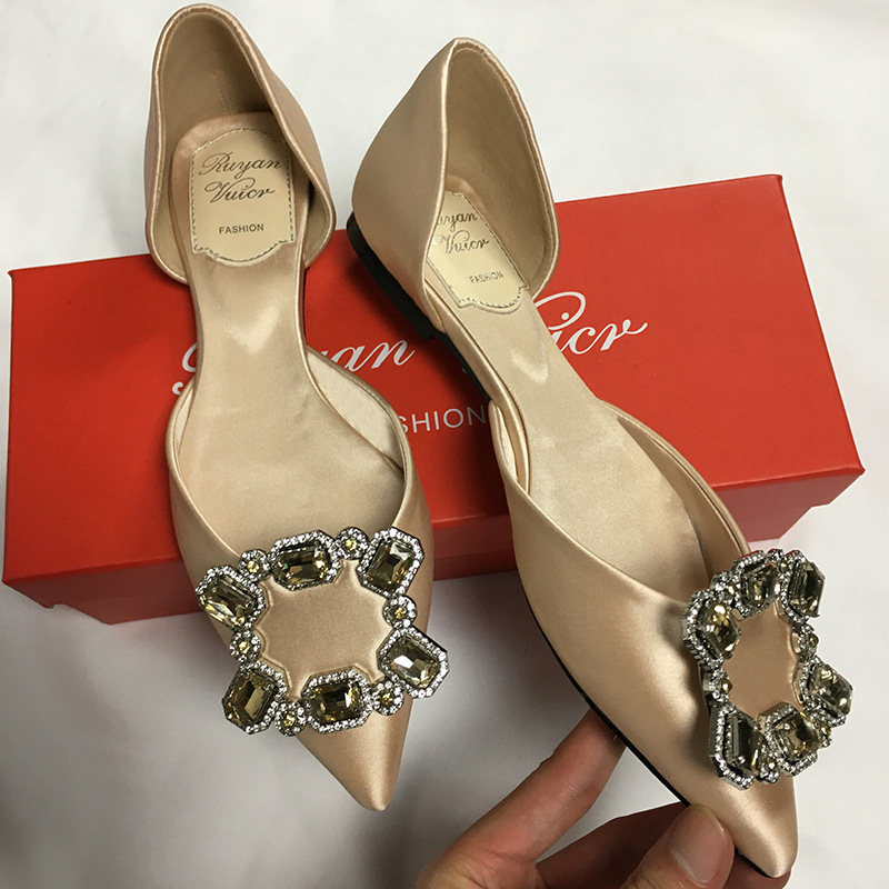 [재고] 머리 뾰족한 플랫 슈즈 여성 rv 모조 다이아몬드 스퀘어 버클 중공 새틴 얕은 신발의 세대