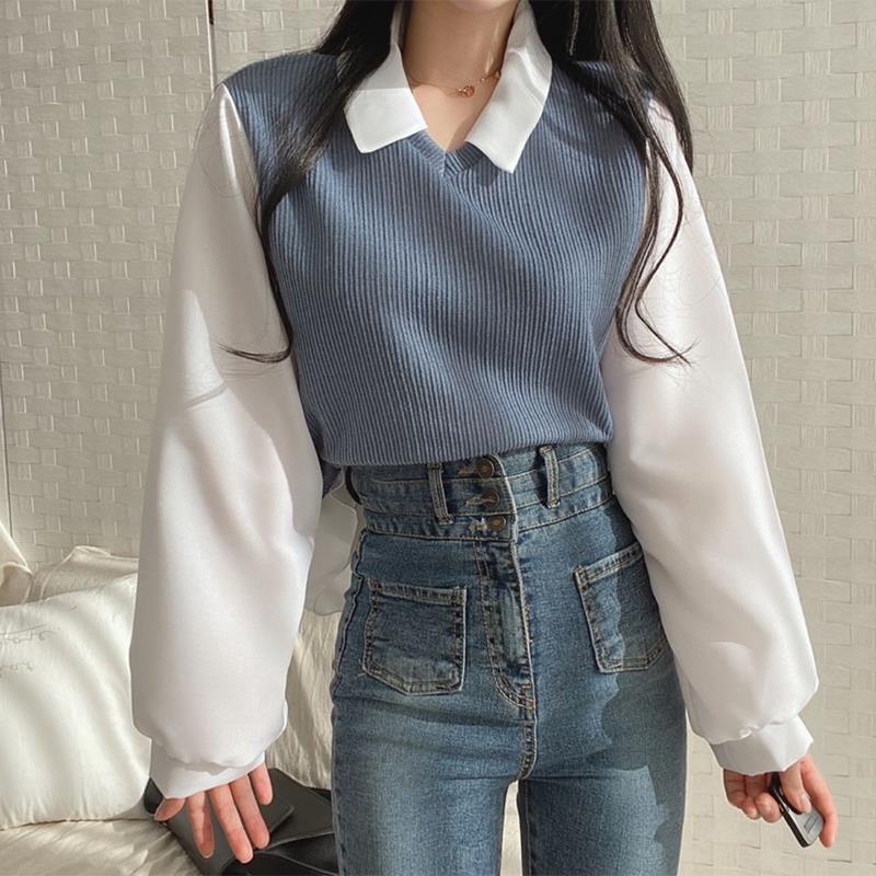 2023大码胖mm假两件T恤女拼接POLO领长袖卫衣螺纹宽松百搭上衣