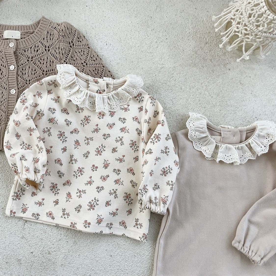 한국 스타일 아동복 아기 봄과 가을 면 부드러운 레이스 칼라 꽃 단색 베이스 셔츠 티셔츠 아기 모든 일치 코튼 탑