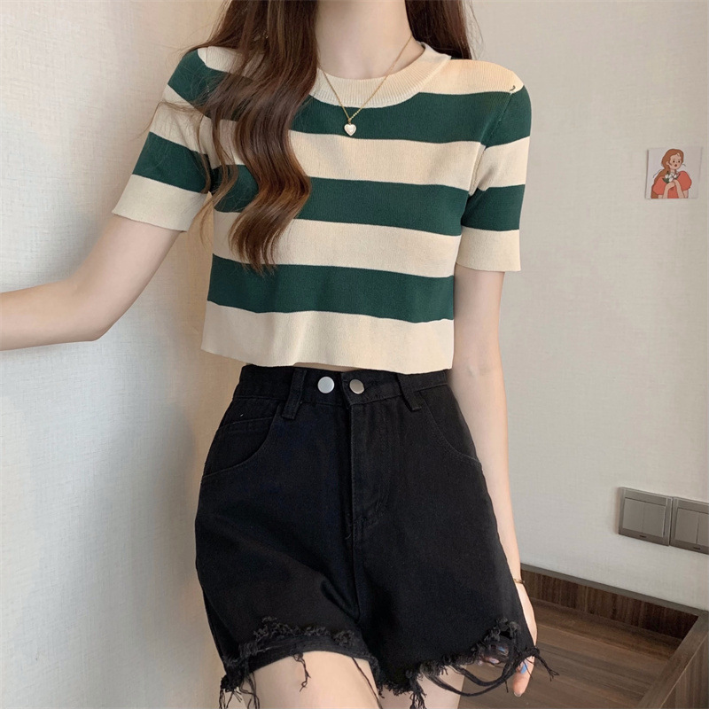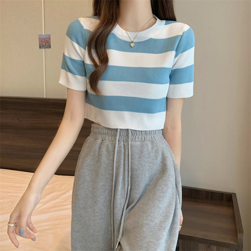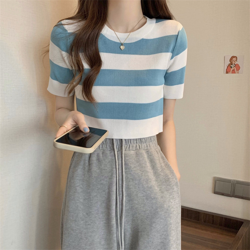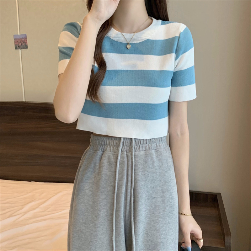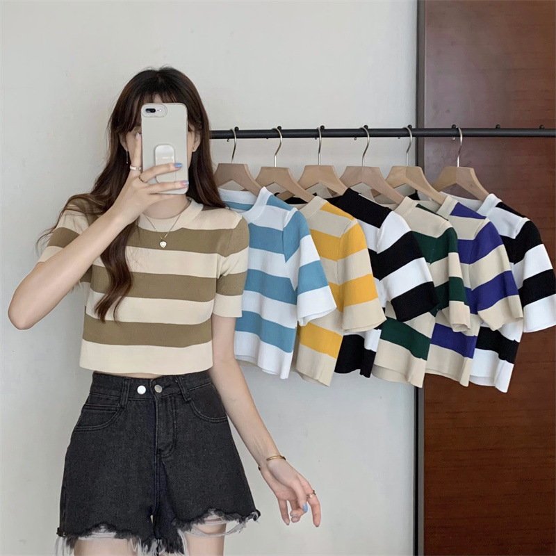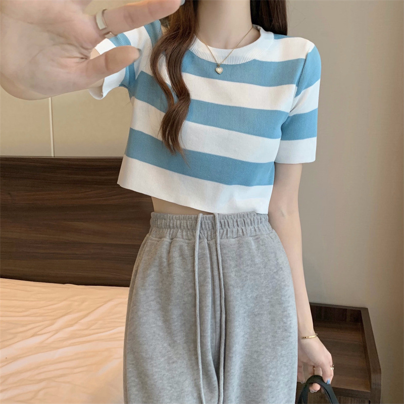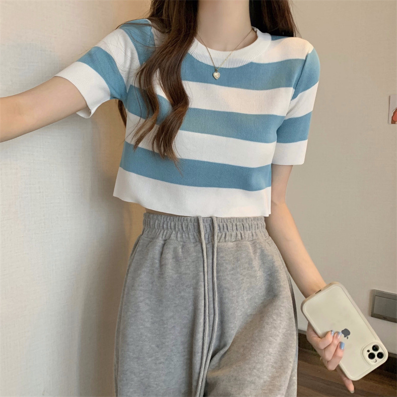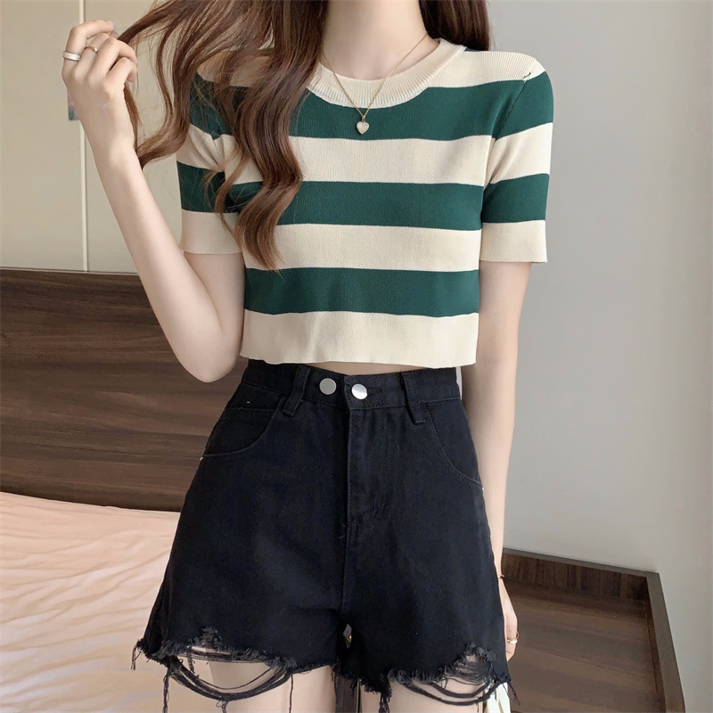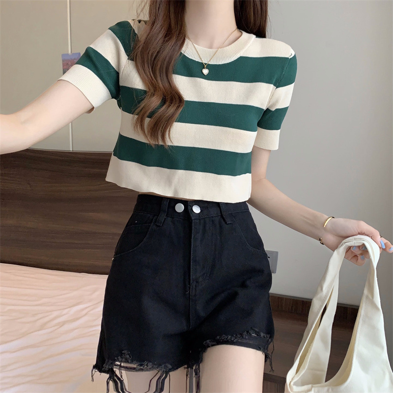 한국식 라운드 넥 스트라이프 티셔츠 여성용 2023 여름 배꼽 하이 웨이스트 니트 반팔 우아한 슬림핏 숏탑스토어 가기