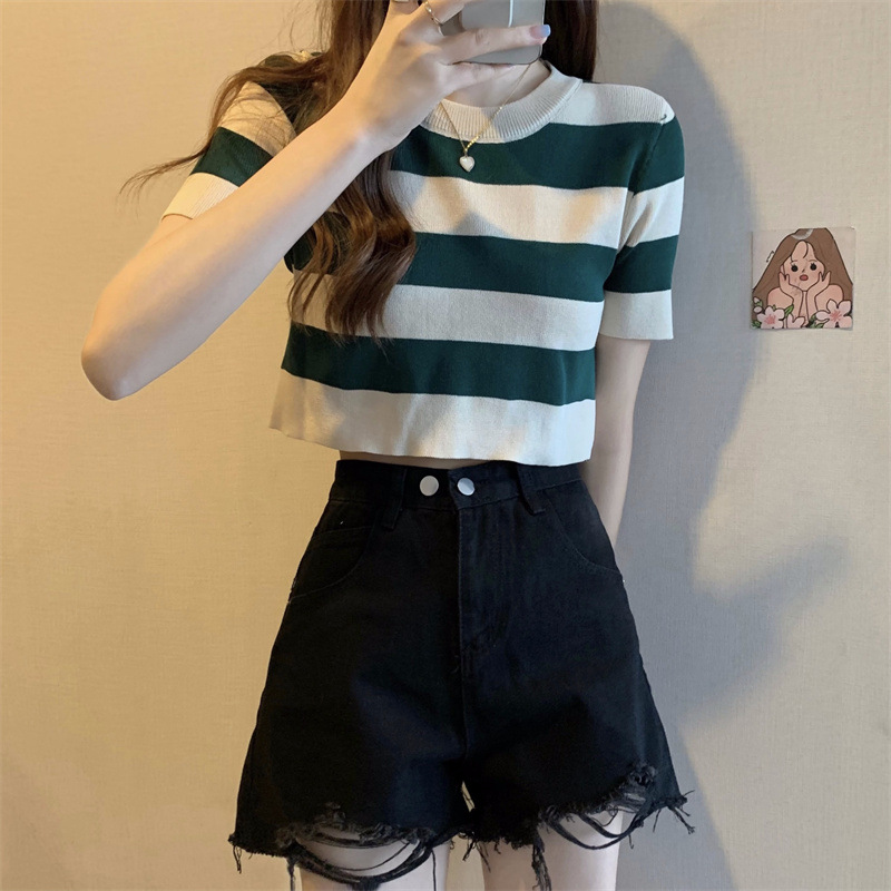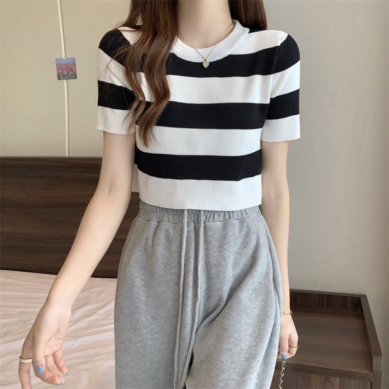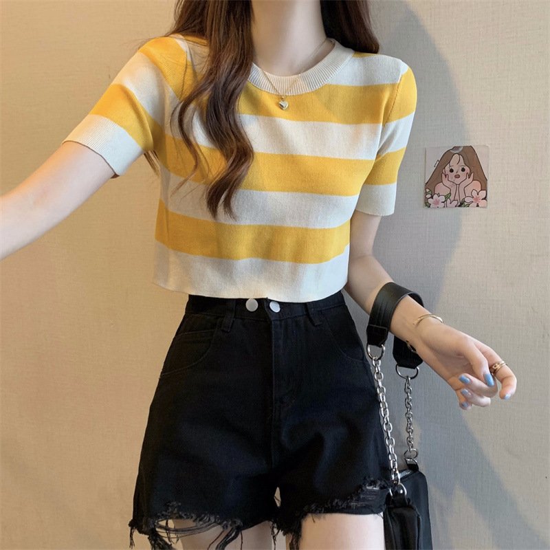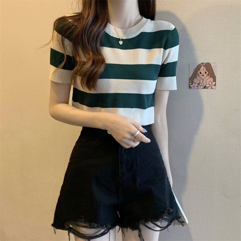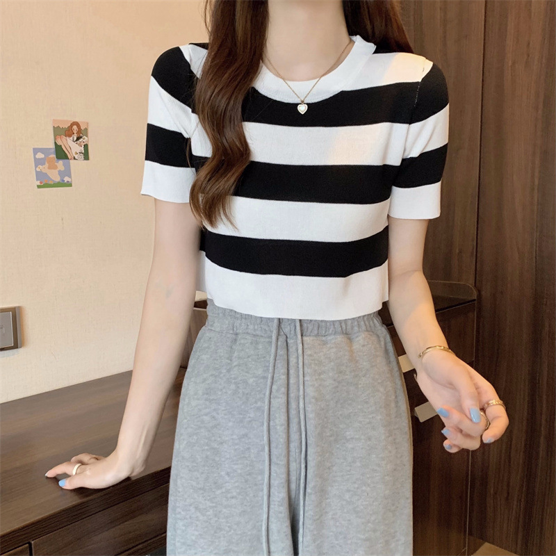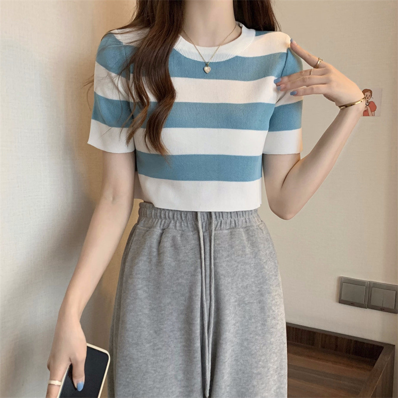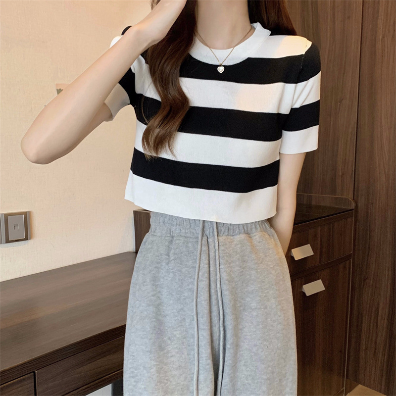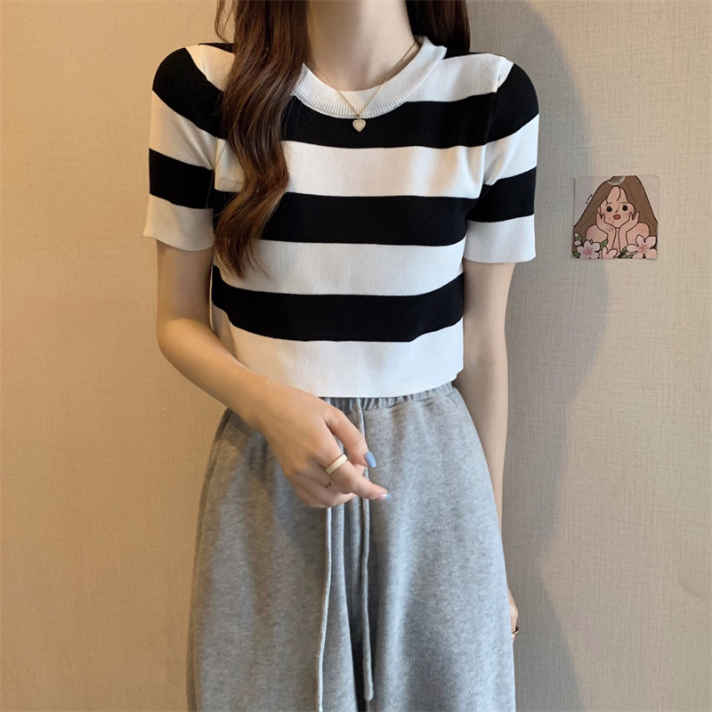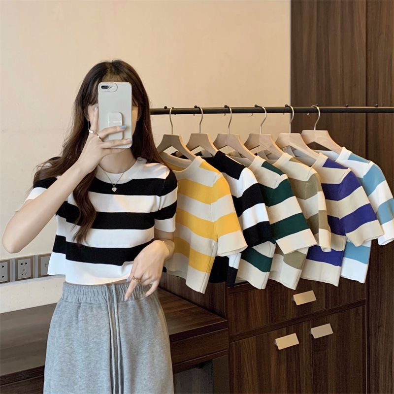 한국식 라운드 넥 스트라이프 티셔츠 여성용 2023 여름 배꼽 하이 웨이스트 니트 반팔 우아한 슬림핏 숏탑스토어 가기