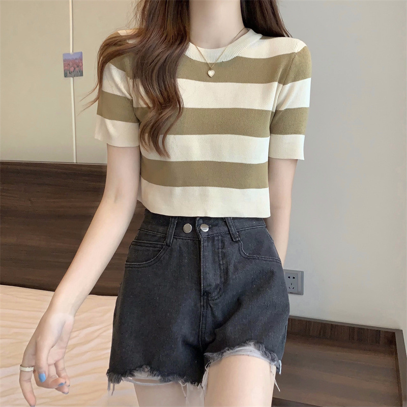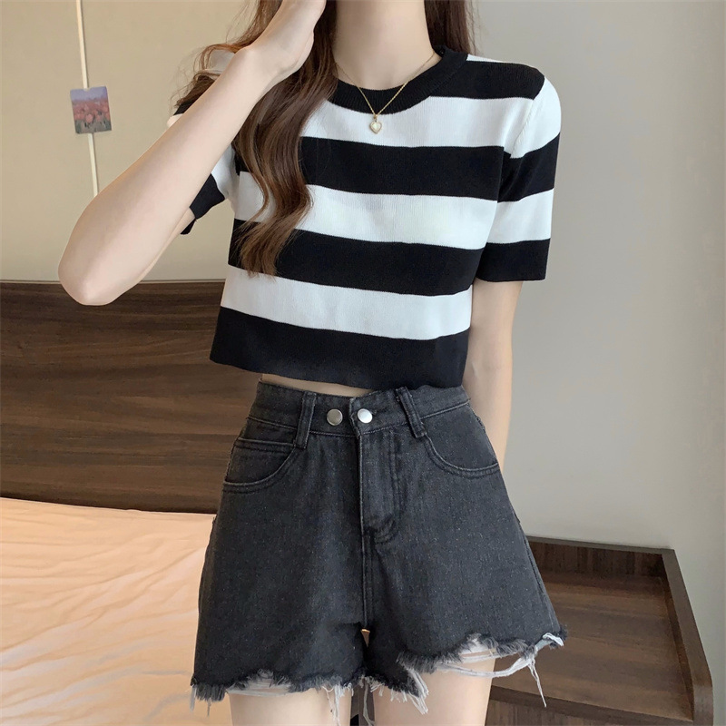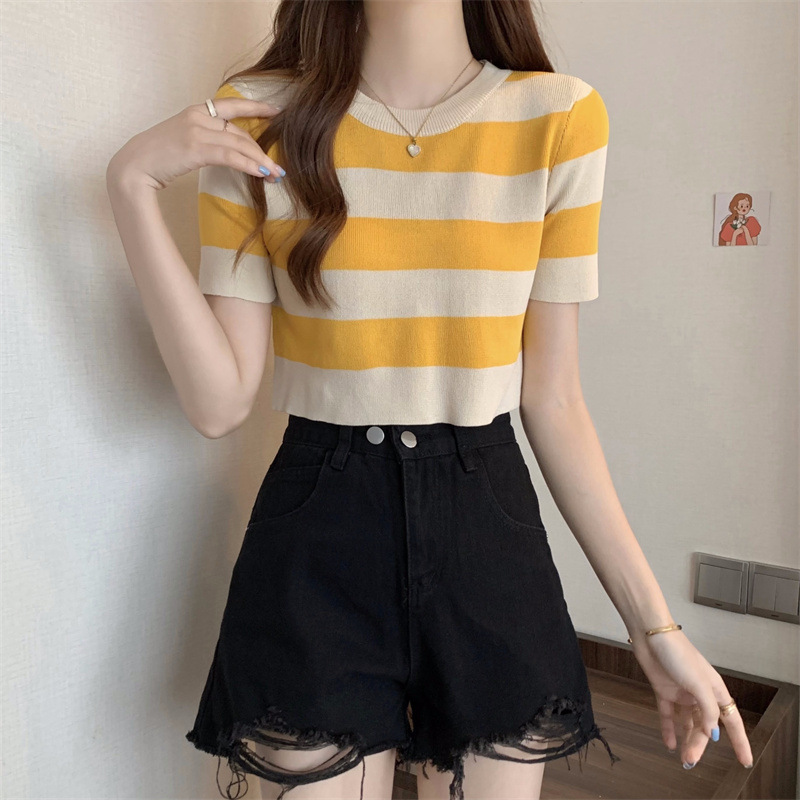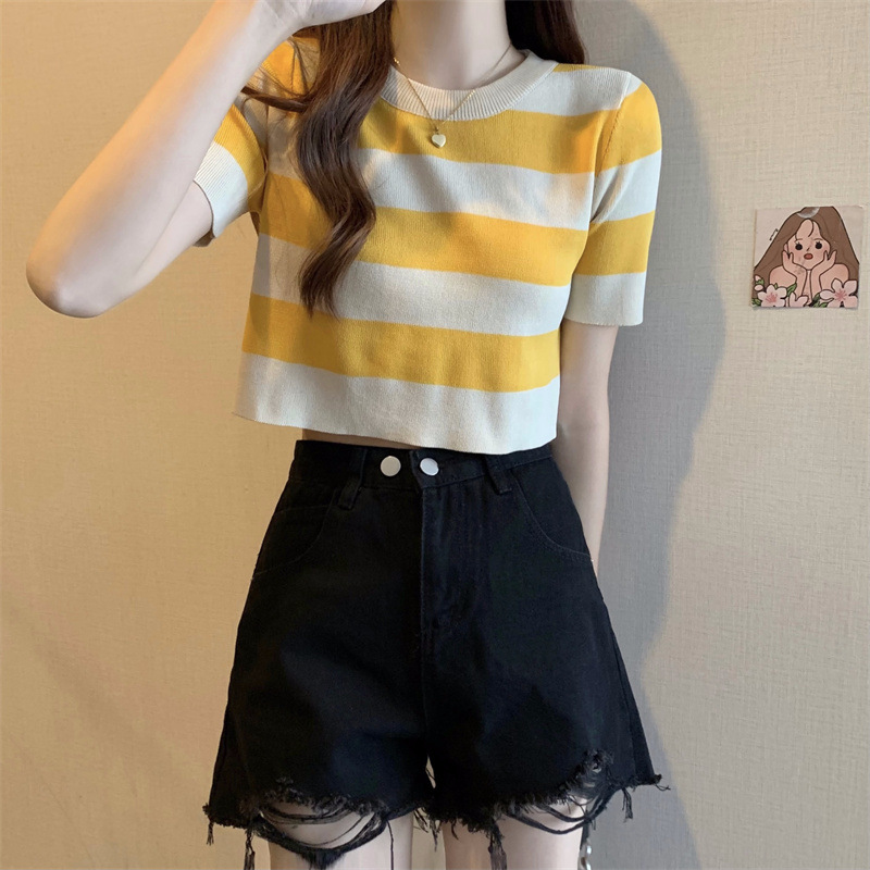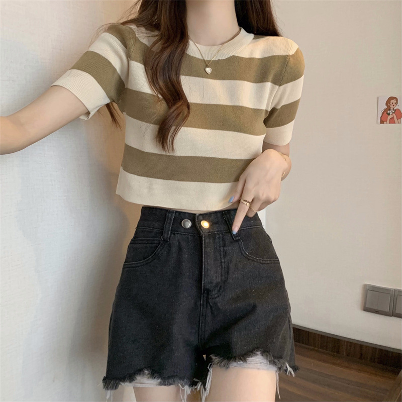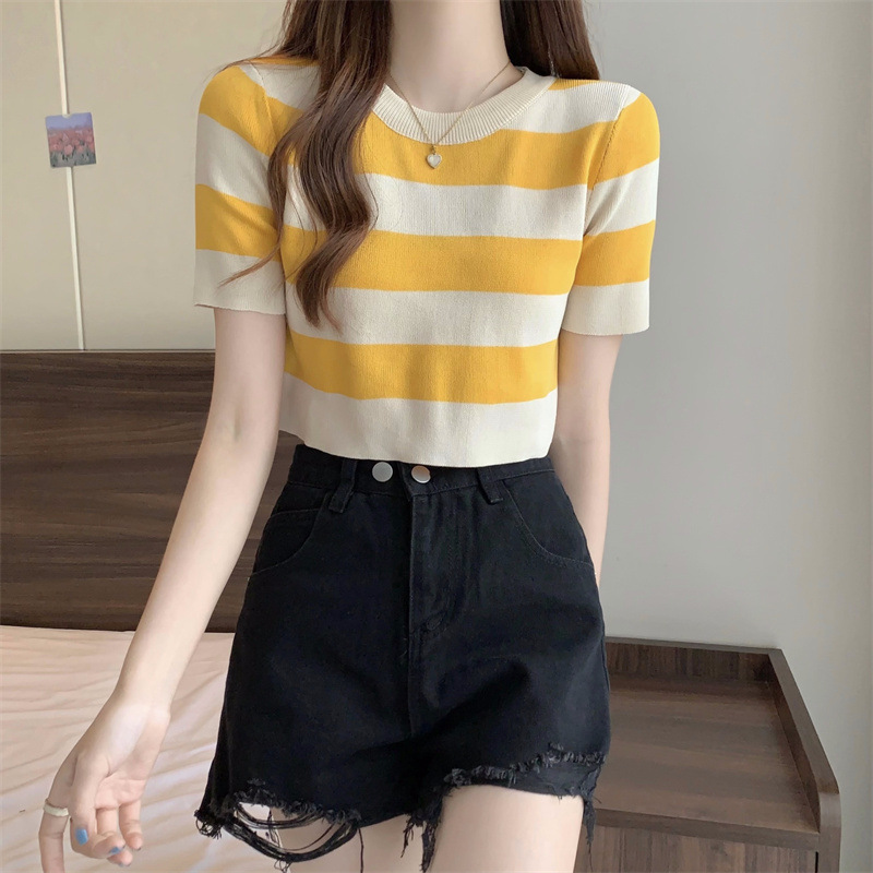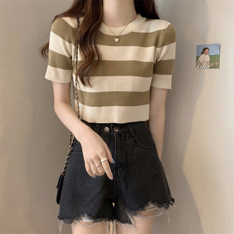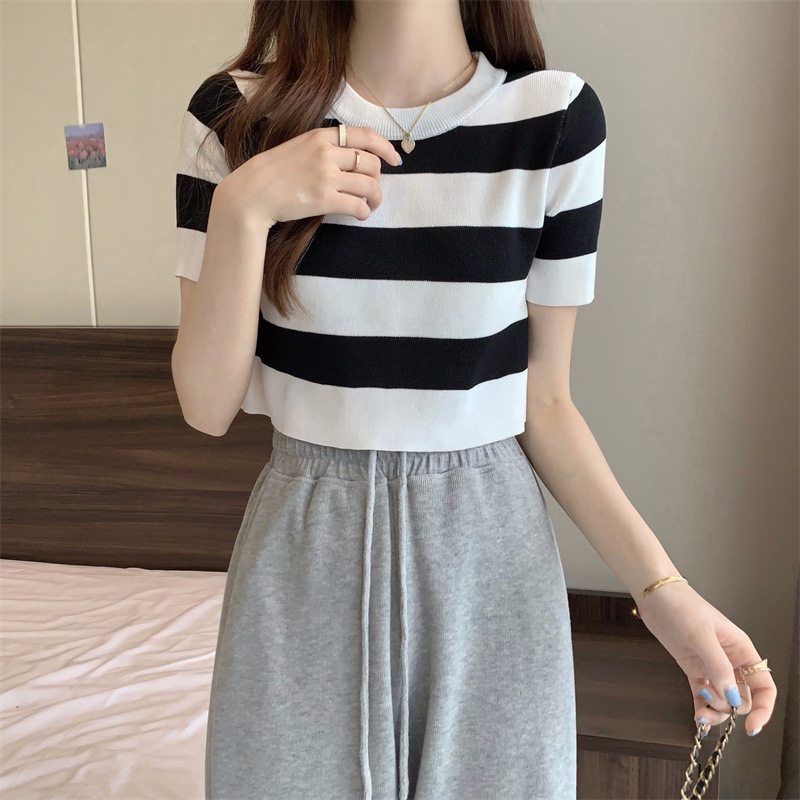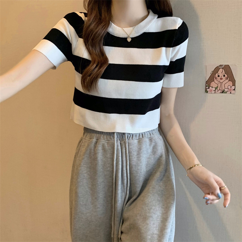 한국식 라운드 넥 스트라이프 티셔츠 여성용 2023 여름 배꼽 하이 웨이스트 니트 반팔 우아한 슬림핏 숏탑스토어 가기