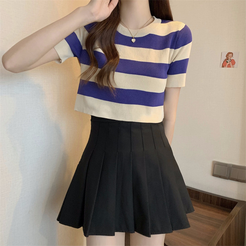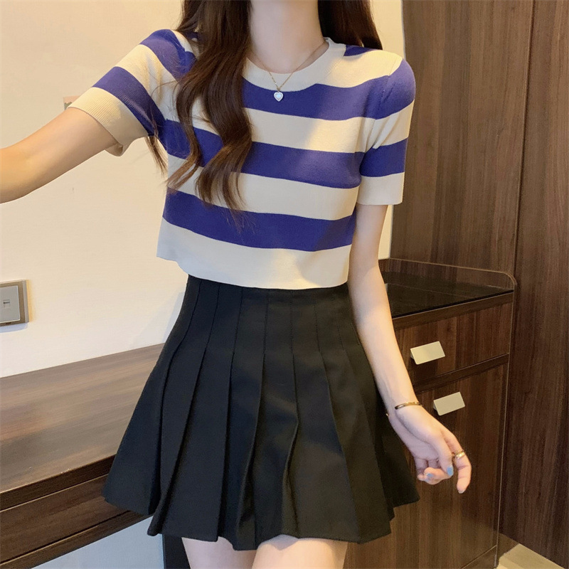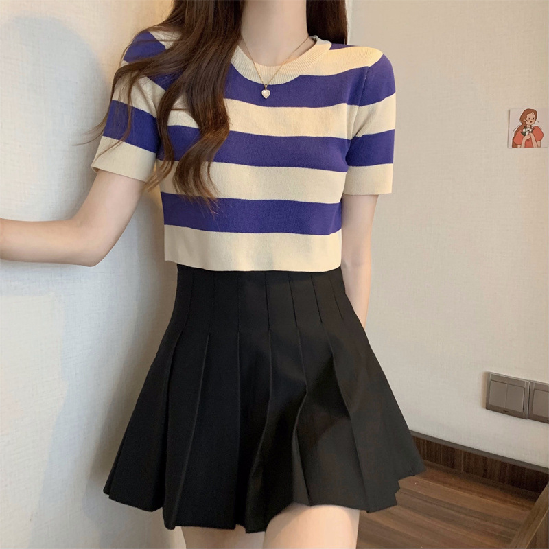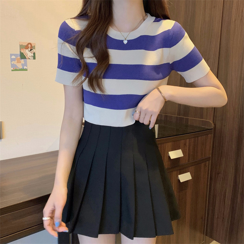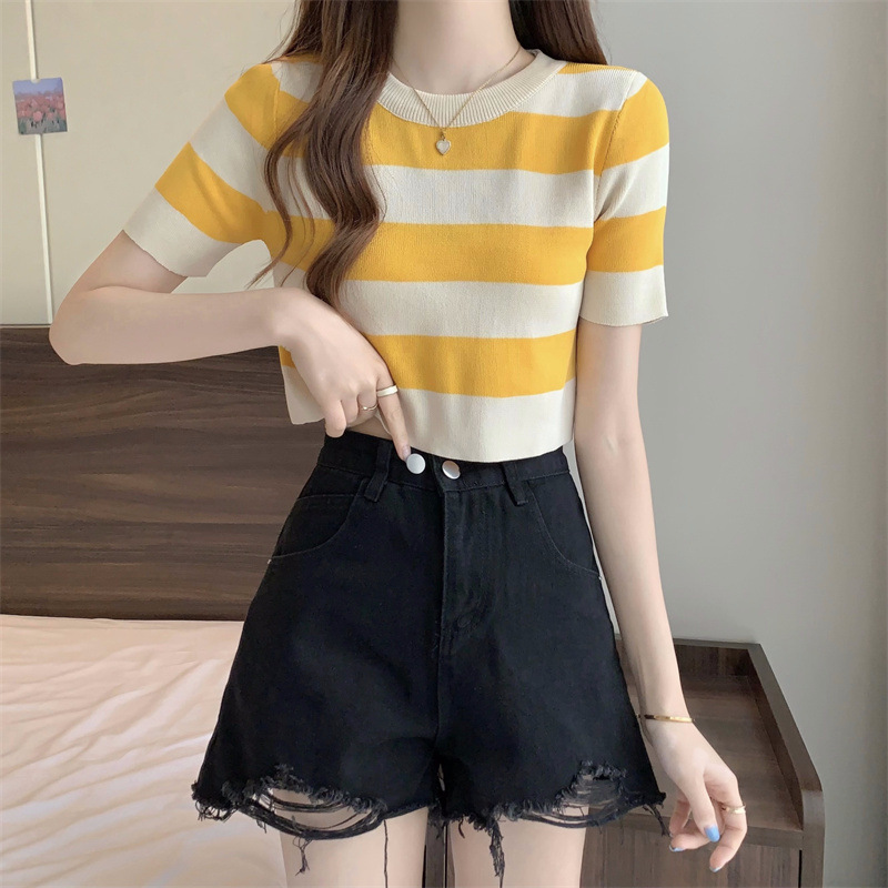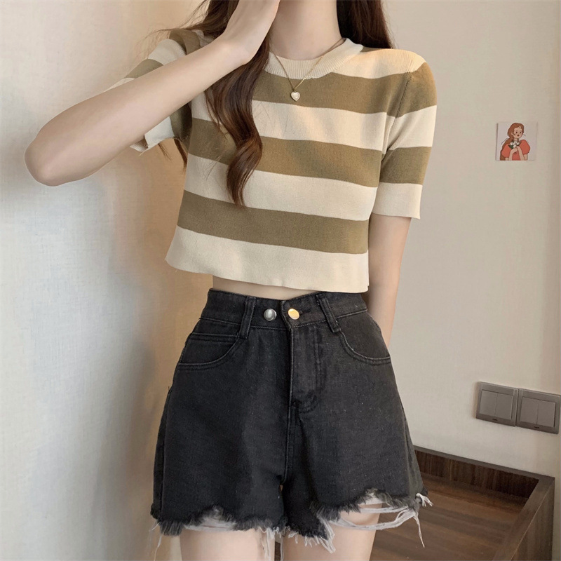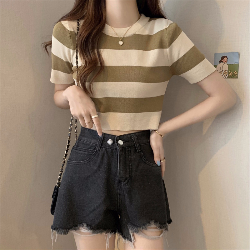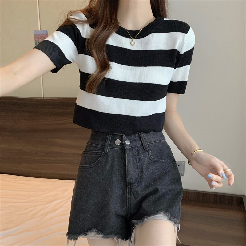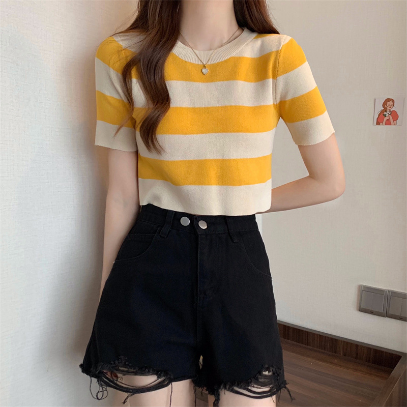 한국식 라운드 넥 스트라이프 티셔츠 여성용 2023 여름 배꼽 하이 웨이스트 니트 반팔 우아한 슬림핏 숏탑스토어 가기
