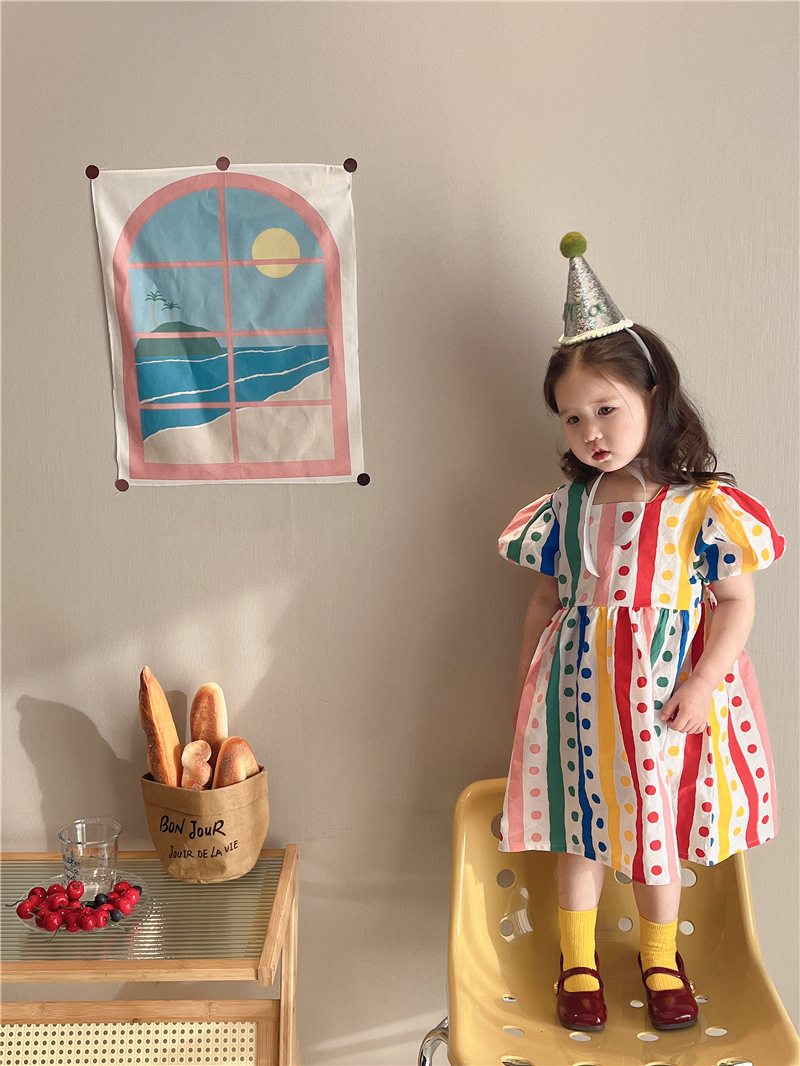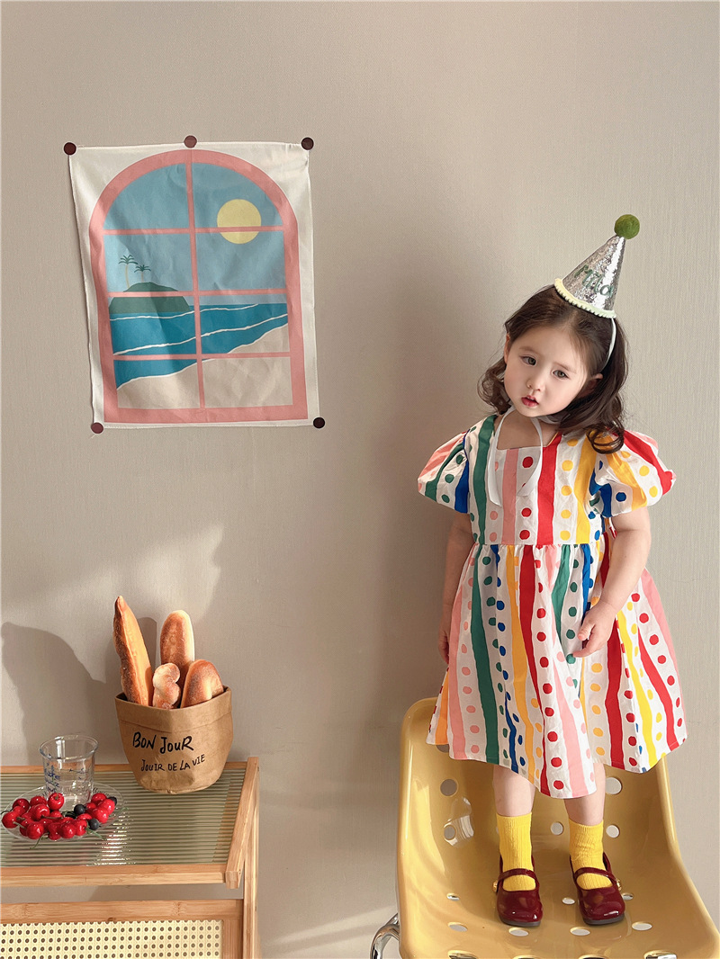 봄/여름 2023 ~ 한국어 버전의 여자 신중한 기계 다시 중공 매듭 컬러 물방울 무늬 스트라이프 버블 슬리브 원피스