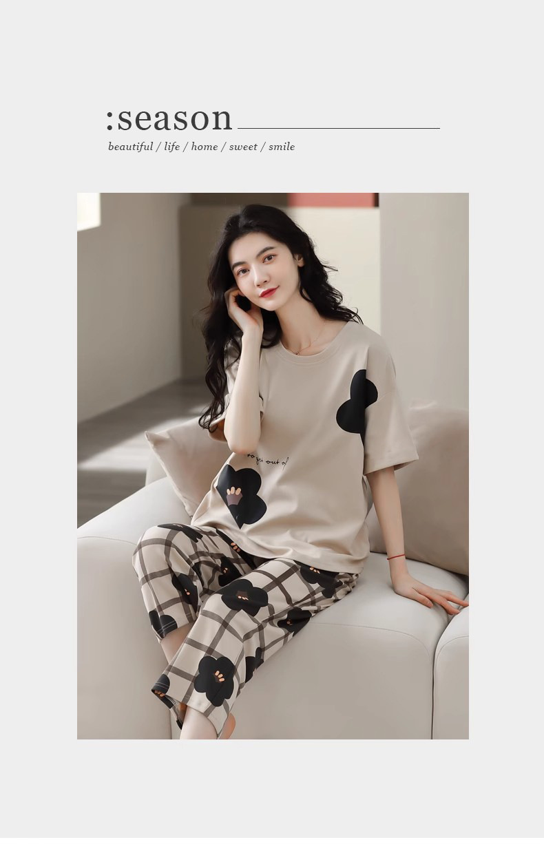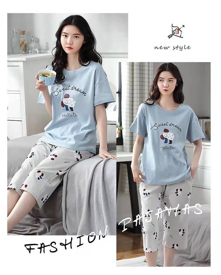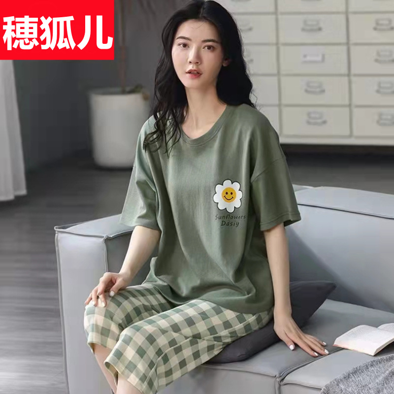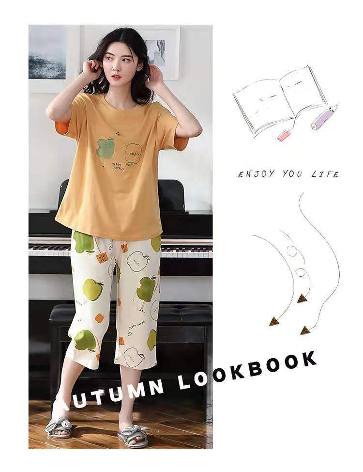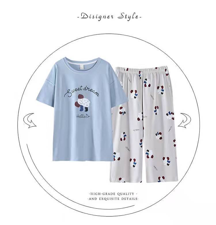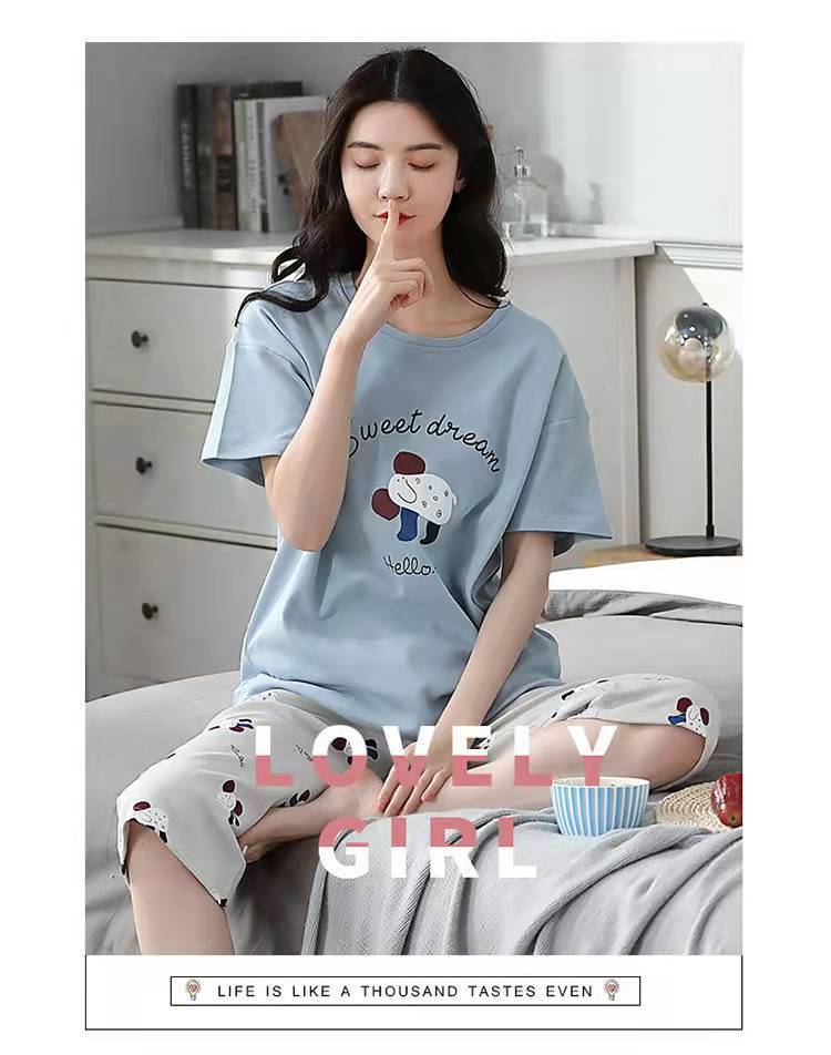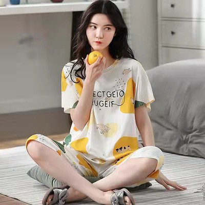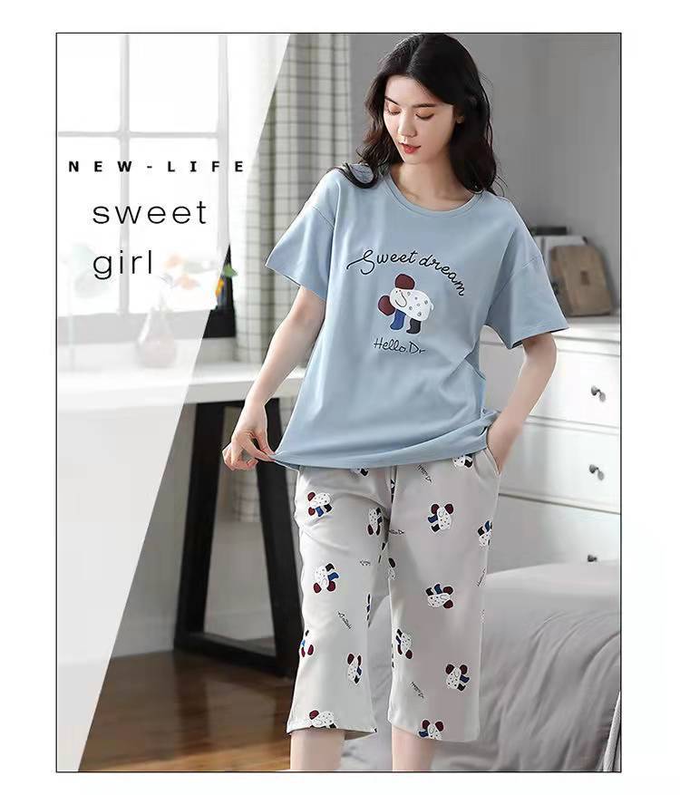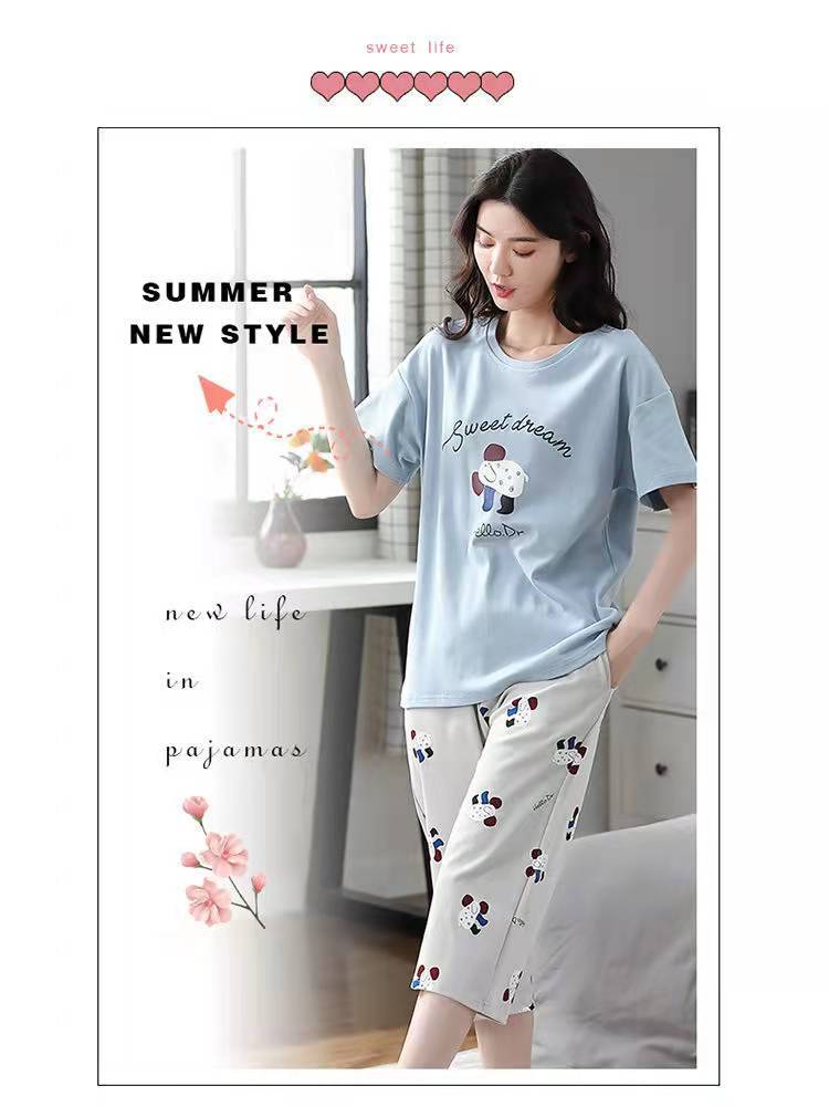 도매 잠옷 여자 여름 반팔 자른 바지 가정복 여름 얇은 한국 수 외출 캐주얼 2 피스 세트스토어 가기