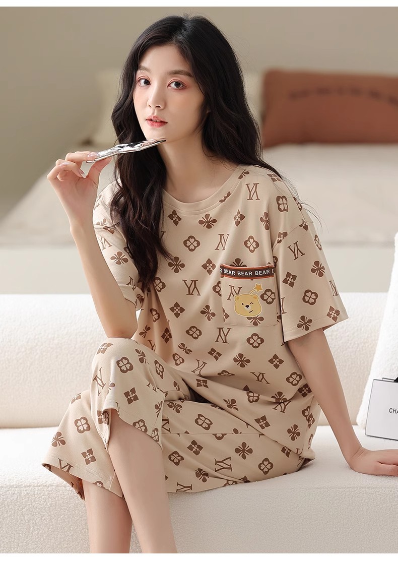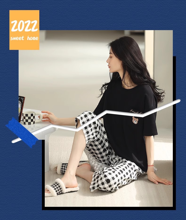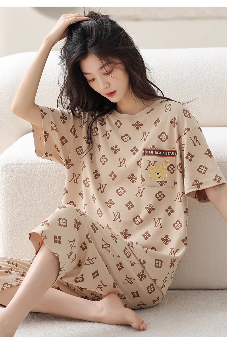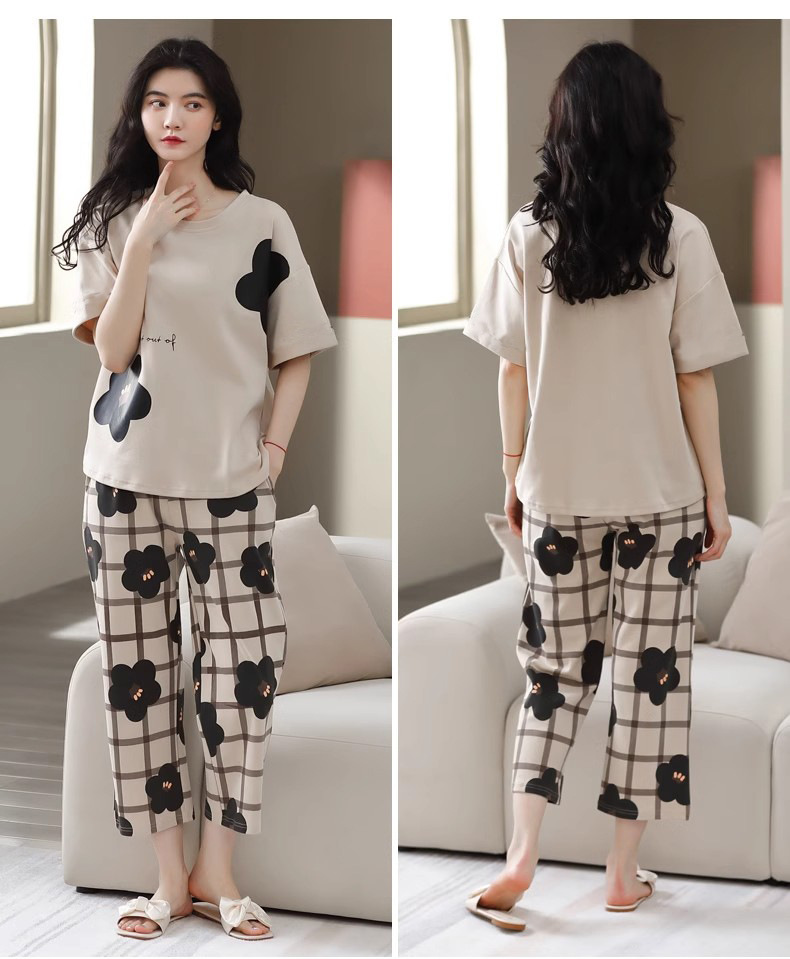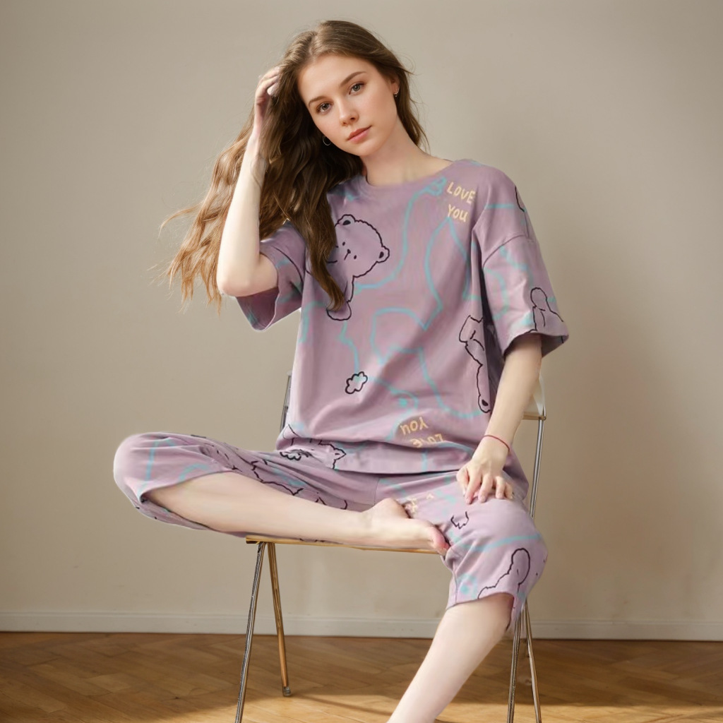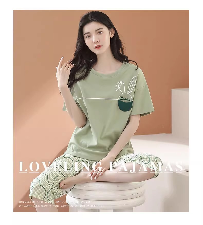 도매 잠옷 여자 여름 반팔 자른 바지 가정복 여름 얇은 한국 수 외출 캐주얼 2 피스 세트스토어 가기