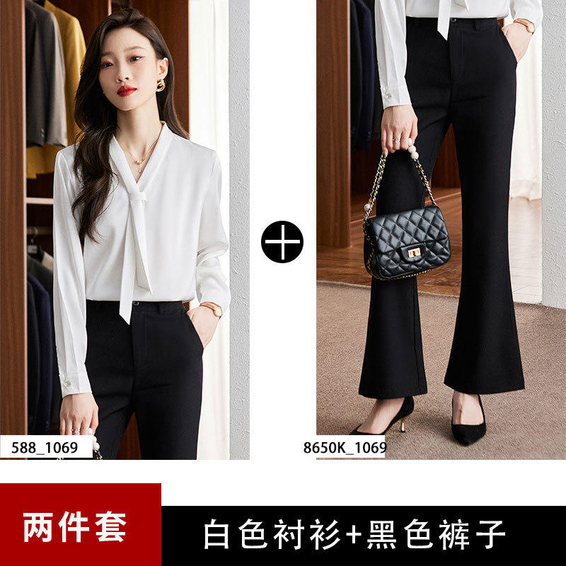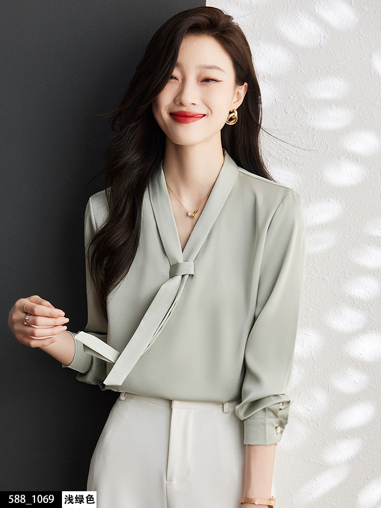 라이트 그린 리본 셔츠 여자의 디자인 감각 틈새 봄과 가을 긴 소매 2023 새로운 봄 V-넥 쉬폰 화이트 셔츠스토어 가기