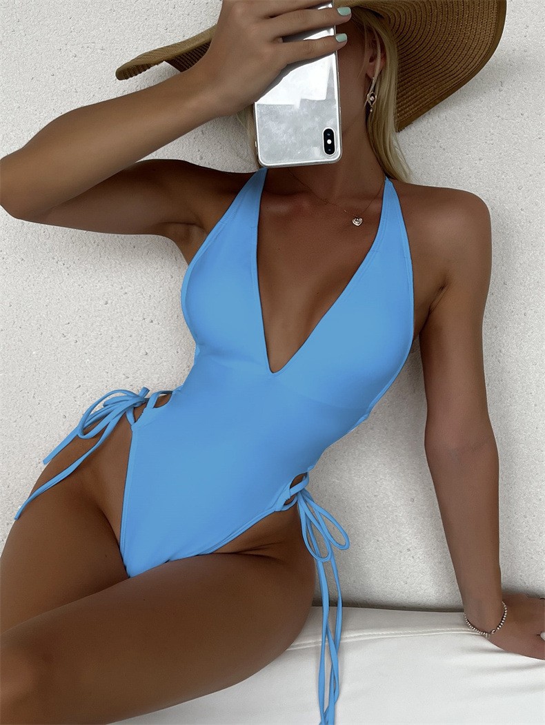 아마존 국경 대외 무역 수영복 2024 새로운 유럽과 미국의 단색 레이스 업 백리스 섹시한 원피스 수영복 비키니