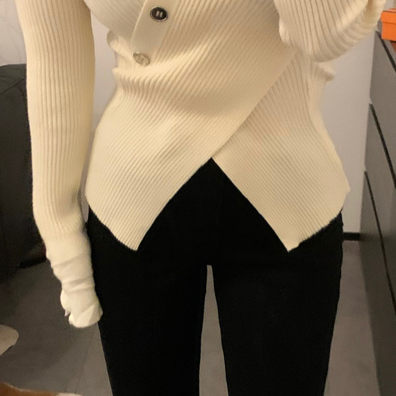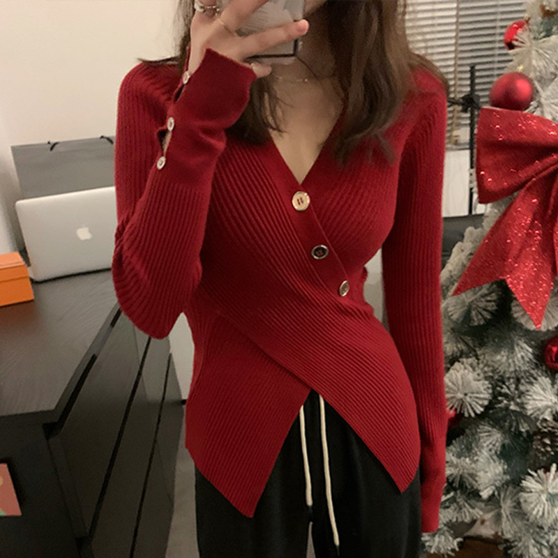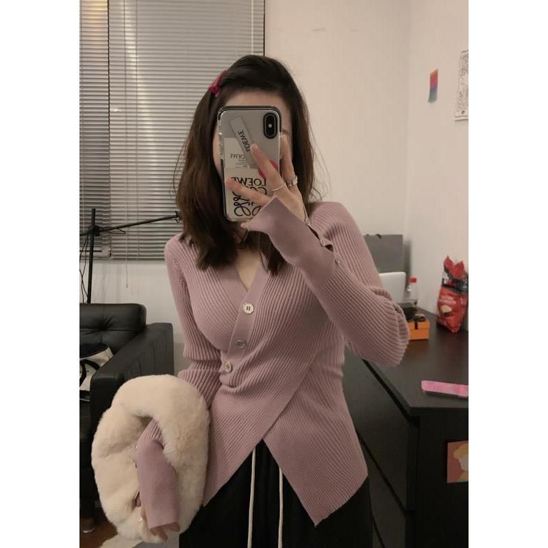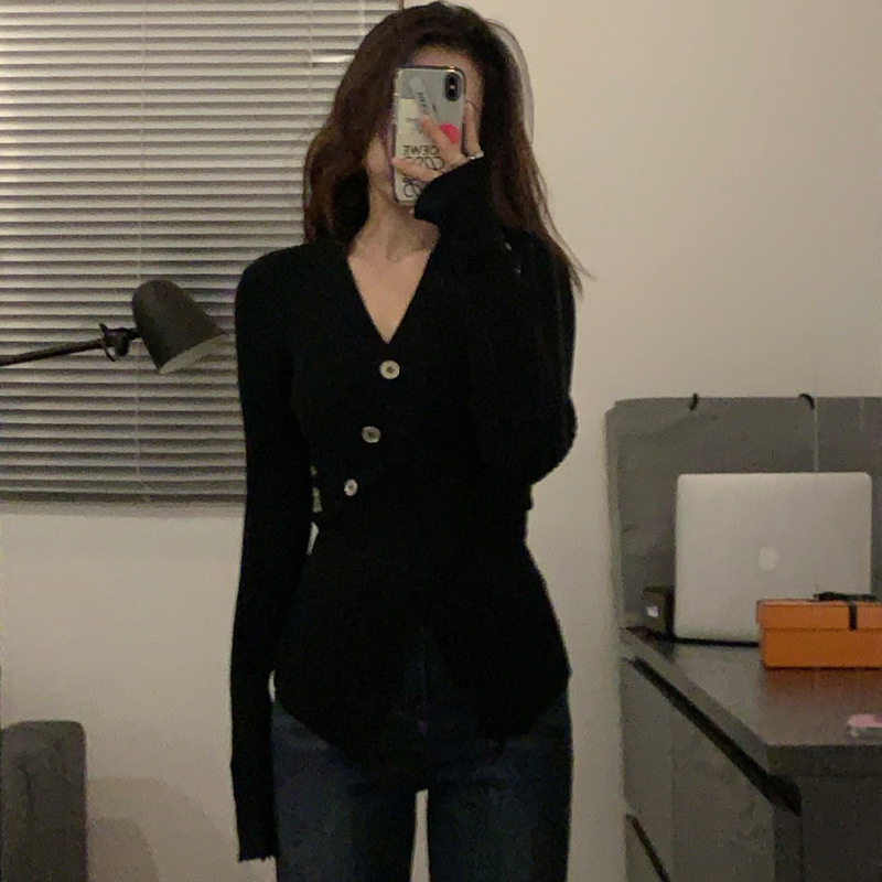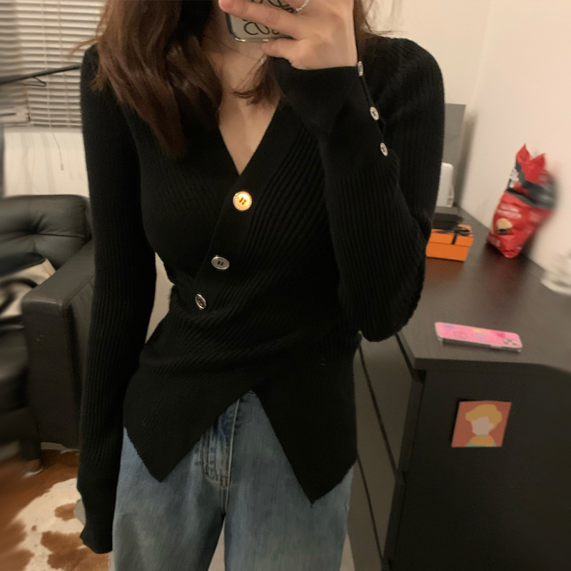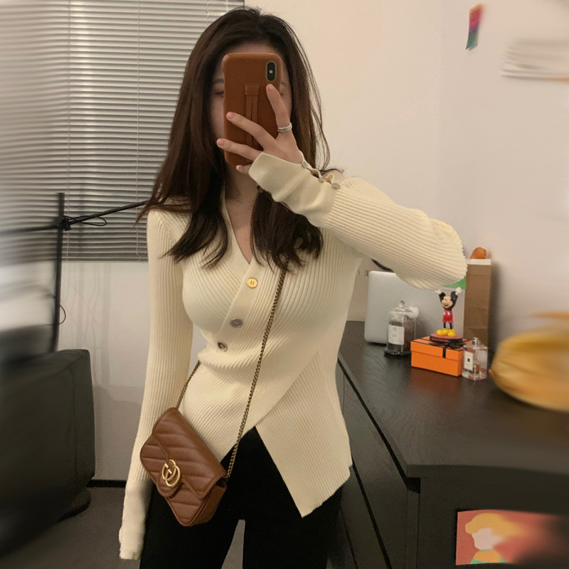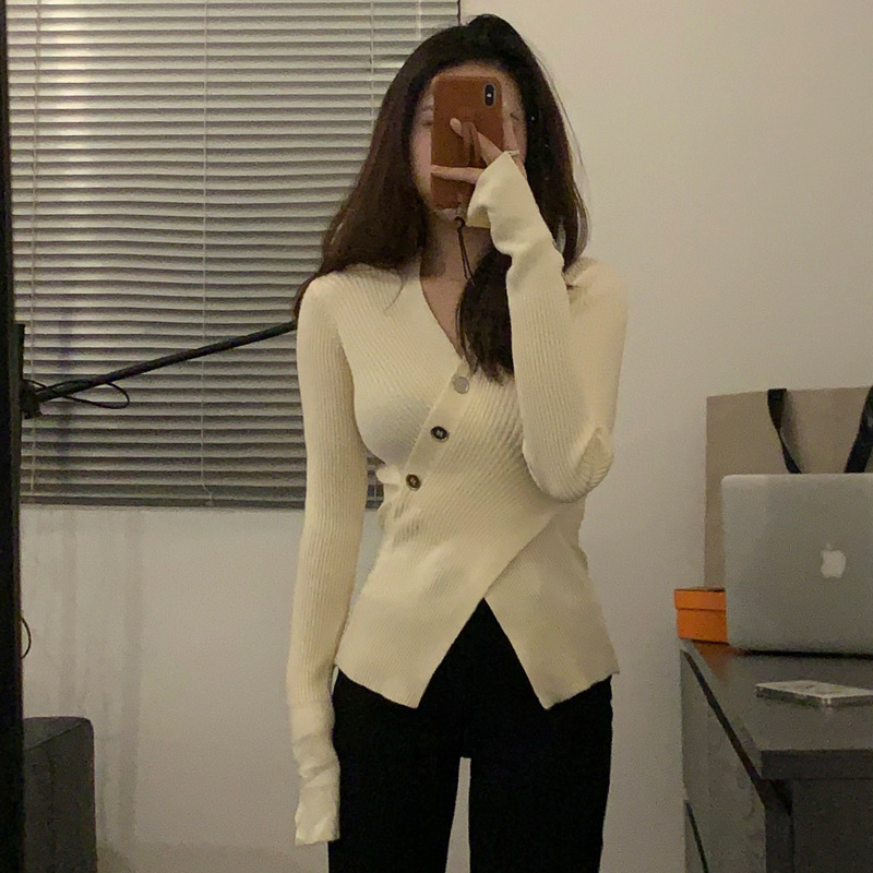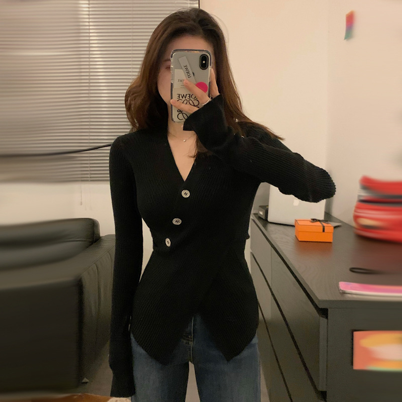 한국식 베이스 셔츠 여성용 이너웨어 아우터 착용 타이트 웨이스트 디자인 브이넥 탑 슬림핏 풀오버 스웨터 여성용 가을