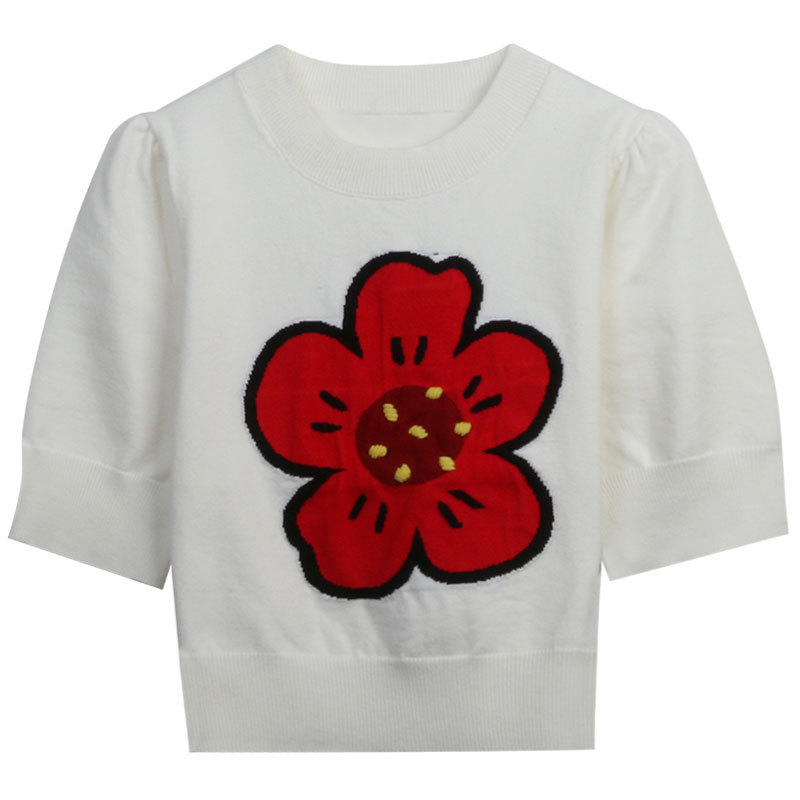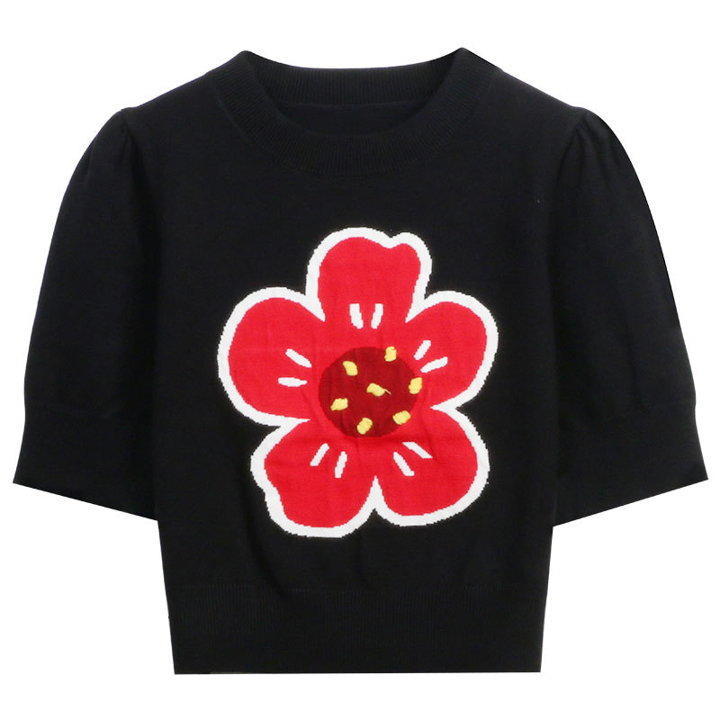 흑백 니트 봄 새로운 여성의 흑백 대비 색상 작은 홍화 자수 연령 감소 라운드 넥 짧은 소매 짧은 니트 스웨터